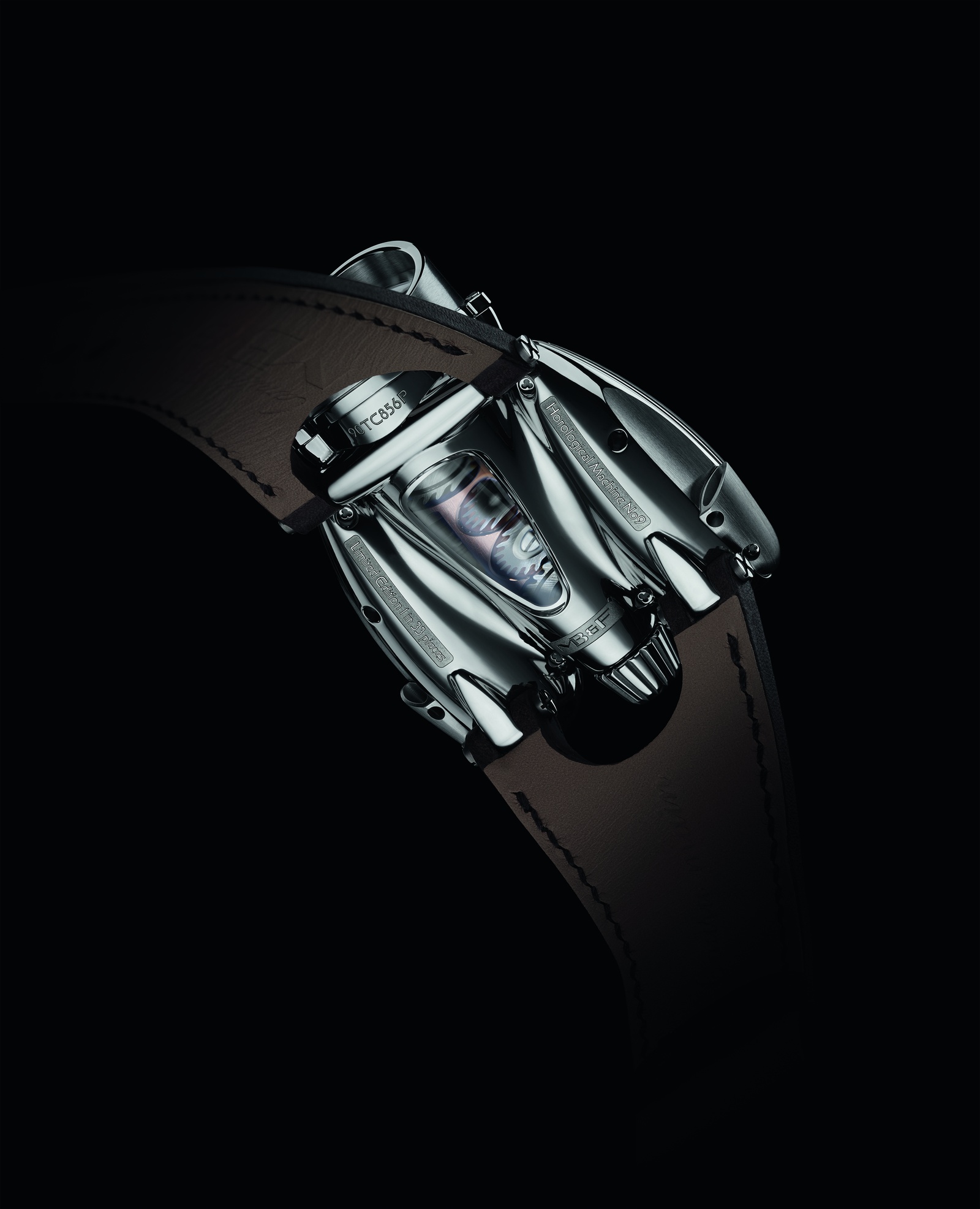 Sitting perpendicular to the rest of the HM9 engine is the dial indicating hours and minutes, driven by conical gears that ensure precise engagement even when motion is put through a 90° planar translation. The winding and setting crown is located on the rear of the central body, its deep fluting providing ergonomic grip as well as aesthetic coherence with the overall design.