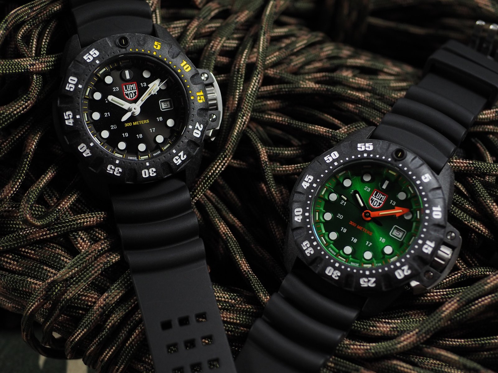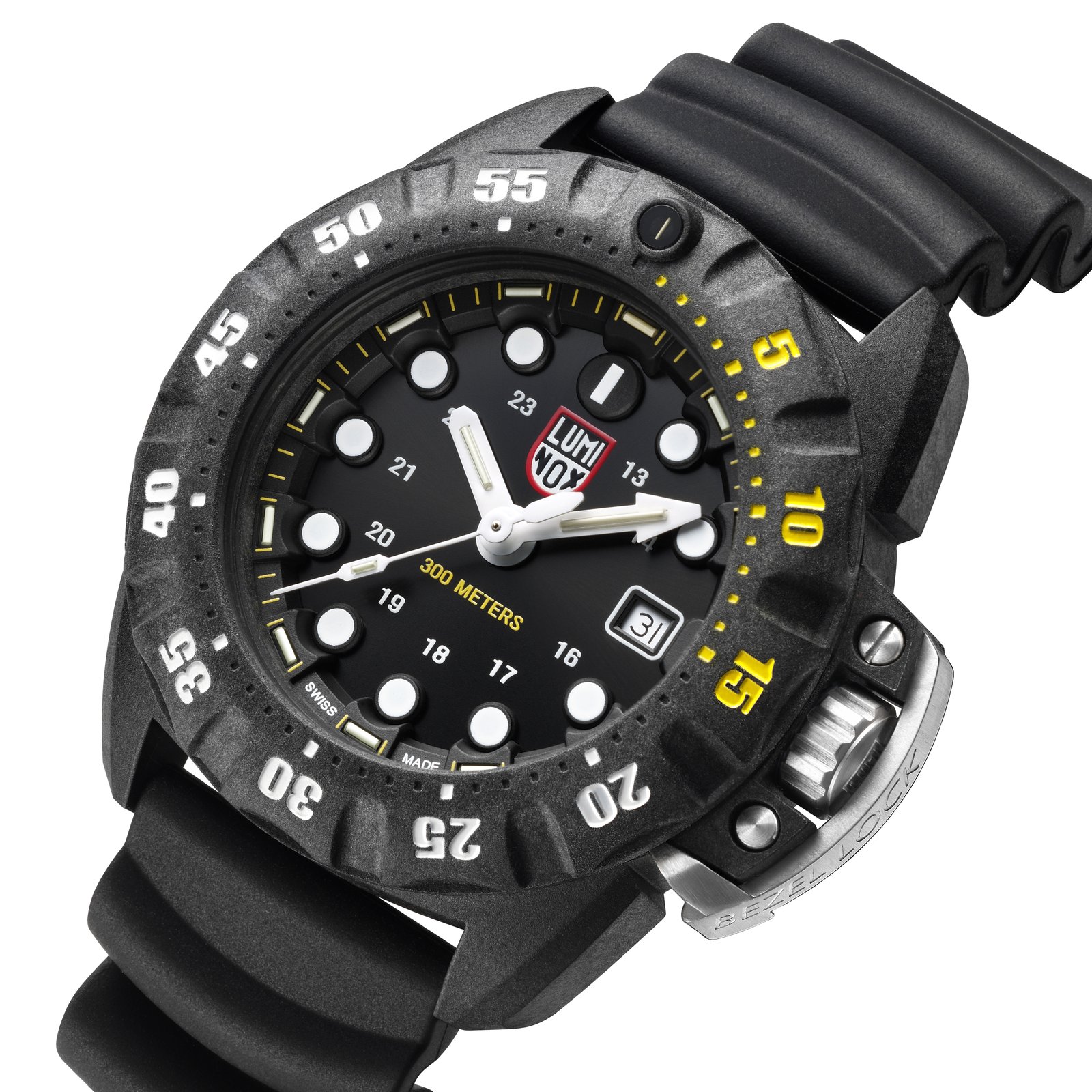 All four models in the Scott Cassell Deep Dive 1550 Series come in 46mm Carbonox™ cases. Carbonox™ is a carbon-based material exclusive to Luminox. The Scott Cassell Deep Dive 1550 Series are water resistant to 300 meters, a feat noteworthy when working on carbon as special gaskets and case designs mean that these watches can dive deeper and continue performing flawlessly in such extreme pressures.