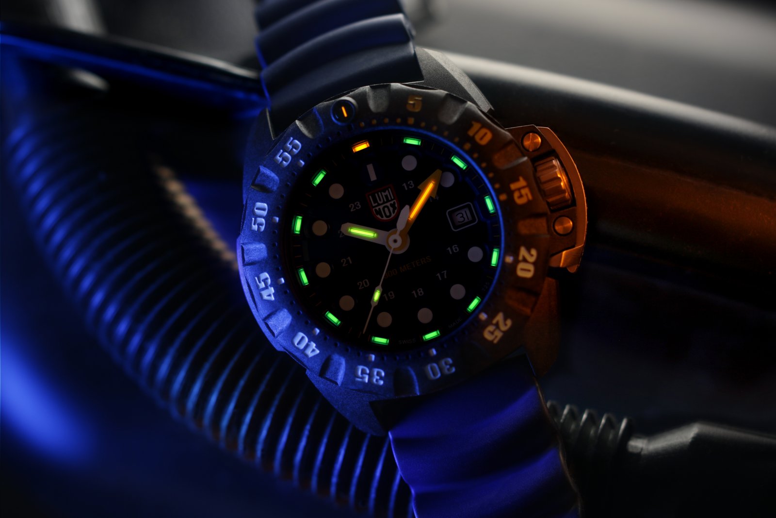 As with all Luminox watches, the Scott Cassell Deep Dive 1550 series uses the proprietary Luminox Lighting Technology (LLT), which guarantees unlimited night vision 24 hours a day for up to 25 years through their use of tritium gas tubes. Unlike other luminosity systems, which depend on external light sources to charge luminous paint or a pushbutton to illuminate the watch, the luminosity is built right into Luminox watches, ensuring that you will always be able to see the time, no matter the light condition. This is an important feature while diving as light penetrating through the water can be scarce and reading time underwater accurately can be a matter of life and death.