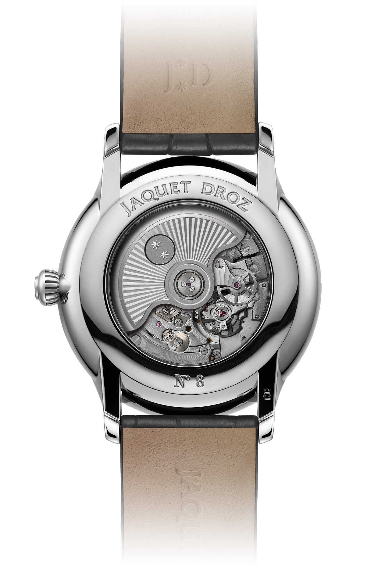 The two latest Grande Heure Minute watches are no exception. Each is housed in a 43 mm steel case and powered by a high precision self-winding movement: the Jaquet Droz 1169.Si calibre. “Si” refers here to silicon, a key element in contemporary watchmaking that is expertly put to use in this calibre. Hard-wearing, rust-proof, non-magnetic and unaffected by temperature fluctuations, silicon endows the balance spring and pallet lugs with stellar longevity and astronomical precision. Thanks to a 68-hour power reserve this performance can be maintained for almost three days.