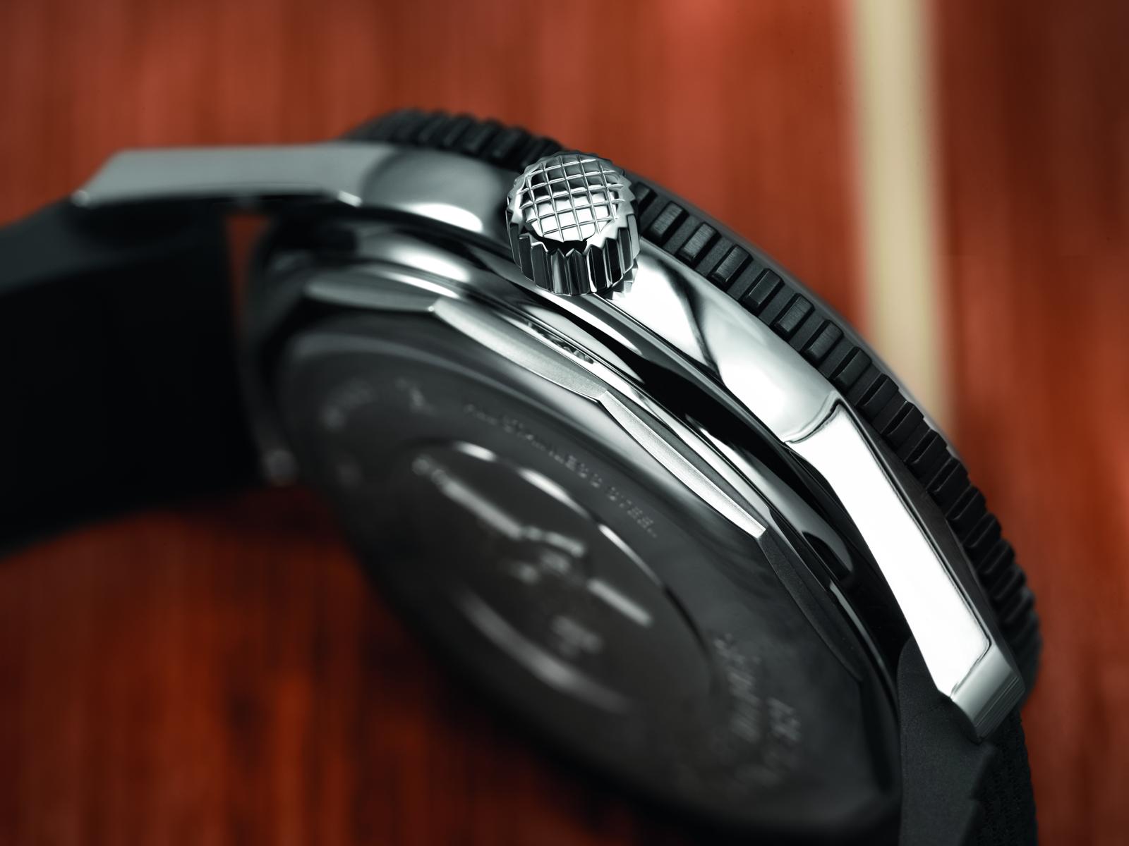 markers, including a luminescent triangle, which serves as the main indicator for calculating immersion time. Its grained black dial, topped with domed sapphire crystal, features indexes, Arabic