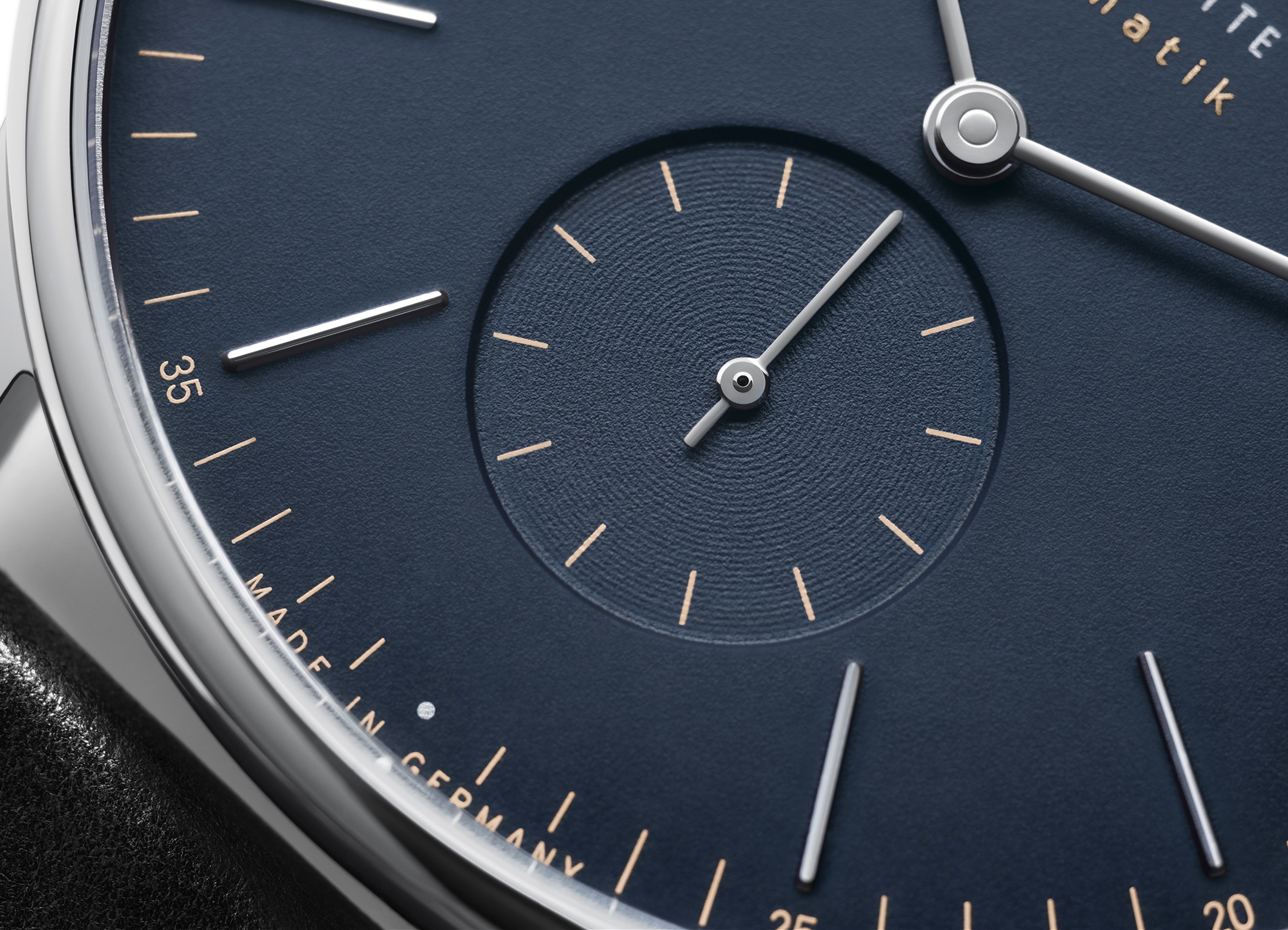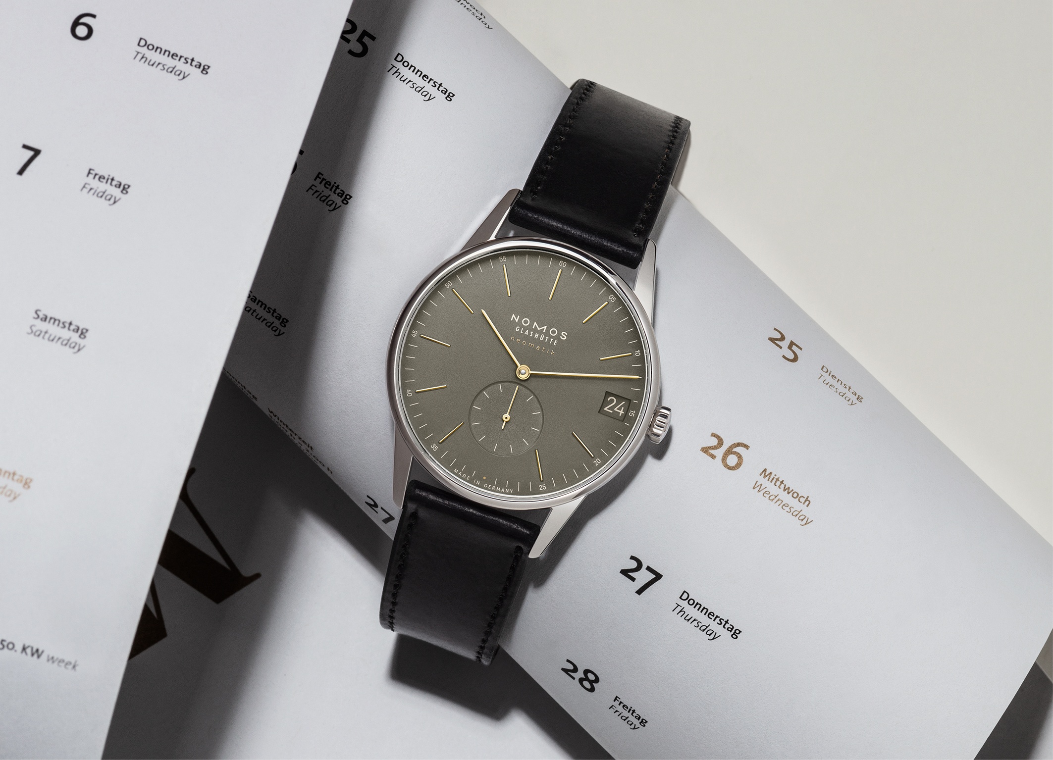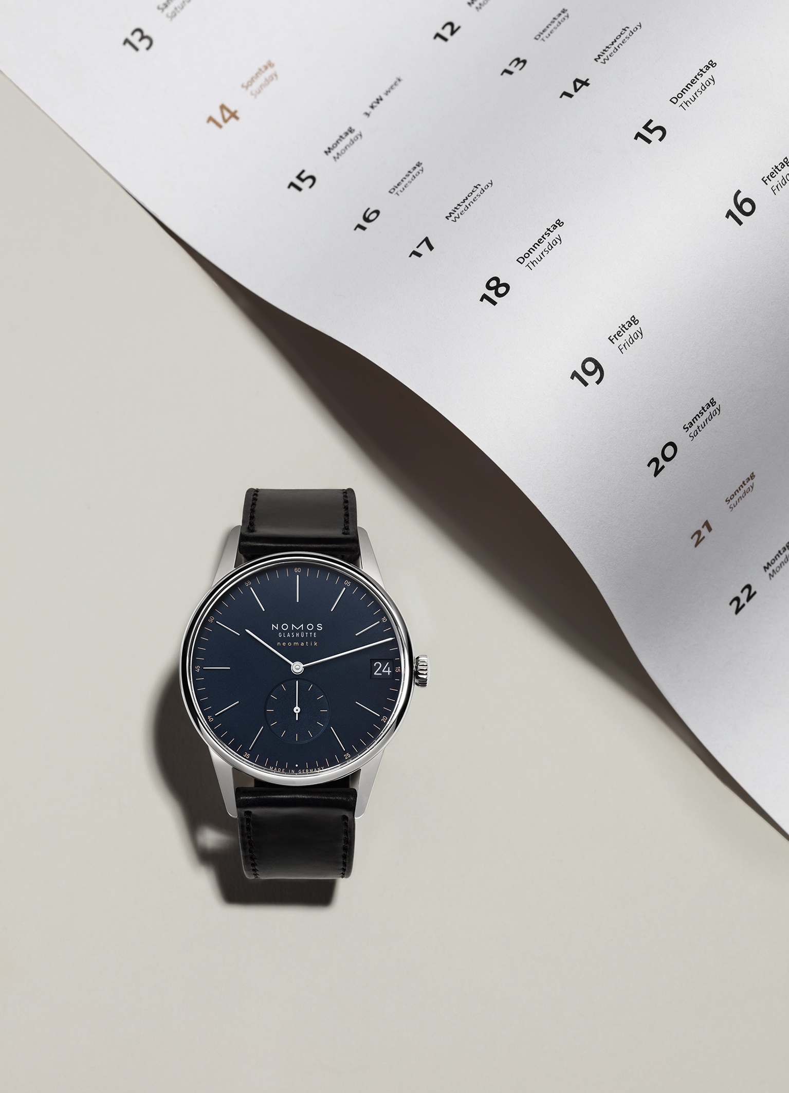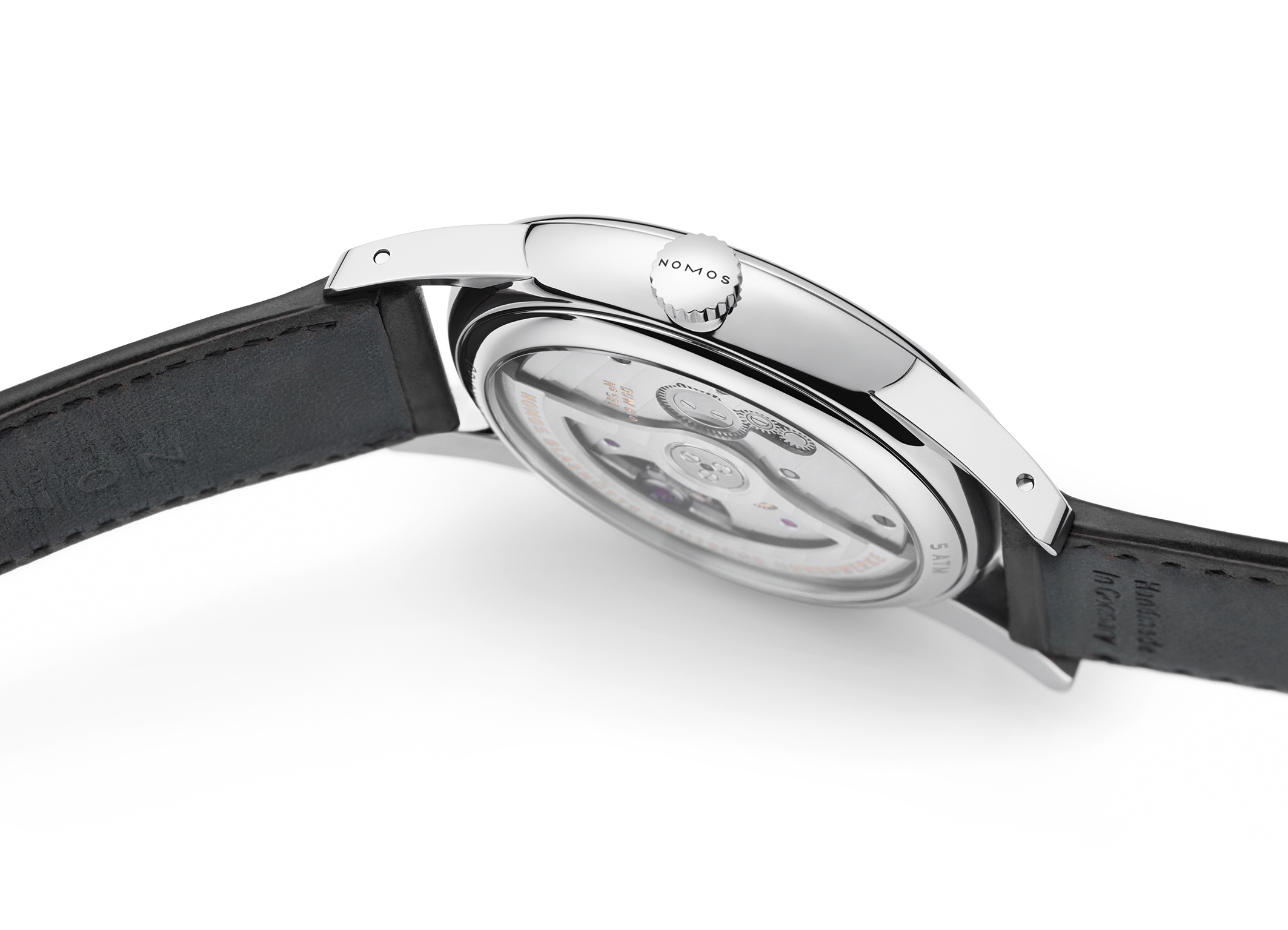 In all NOMOS calibres, the date ring is placed around the movement. In Neomatik date, this calibre is particularly large. The first Neomatikcalibrer with a date mechanism, it remains wonderfully slender. The date display can be made even clearer and is particularly legible.