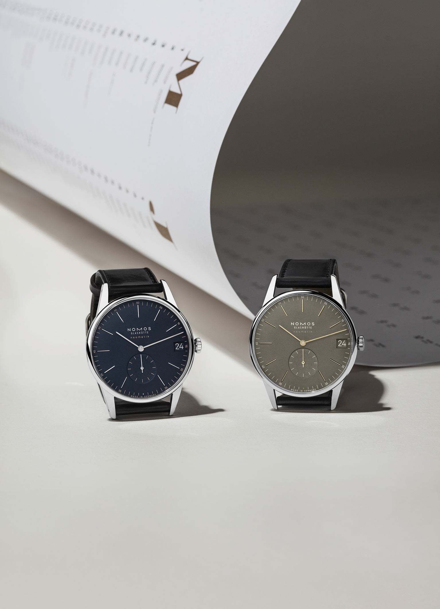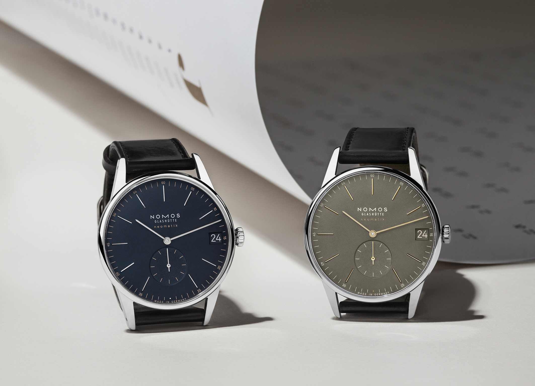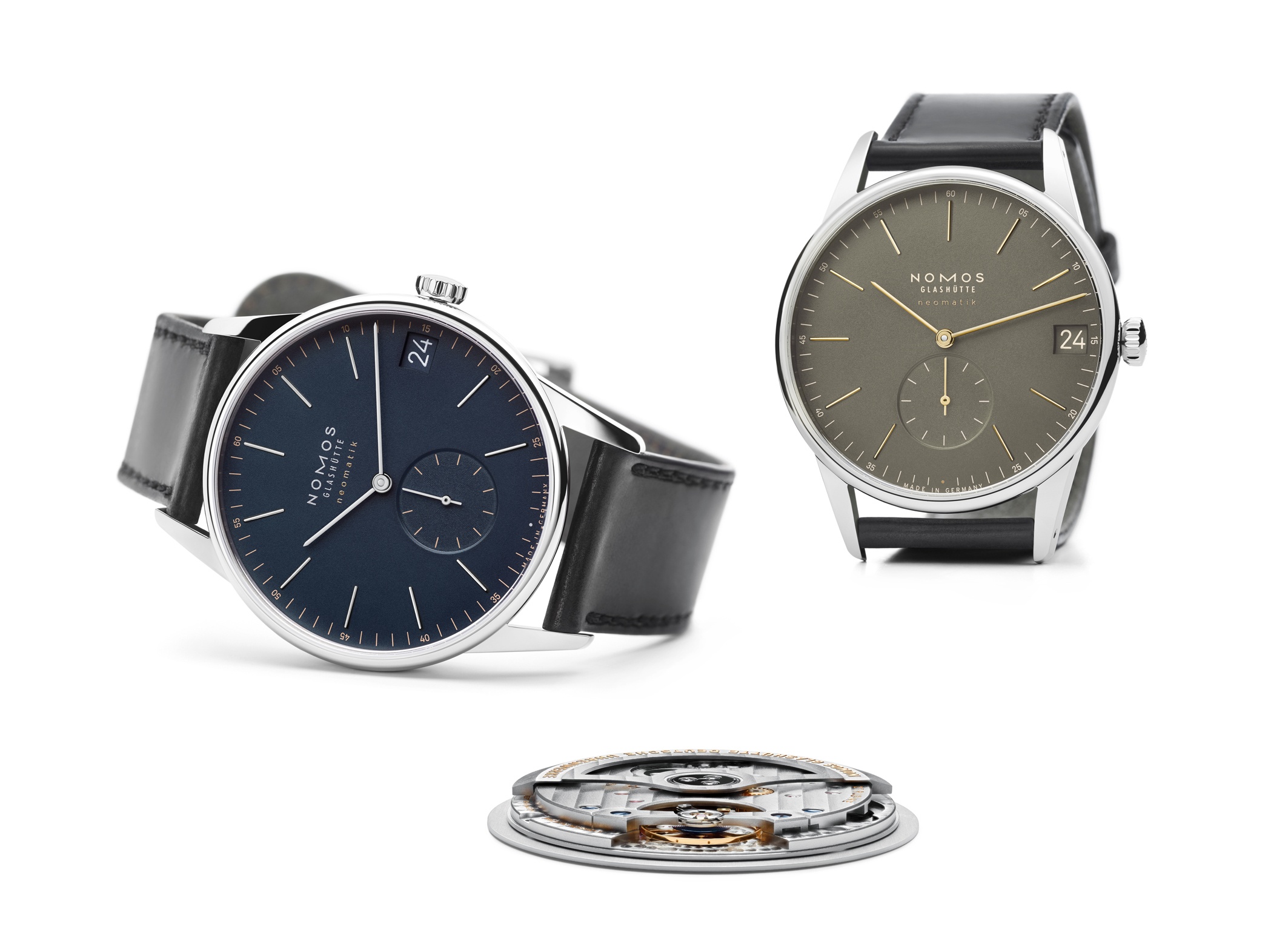 Nomos Orion Neomatik 41 in new colours: olive gold and midnight blue