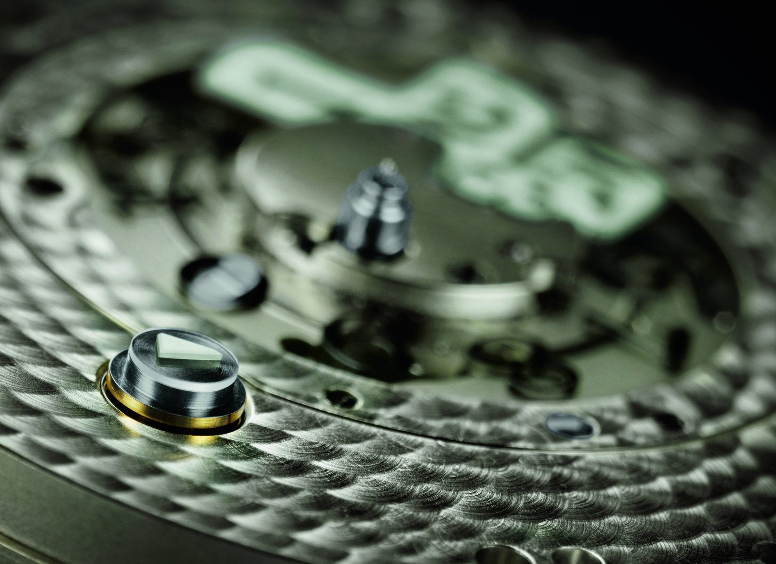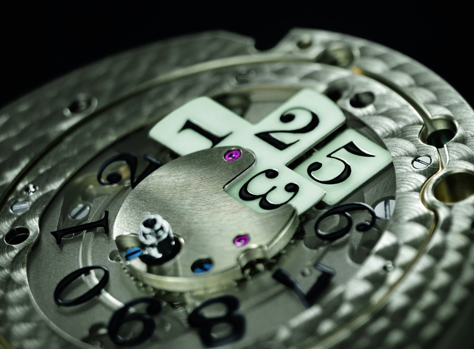 But the real stunner is the luminous outsize date. Composed of two separate display elements, the outsize date is designed to glow immediately after the midnight switching sequence as well. This is made possible with a luminous tens cross and a black printed units disc made of transparent glass which rotates above a luminous background. Both elements must be able to recharge during the day when they are positioned beneath the dial. This is enabled by the semi-transparent dial; even during the day, it endows the watch with inimitable aesthetic appeal. Its coating not only assures crisp legibility in daylight but also allows the luminous compound on the tens cross to be recharged. When exposed to light, the outsize date mechanism is clearly visible. Thus, the switching action of the date display at midnight can be observed in detail in ambient light.