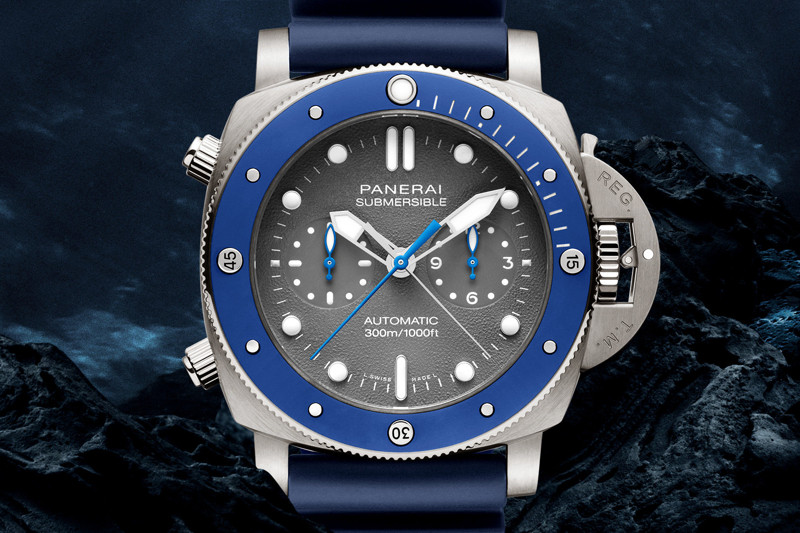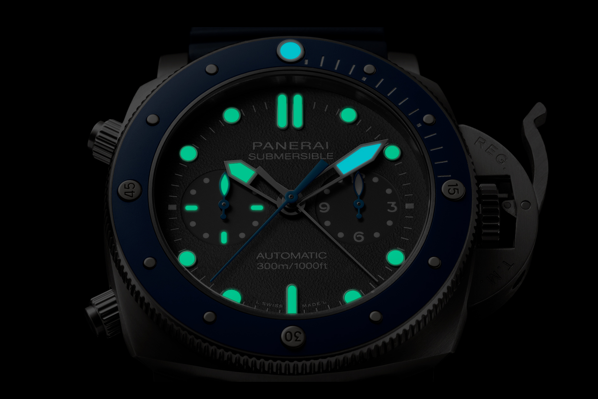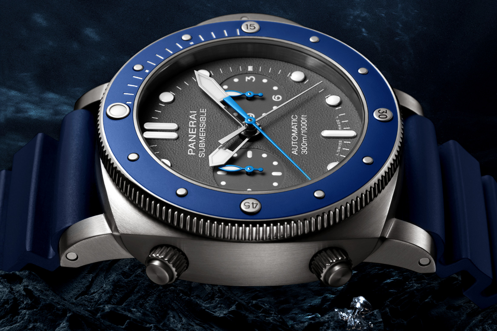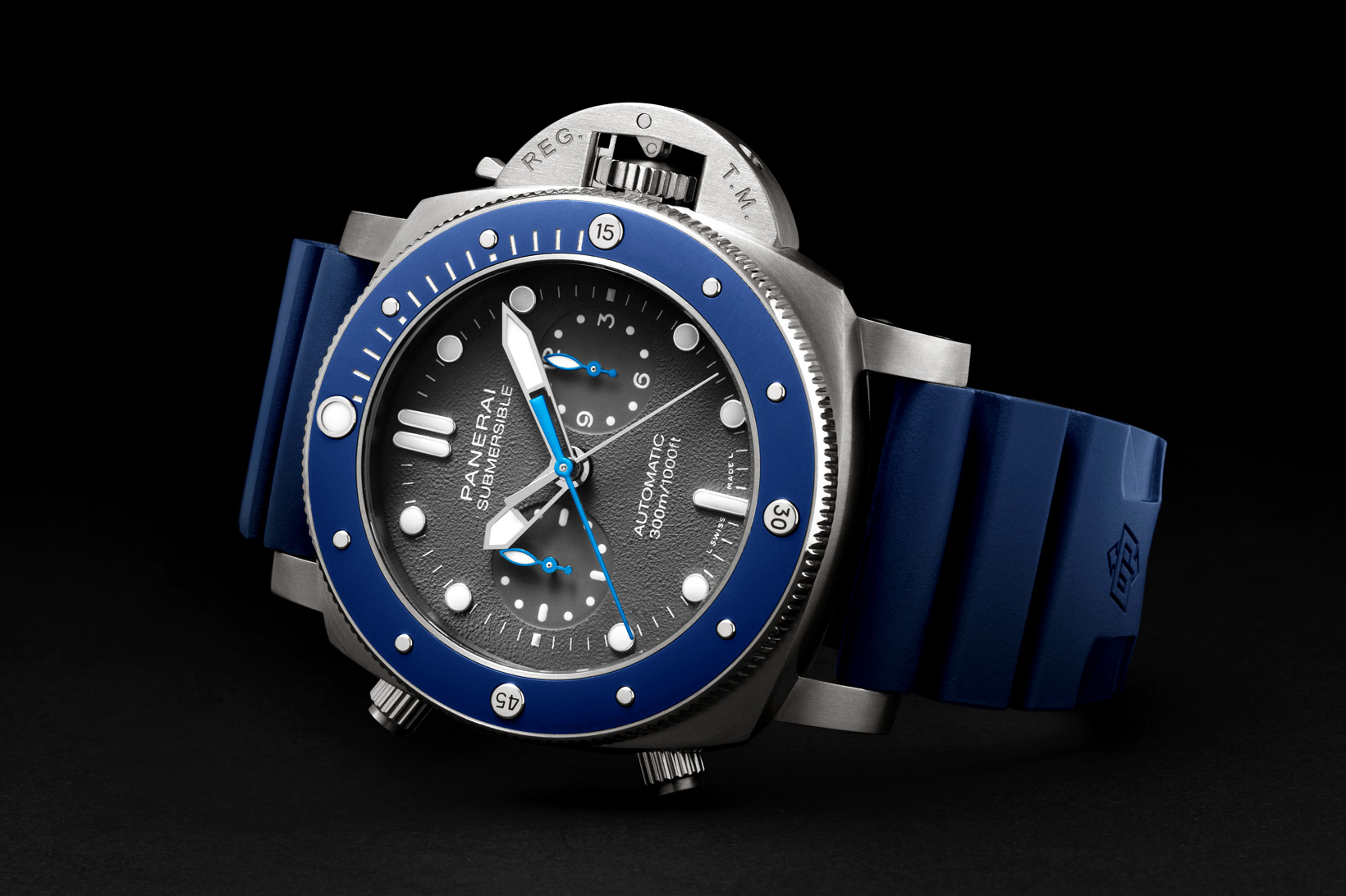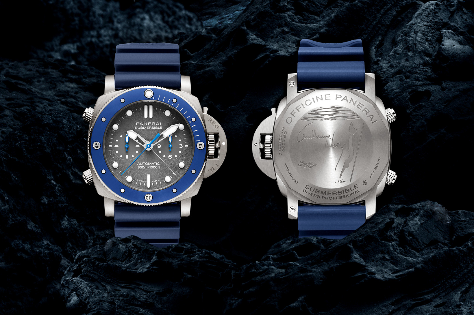 Out of the water the watch – light and appealing, thanks to the titanium case that perfectly matches with the blue of the ceramic bezel and the rubber strap – is also a chronograph with Flyback function for a perfect synchronization with an external signal. The automatic calibre P.9100 of the Submersible Chrono – Guillaume Néry edition, with 3-day power reserve, is entirely developed in the high-end watchmaking Manufacture in Neuchâtel, the Laboratorio di Idee, where the boldness and precision of Panerai watchmakers transform every project into an innovative wild creation with exceptional technical performances.