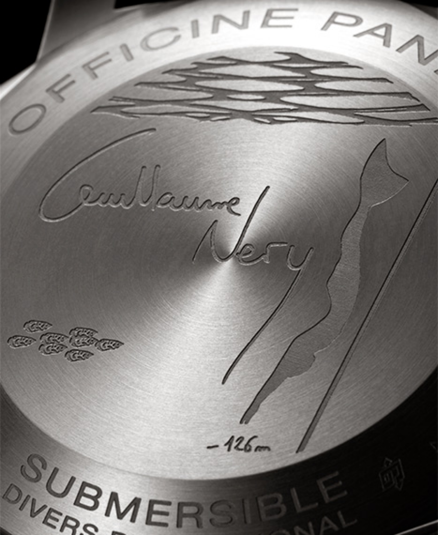 The Panerai Submersible Chrono – Guillaume Néry edition is mainly a professional submersible watch, water resistant up to a depth of 300 meters (30 bar) and equipped with a rotating bezel to calculate the duration of a dive. The dial is exceptionally readable in all conditions of light and darkness, thanks to a combination of white and blue luminescent indices that stand out very well against the grey background. The case is engraved with the signature of the champion and an image that recalls his latest breathtaking record: a depth of 126 meters reached with only one breath.