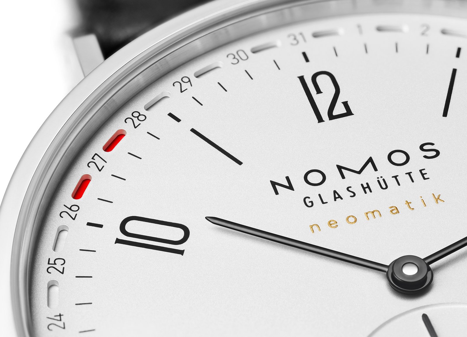 The date ring was placed very far out around the work and makes a brand new date display possible: two red markings frame the respective date. Not “Swiss made”, instead, the finest German craftsmanship – and highly innovative German engineering. Two patents have been registered for this calibre.