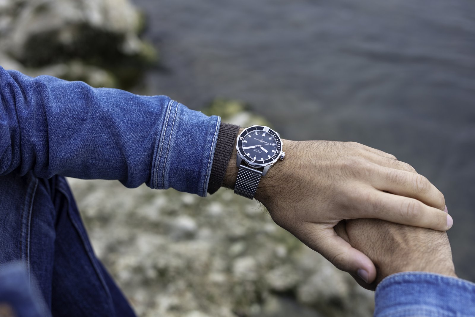 All the essential diver codes are here: Superluminova on the 0, hands, and a rotating bezel for at-a-glance readability from the murkiest depths; and water resistance to 300 meters. The classic mid-20th-century diver’s watch aesthetics are fully backed by 21st-century silicium, a technology first introduced to watchmaking by Ulysse Nardin. Slim enough to fit snugly under a shirt, they come with stylish strap options: blue fabric, black veal, three-row stainless-steel or, in a first for Ulysse Nardin, a stainless-steel Milanese mesh bracelet.