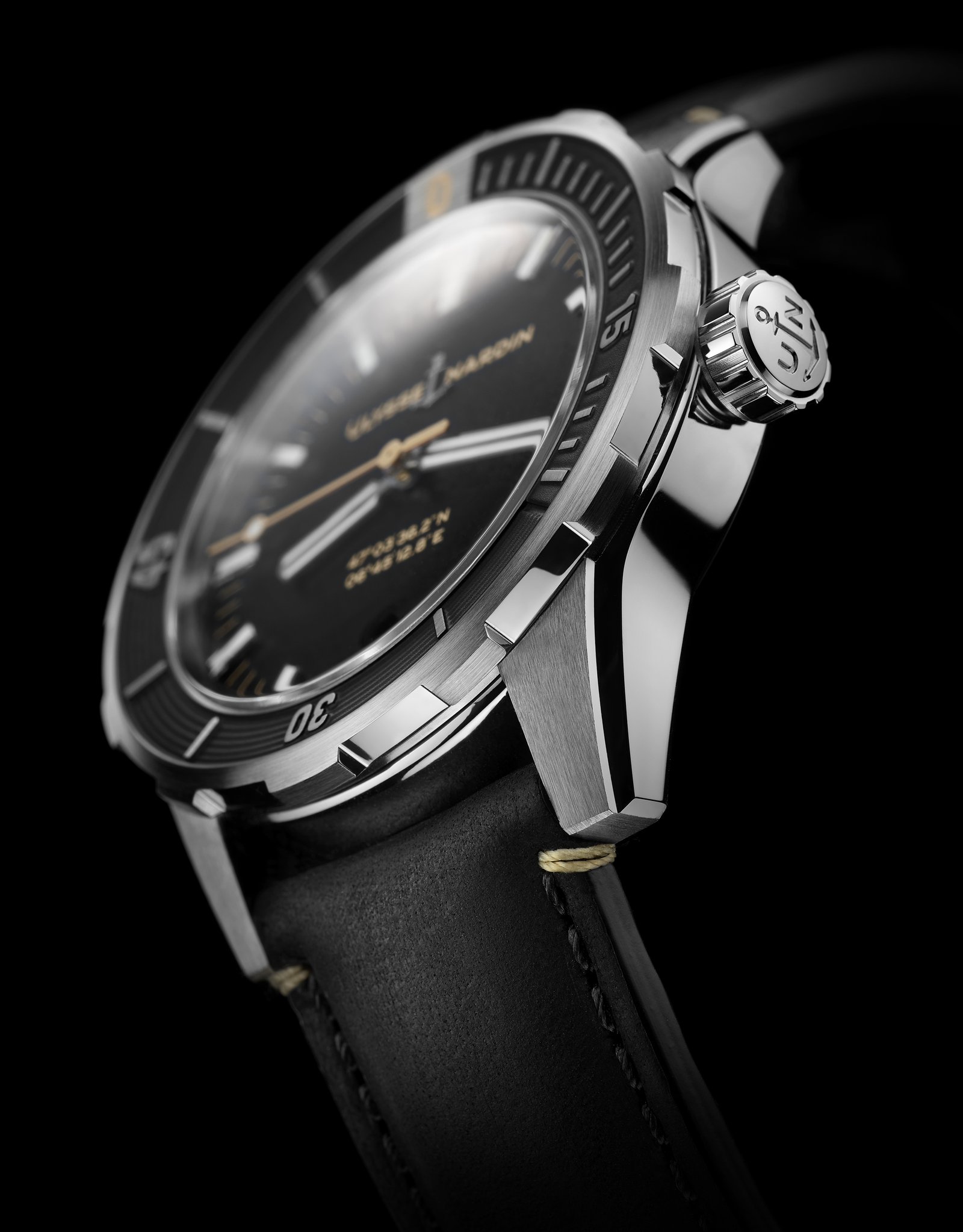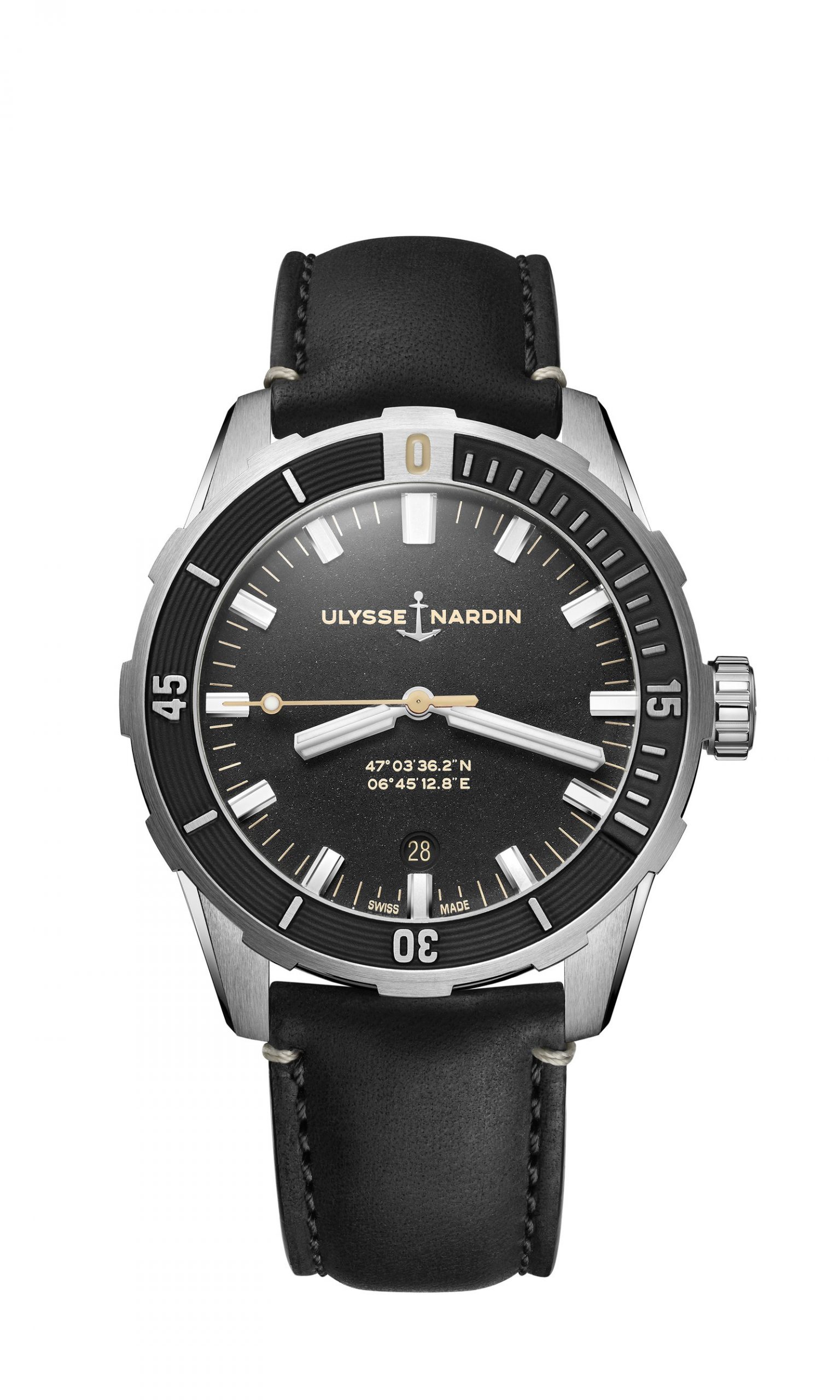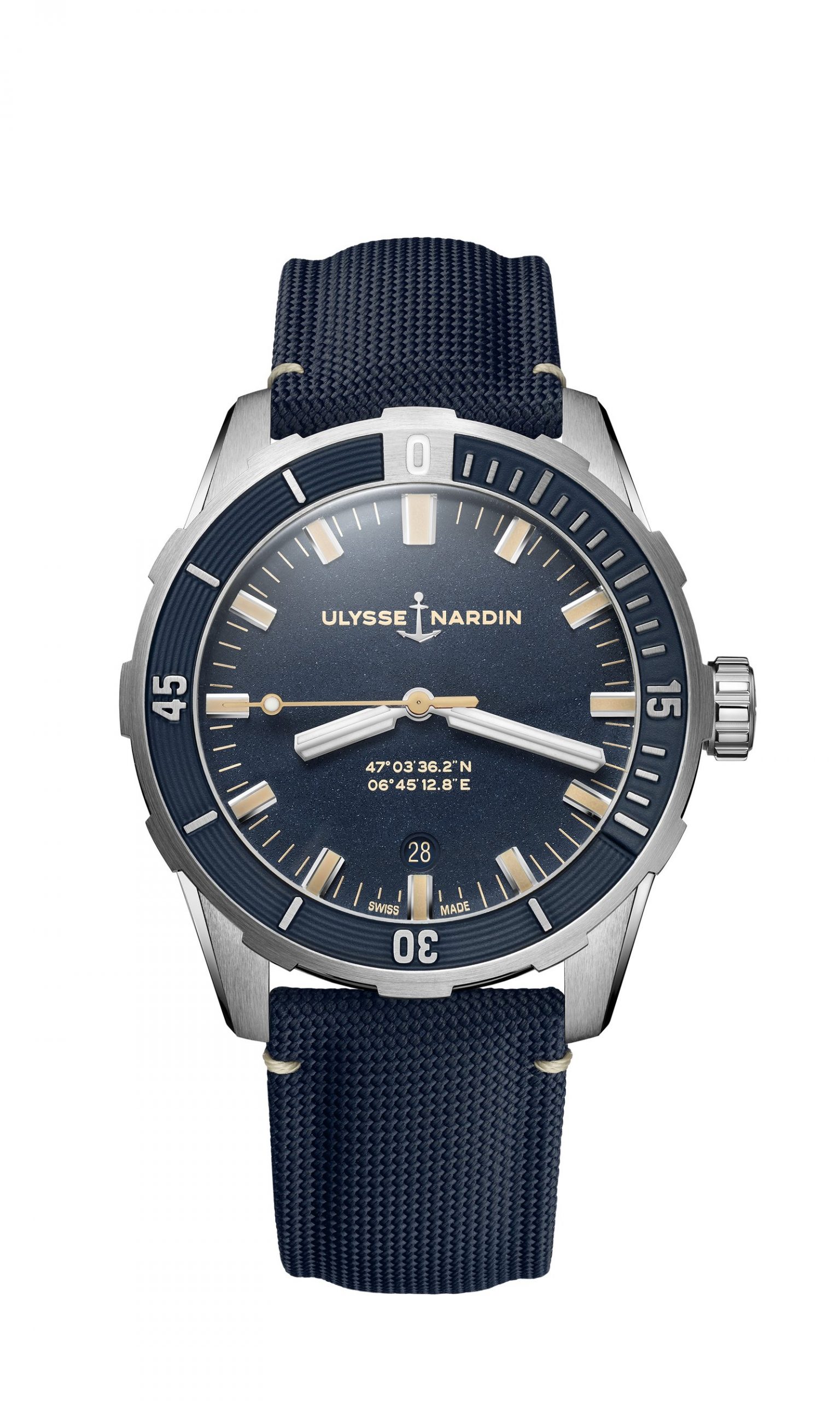 The new Diver 42mm “three-hand” fleet reinforces the relaunch of the Ulysse Nardin Diver Chronometer Collection. The concave bezel and domed sapphire glass are the same as on the 44mm models launched in September, but the timepieces now have a new, unexpected vintage look, with an uncluttered dial design, touches of retro beige, and a central second instead of a small second counter. The inspiration clearly comes from the house’s 1964 dive watch, the “Diver Le Locle”. The GPS coordinates of Le Locle, the Manufacture’s hometown since 1846, adorn the dial.