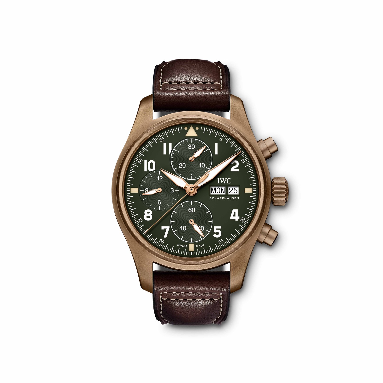 The bronze case, the olive green dial and the brown calf leather strap give this chronograph a unique character. Over time, the bronze develops a special patina, making each and every watch a unique piece.