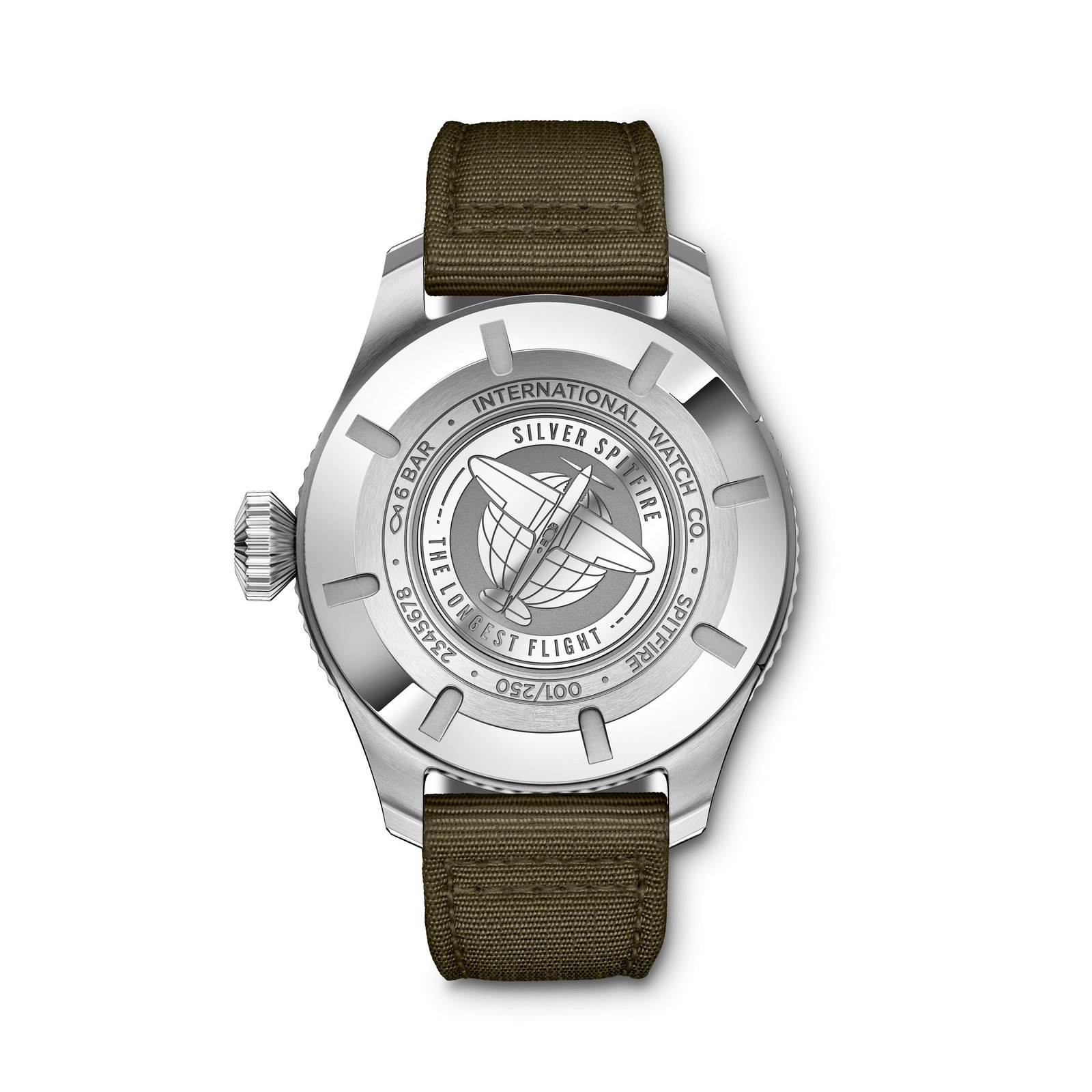 This special edition is dedicated to the “Silver Spitfire – The Longest Flight” project. It has been specially developed for pilots Steve Boultbee Brooks and Matt Jones to coincide with their flight around the world in a Spitfire. The colour scheme of the watch design, with its stainless steel case, its black dial and its green textile strap, is reminiscent of the cockpit of a Spitfire.
