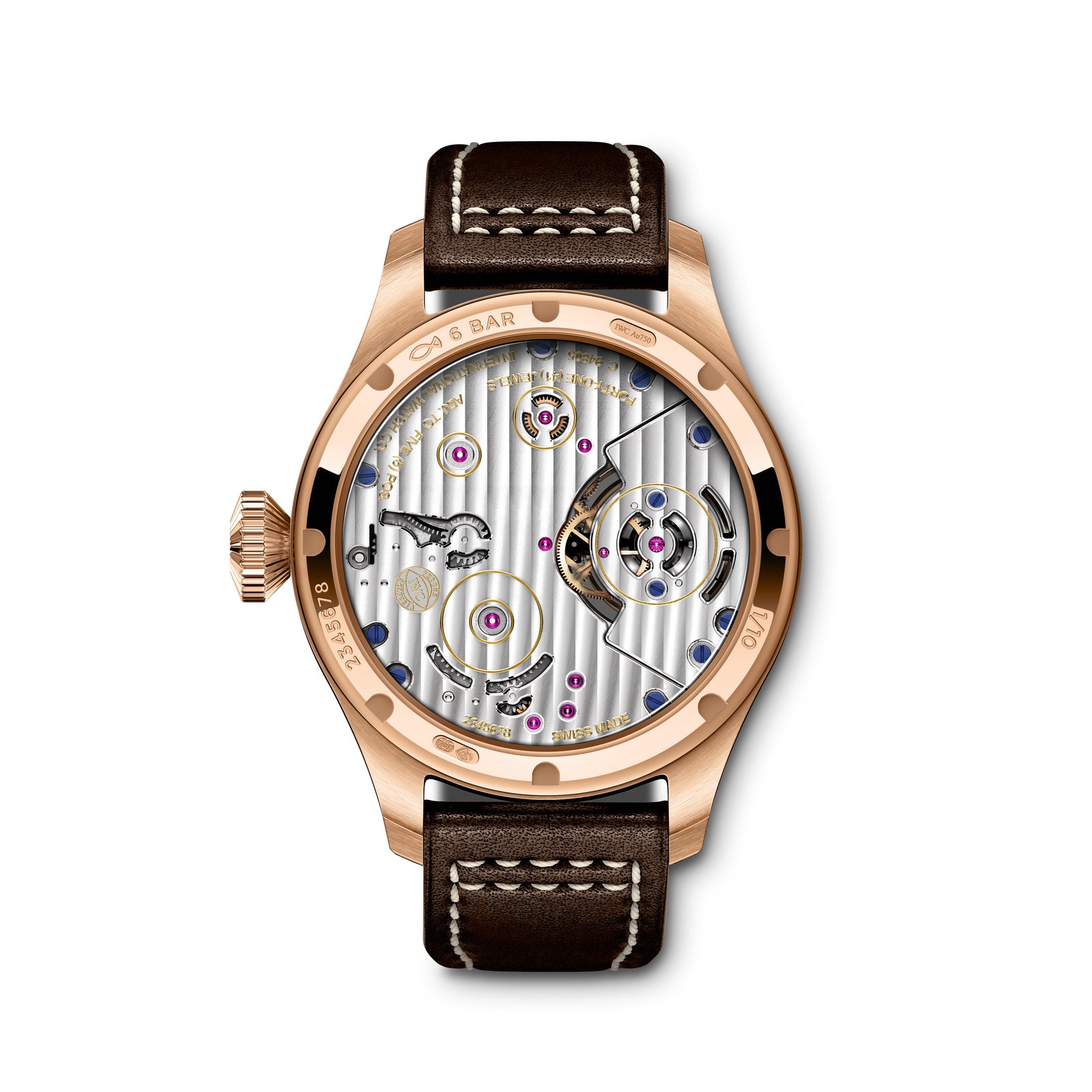 This is the first time IWC has produced a watch with hard gold, a special new version of red gold. The microstructure of the alloy is modified in a sophisticated manufacturing process. Hard gold is therefore significantly harder and around 5 to 10 times more wear-resistant than conventional red gold. As a result, the material is perfectly suited to the large case and the crown of a Big Pilot’s Watch.