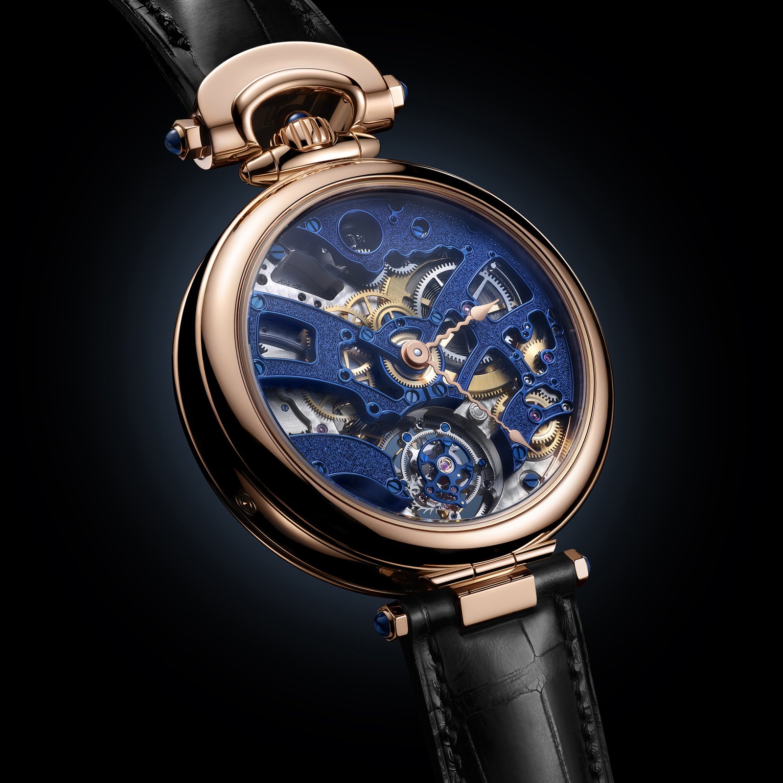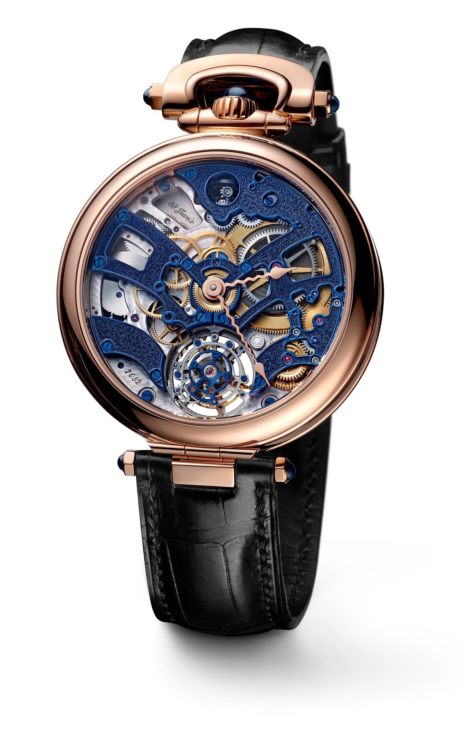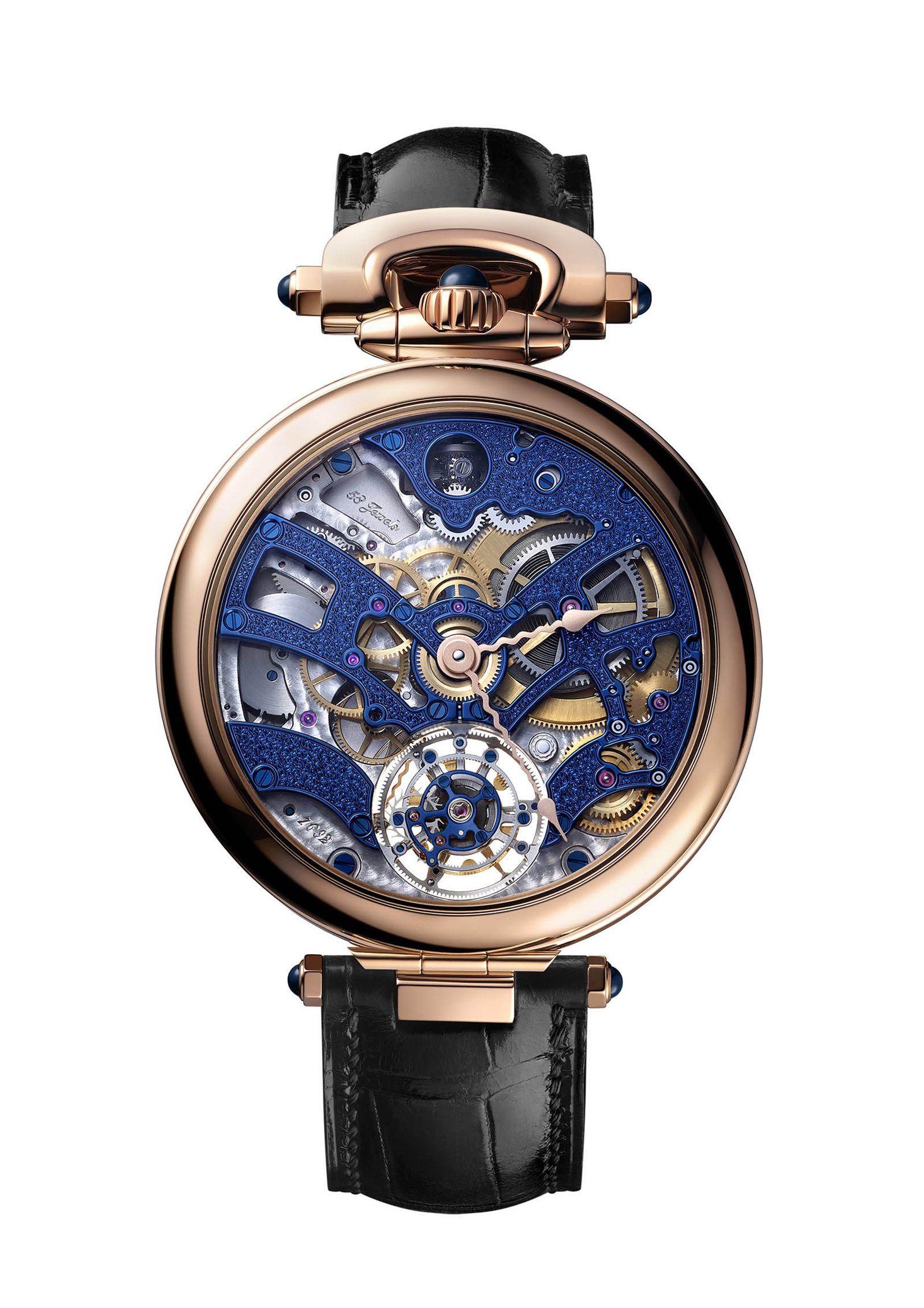 The timepiece boasts an entirely new face on the reverse side. Though no dial is present, the hours and minutes are centred directly over the complex movement. The openwork bridges evoke the iconic architecture of 19th-century BOVET movements, each surface engraved with a sparkling “bris de verre” motif. Once engraved, chamfered, and entirely decorated, the bridges are coated with a blue CVD treatment, which contrasts beautifully with the rhodium plate. This colour combination was a favourite of the Bovet brothers usually employed on mirror-finished or finely engraved surfaces.