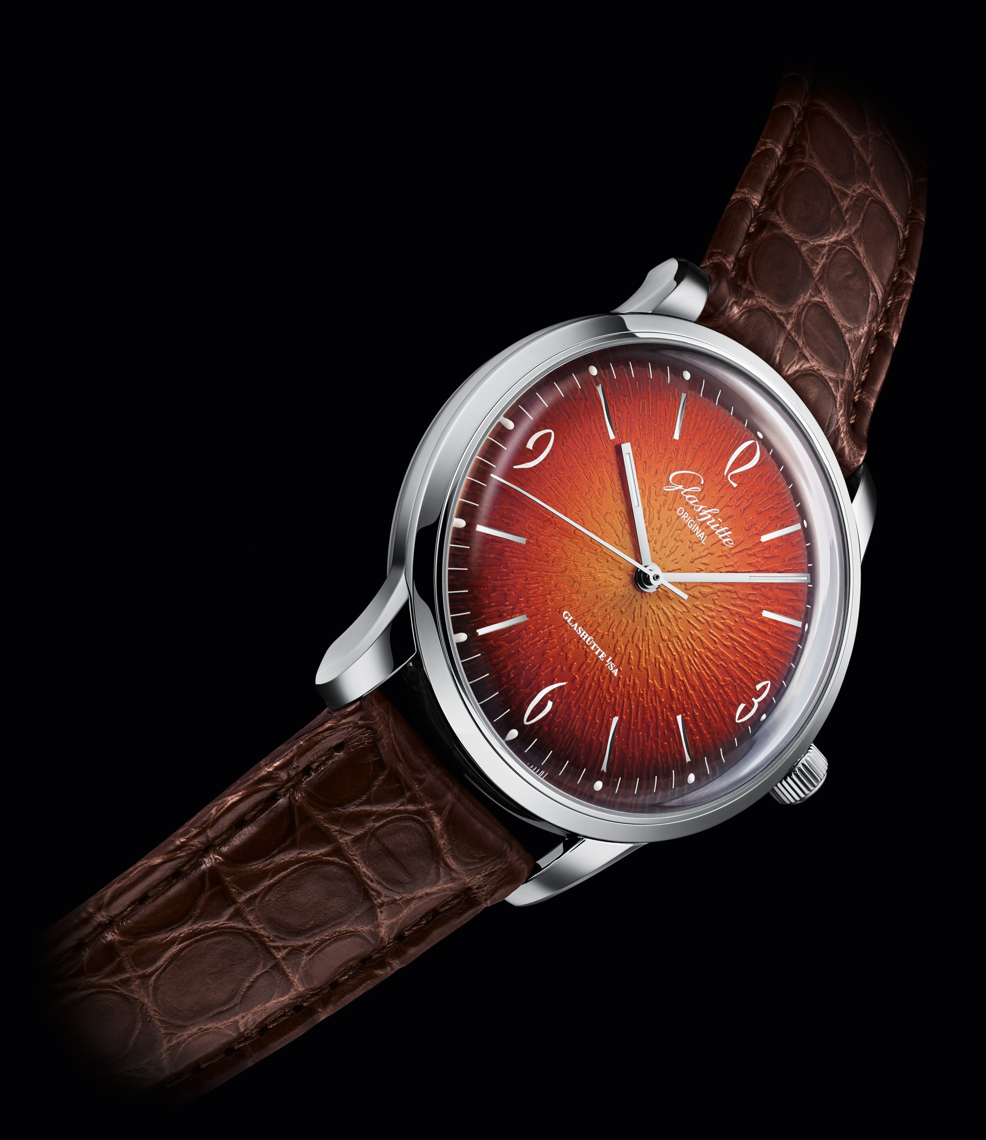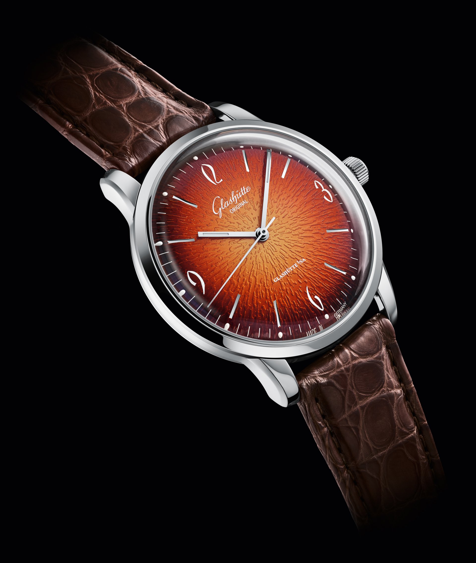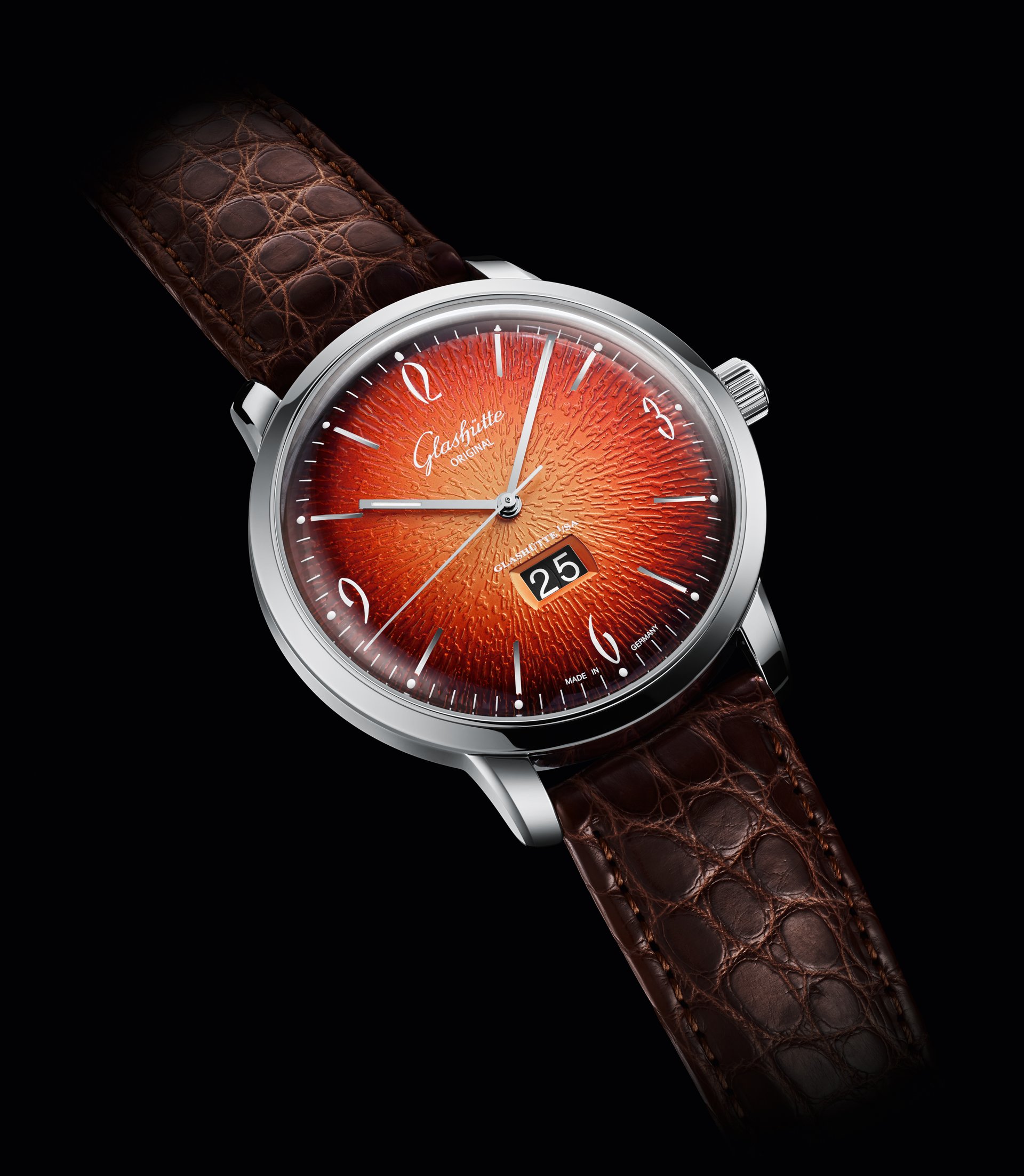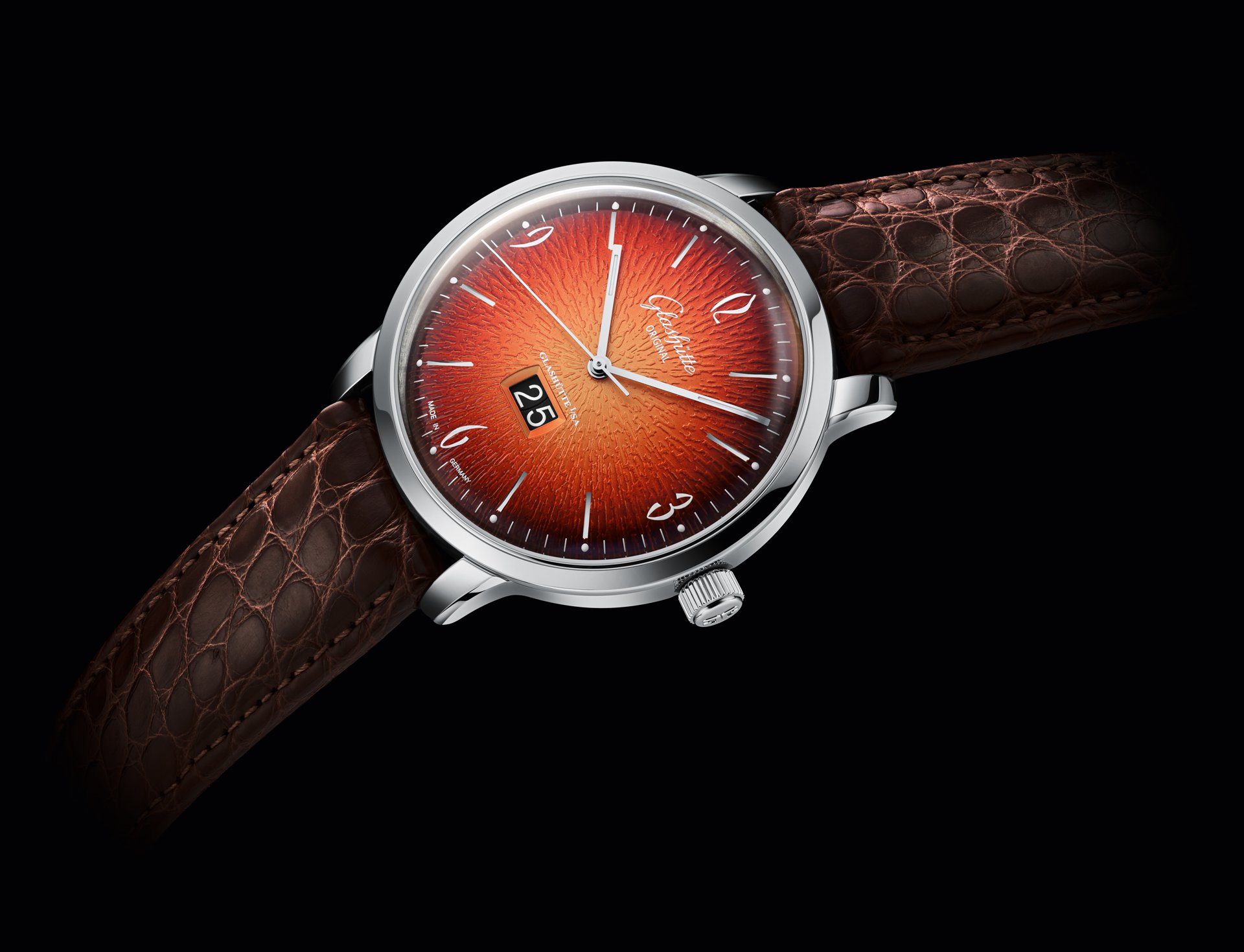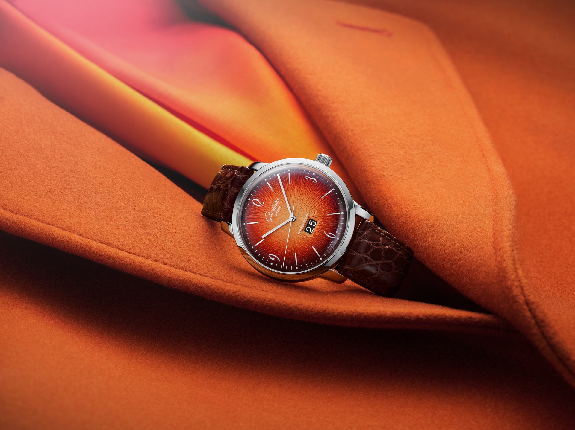 Idiosyncratic and yet stylish this holds true not just for the details but for the dial as a whole. Starting from a golden yellow at the centre, the colour flows across the curved surface, changing to fiery orange and red before reaching the black perimeter. The result is luminous vivacity, warmth and energy. Credit for this impressive ensemble of different hues also known as the dégradé effect goes to the experts at Glashütte own dial manufactory in Pforzheim.