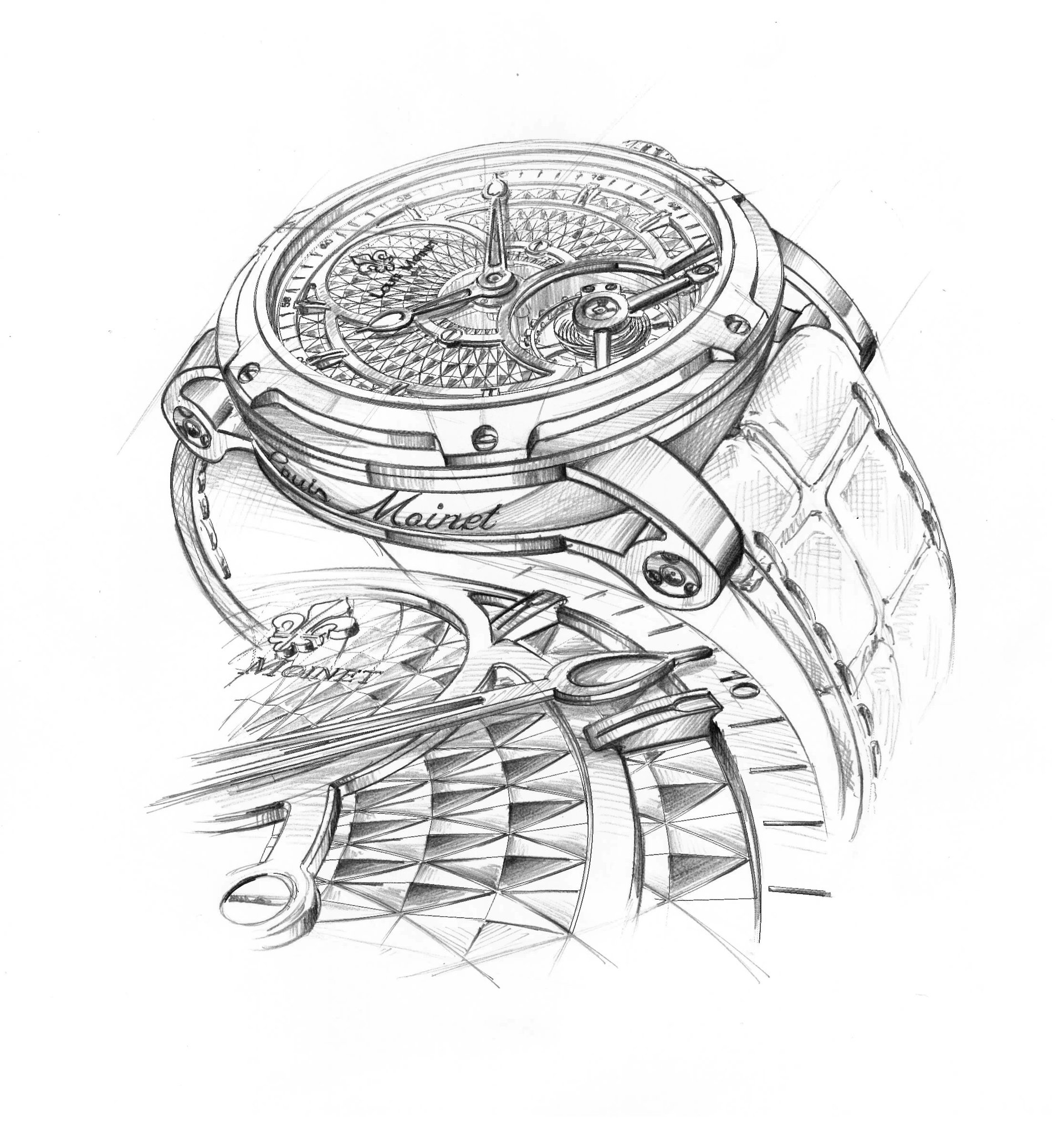 The alligator strap comes with a folding clasp, emblazoned with Louis Moinet’s characteristic Fleur de Lys symbol.