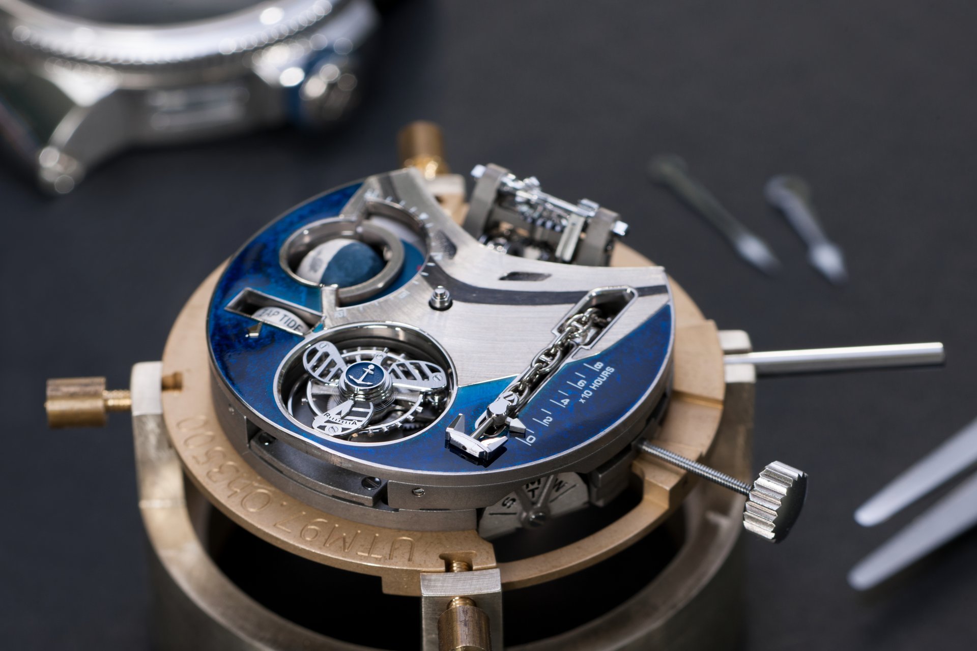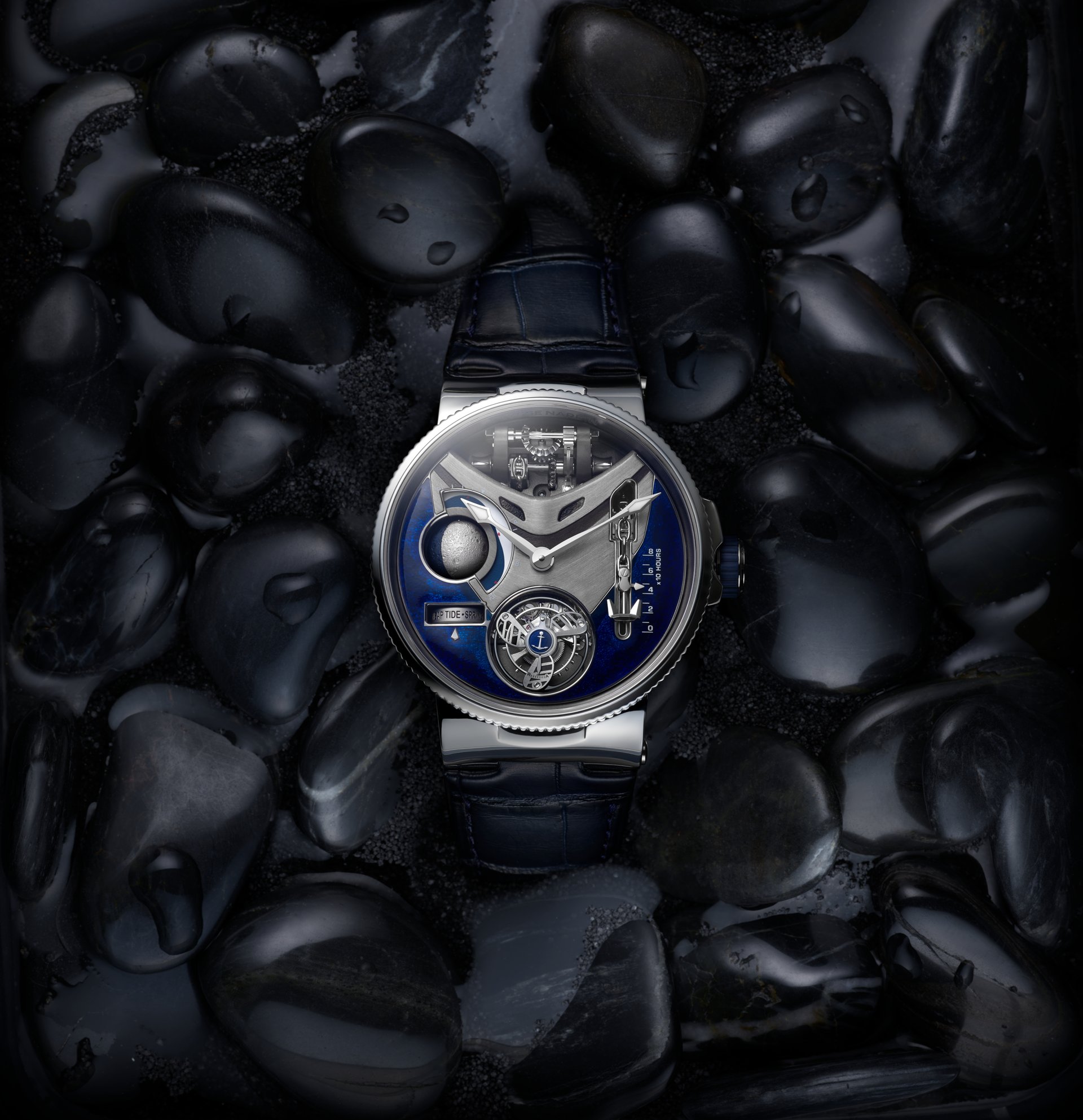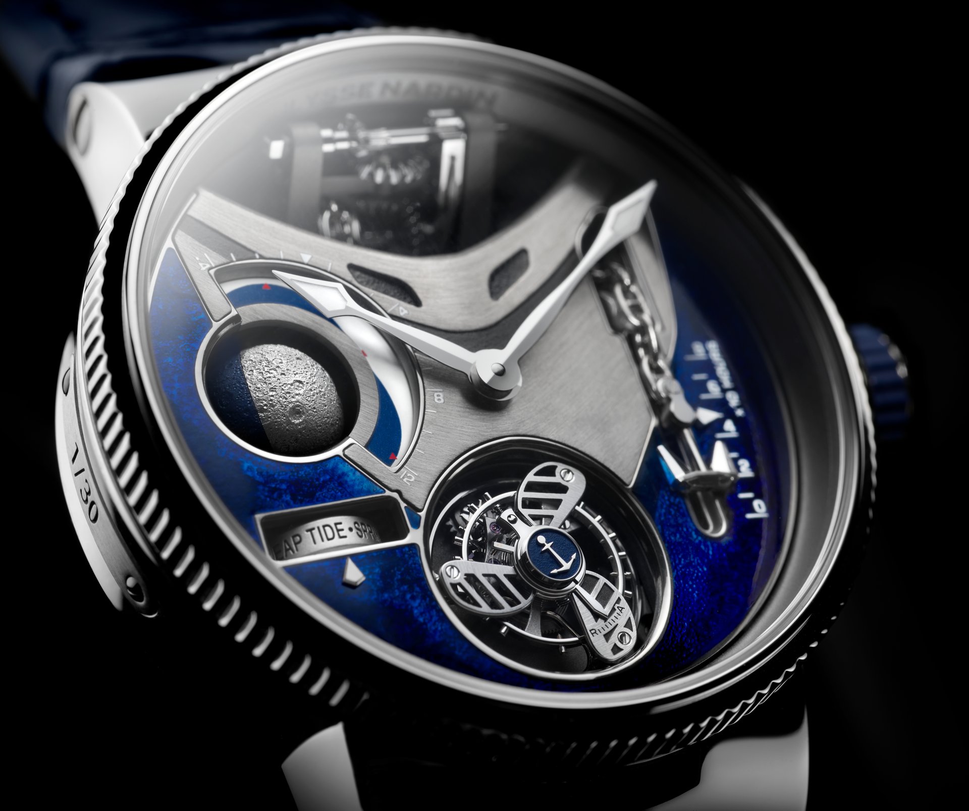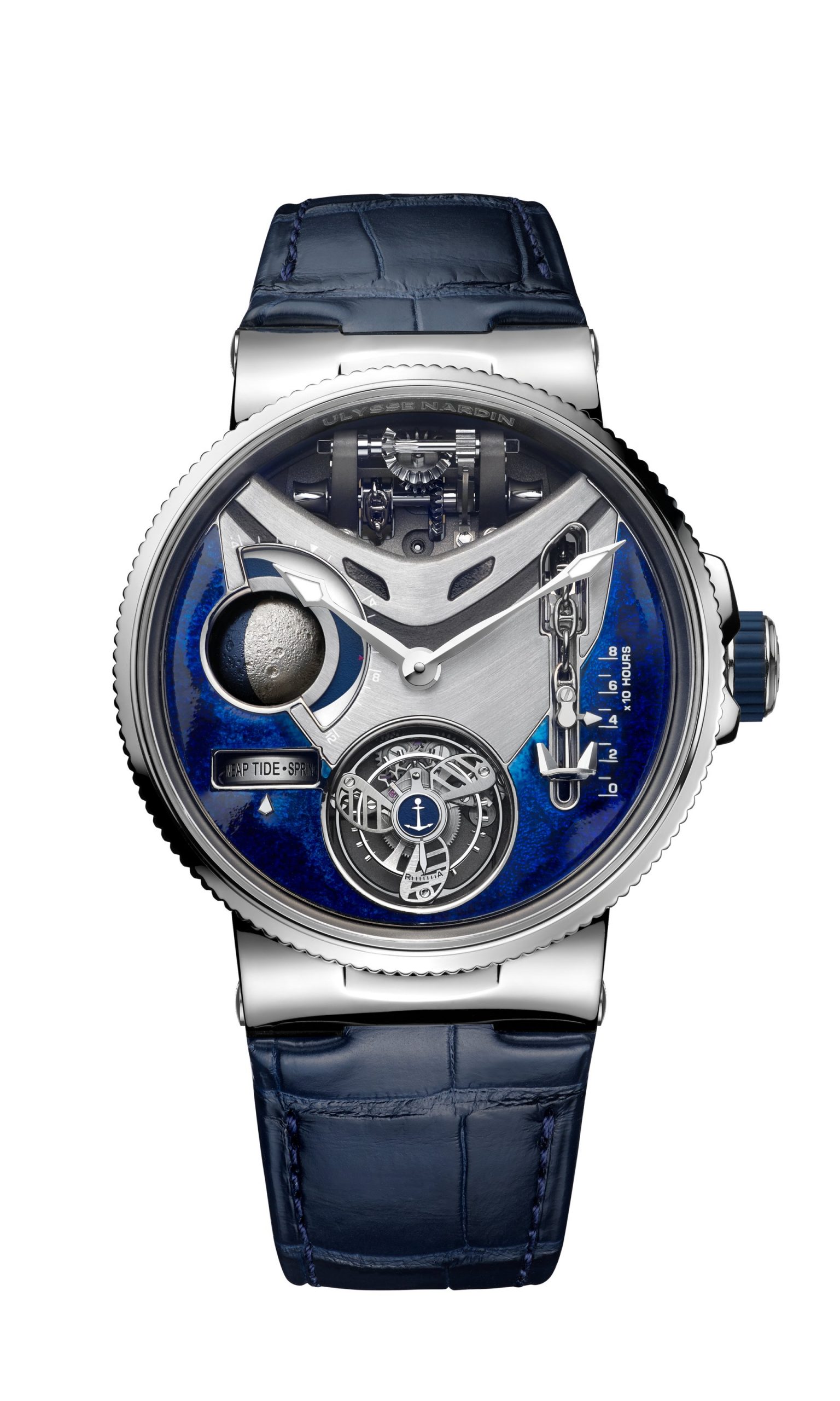 This powerful beating heart of the watch has a diameter of 37 mm, features 504 components, and is wound by hand. It guarantees a power reserve of 80 hours at a cruising speed of 21,600 vibrations per hour, with the tourbillon moving at 60 rotations per hour (or one rotation every 60 seconds). Its first role is to provide an analogue time display, giving a three-dimensional presentation of the phases of the Moon. It contains a mechanism that displays the height of the tides in real time in relation to a specific location, in addition to indicating the seasonal coefficients. Once the mechanism has been adjusted by the action of the winding crown, the position of this is measured in a window opened up in the side of the watch-band in the same way as the screen of a Chadburn Telegraph. Because watchmaking is above all an art form, the anchor features a contemporary design fashioned in the form of a plowshare, and is linked to the chain by an anchor ring. Although this may appear to be entirely decorative, the anchor chain actually moves in response to the movements of the winding-crown so as to indicate the power reserve. Keen to be as realistic as possible, Ulysse Nardin has perfected an authentic miniature windlass, visible at 12 o’clock. Through the action of a set of wheels in contact with the winding mechanism, the windlass turns to simulate the raising of the anchor, even when the winding process has been fully completed.