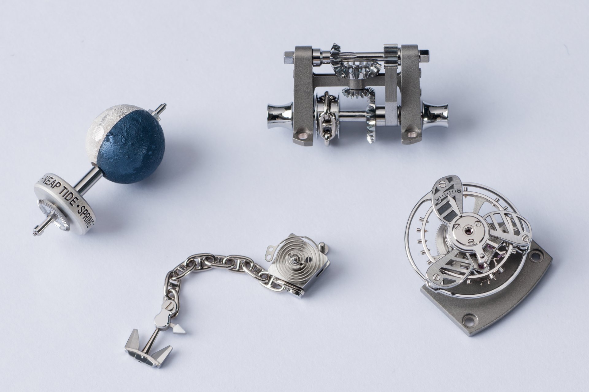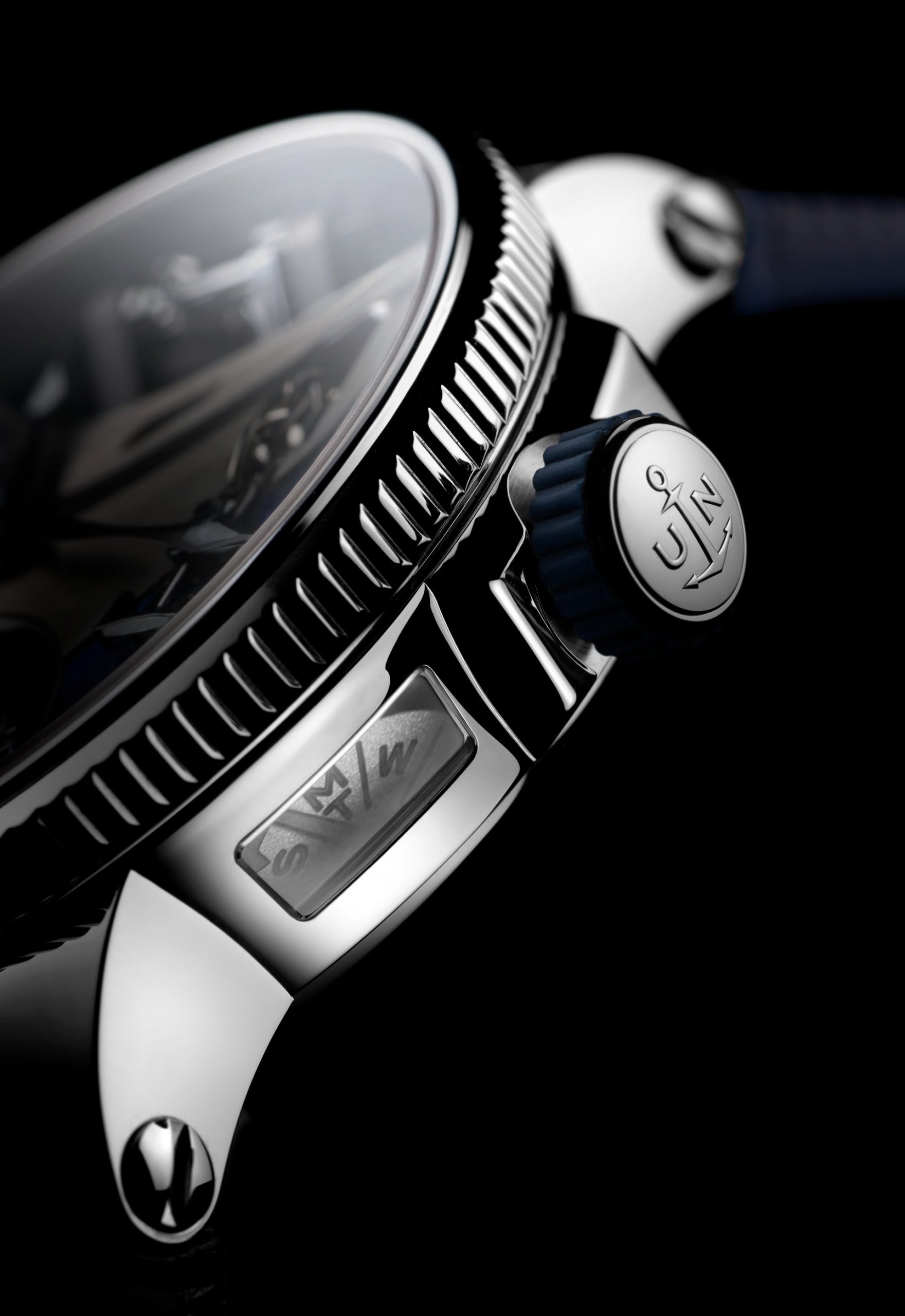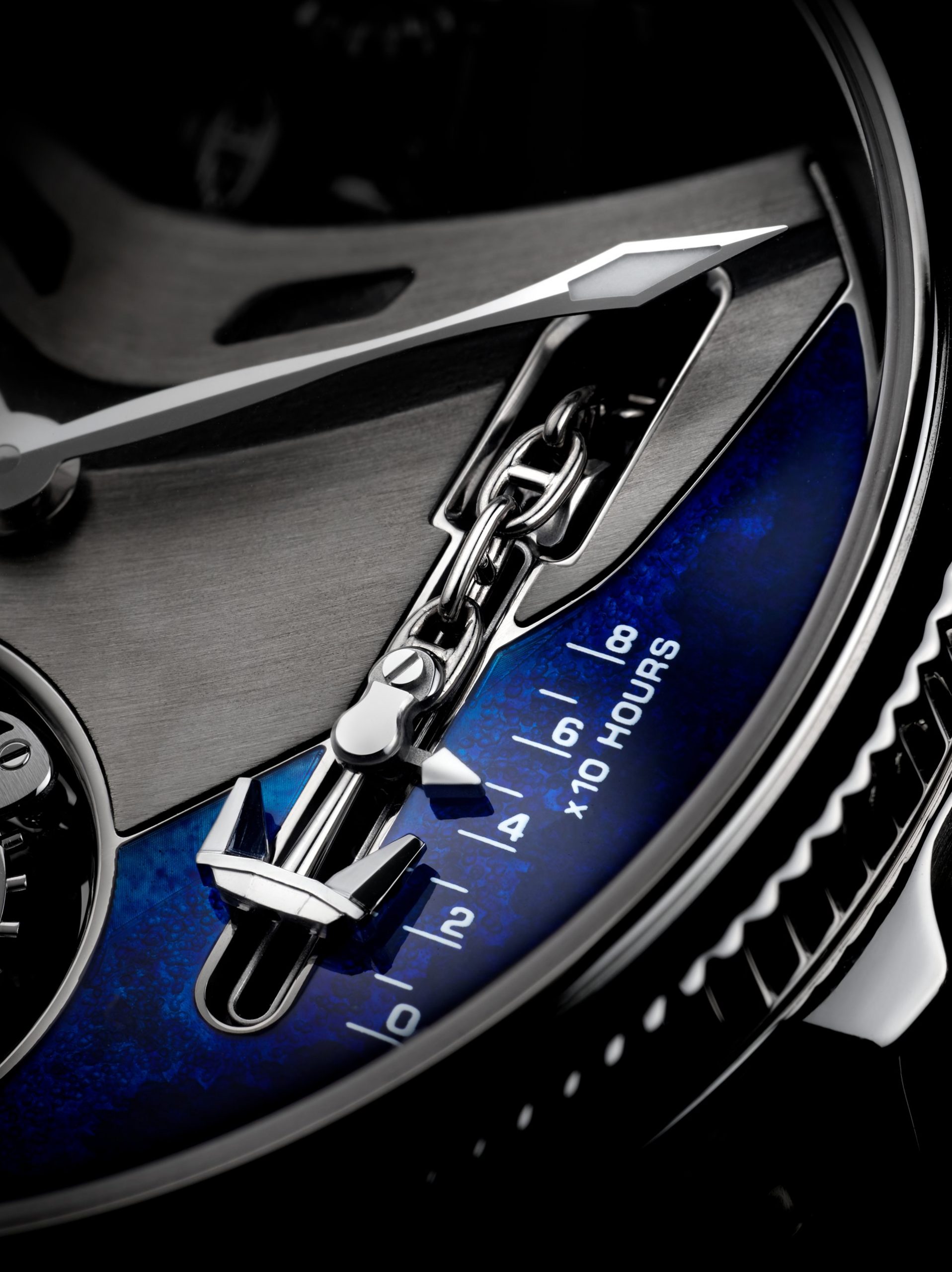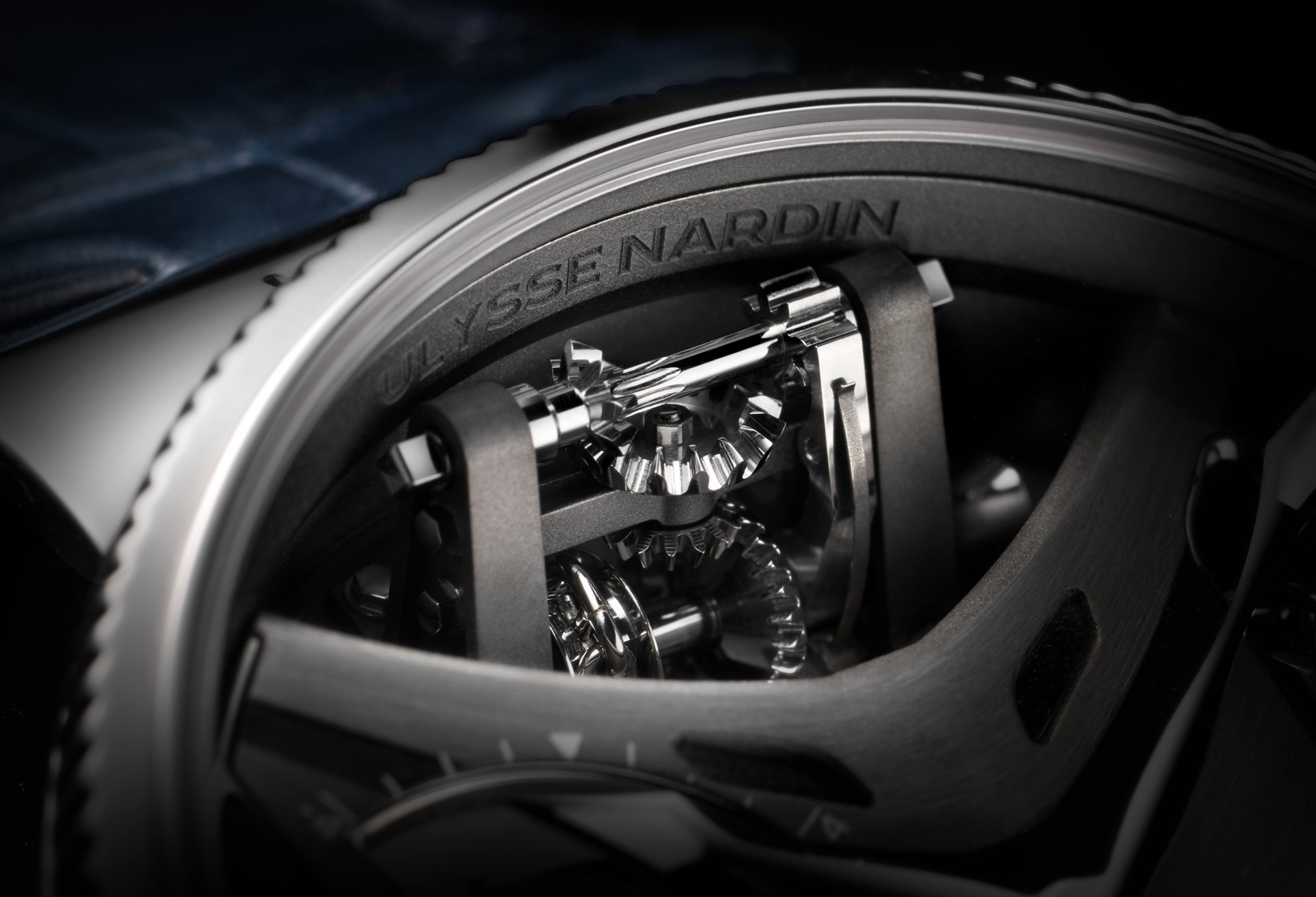 This powerful beating heart of the watch has a diameter of 37 mm, features 504 components, and is wound by hand. It guarantees a power reserve of 80 hours at a cruising speed of 21,600 vibrations per hour, with the tourbillon moving at 60 rotations per hour (or one rotation every 60 seconds). Its first role is to provide an analogue time display, giving a three-dimensional presentation of the phases of the Moon. It contains a mechanism that displays the height of the tides in real time in relation to a specific location, in addition to indicating the seasonal coefficients. Once the mechanism has been adjusted by the action of the winding crown, the position of this is measured in a window opened up in the side of the watch-band in the same way as the screen of a Chadburn Telegraph. Because watchmaking is above all an art form, the anchor features a contemporary design fashioned in the form of a plowshare, and is linked to the chain by an anchor ring. Although this may appear to be entirely decorative, the anchor chain actually moves in response to the movements of the winding-crown so as to indicate the power reserve. Keen to be as realistic as possible, Ulysse Nardin has perfected an authentic miniature windlass, visible at 12 o’clock. Through the action of a set of wheels in contact with the winding mechanism, the windlass turns to simulate the raising of the anchor, even when the winding process has been fully completed.