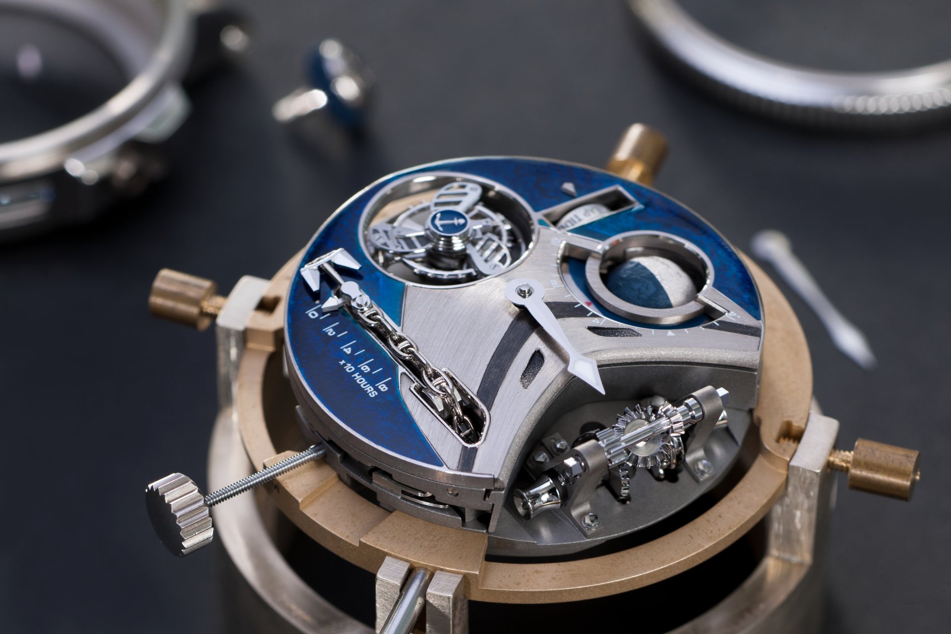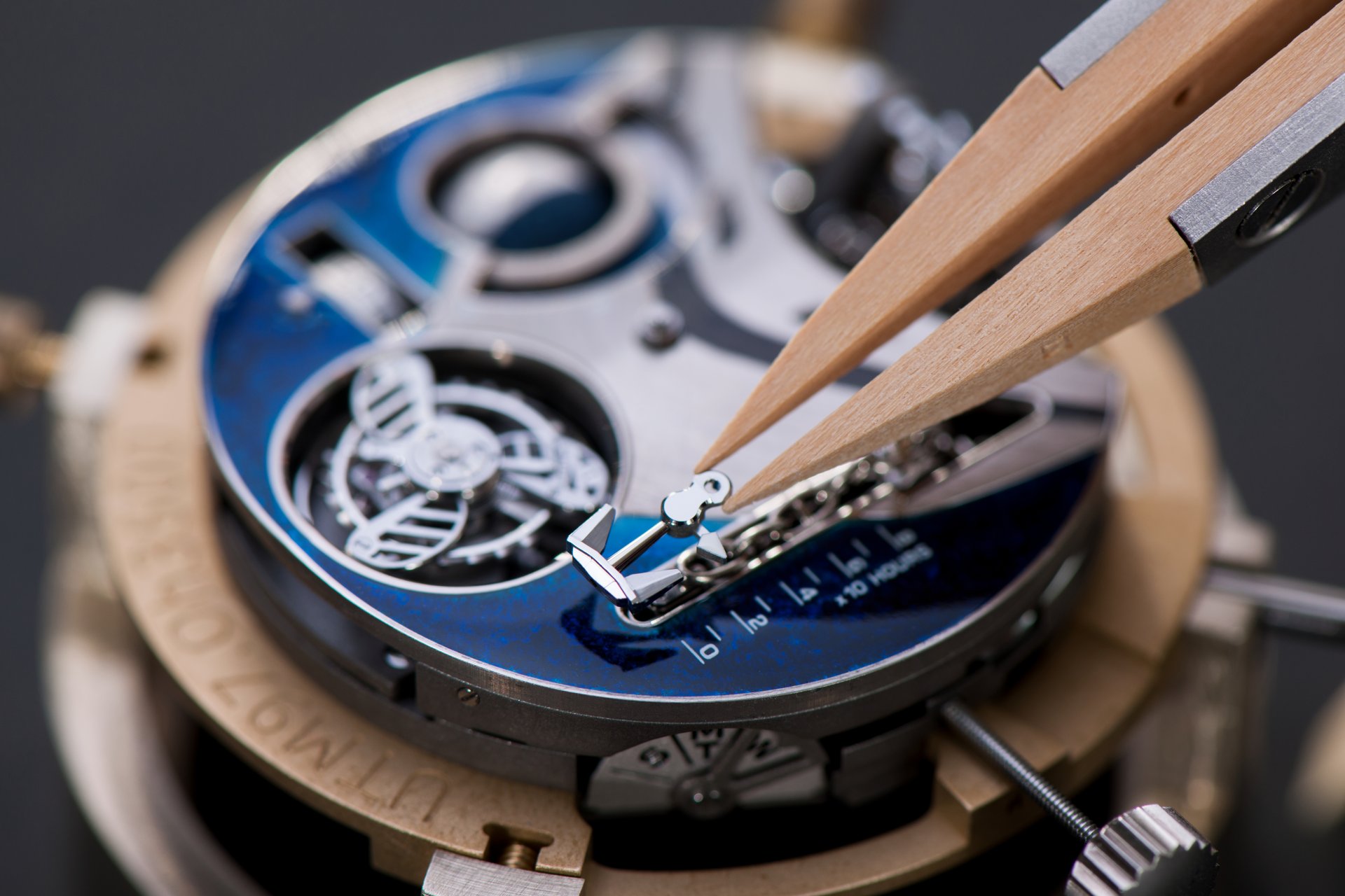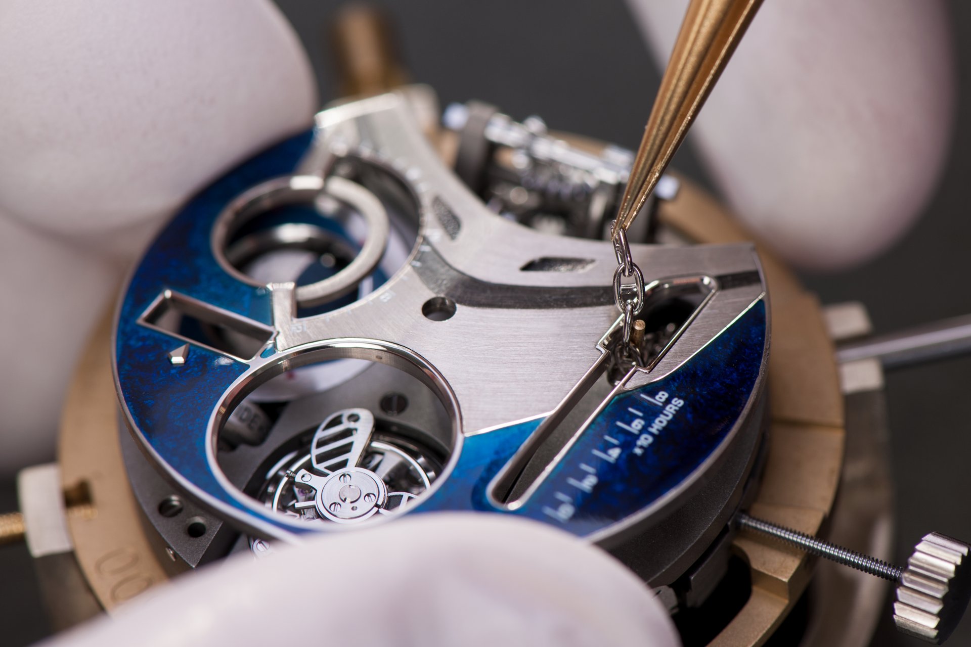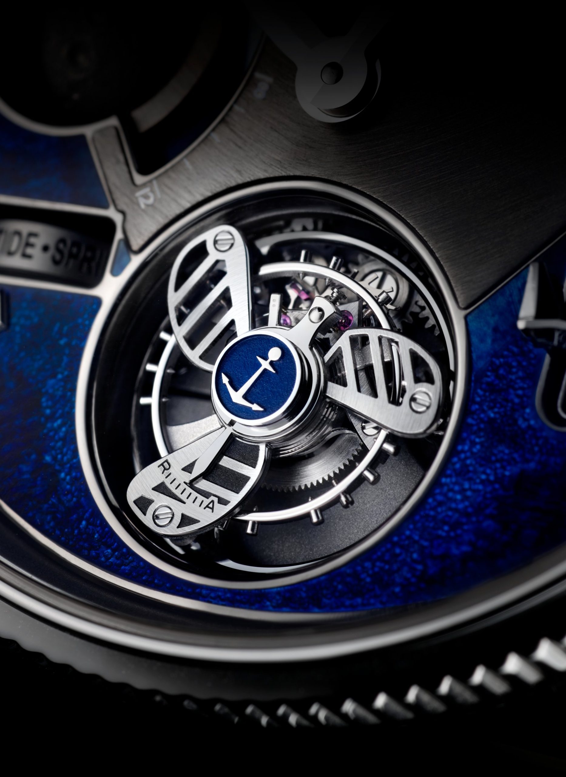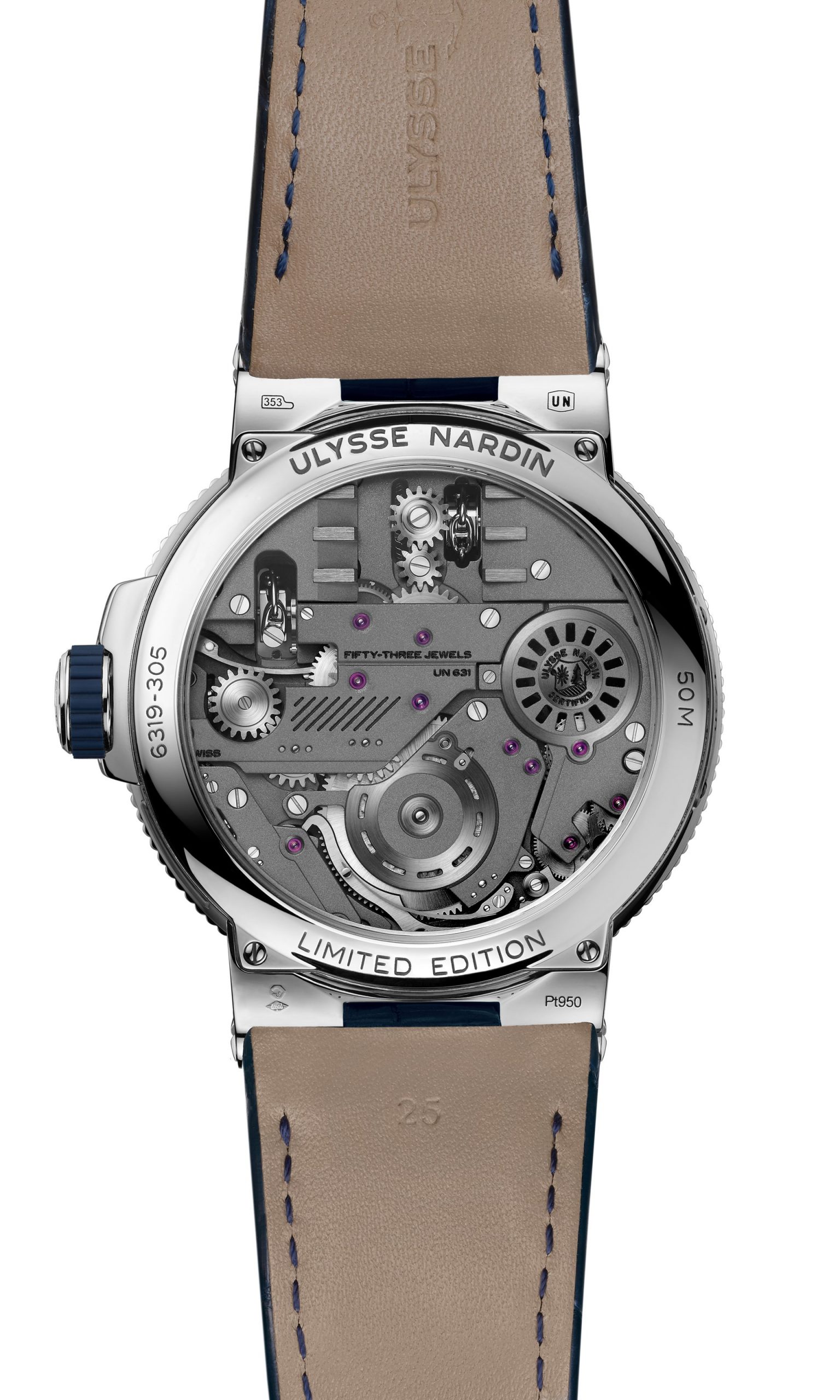 Case-back: Sapphire crystal displaying the movement inspired by a ship’s engine room