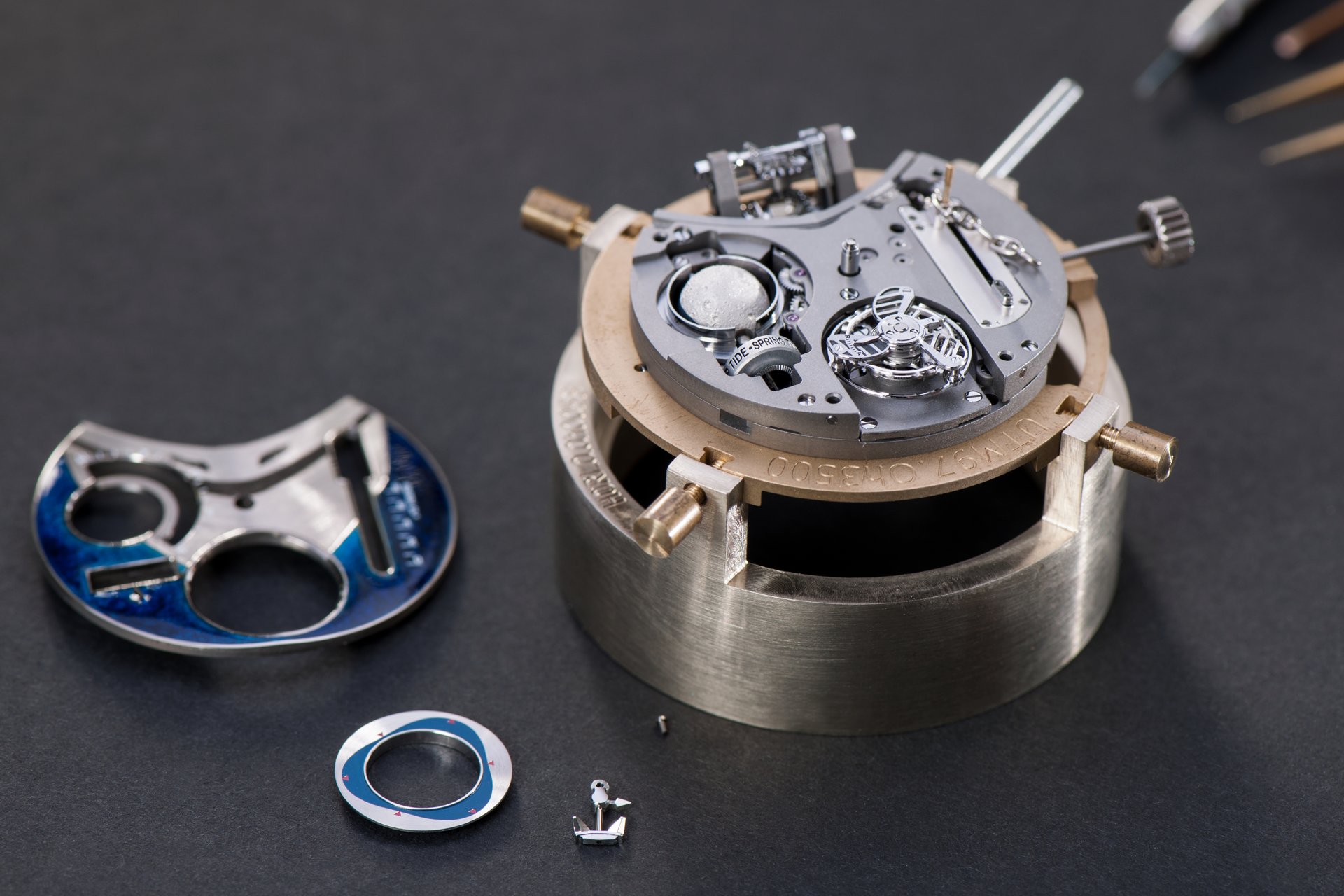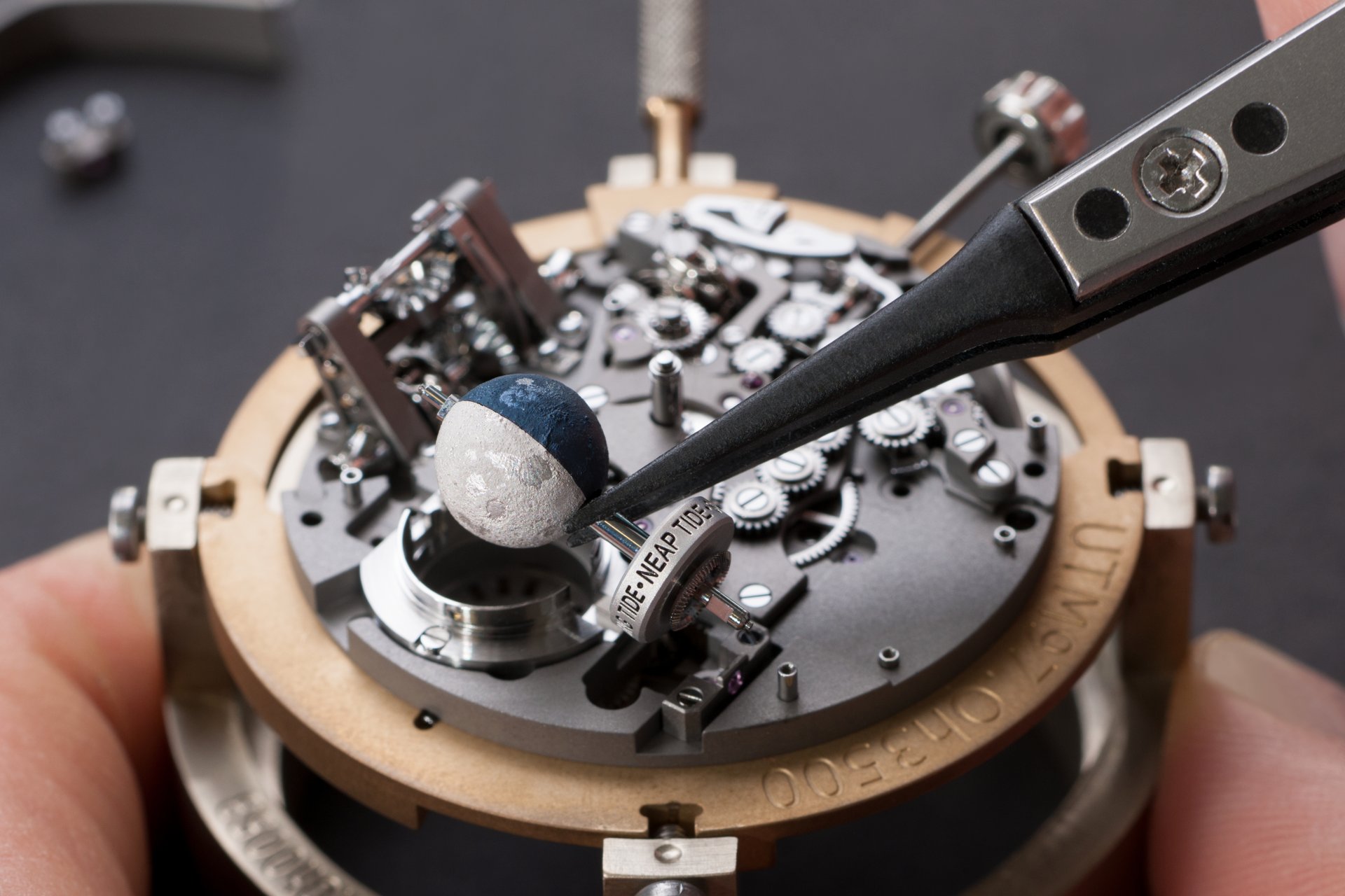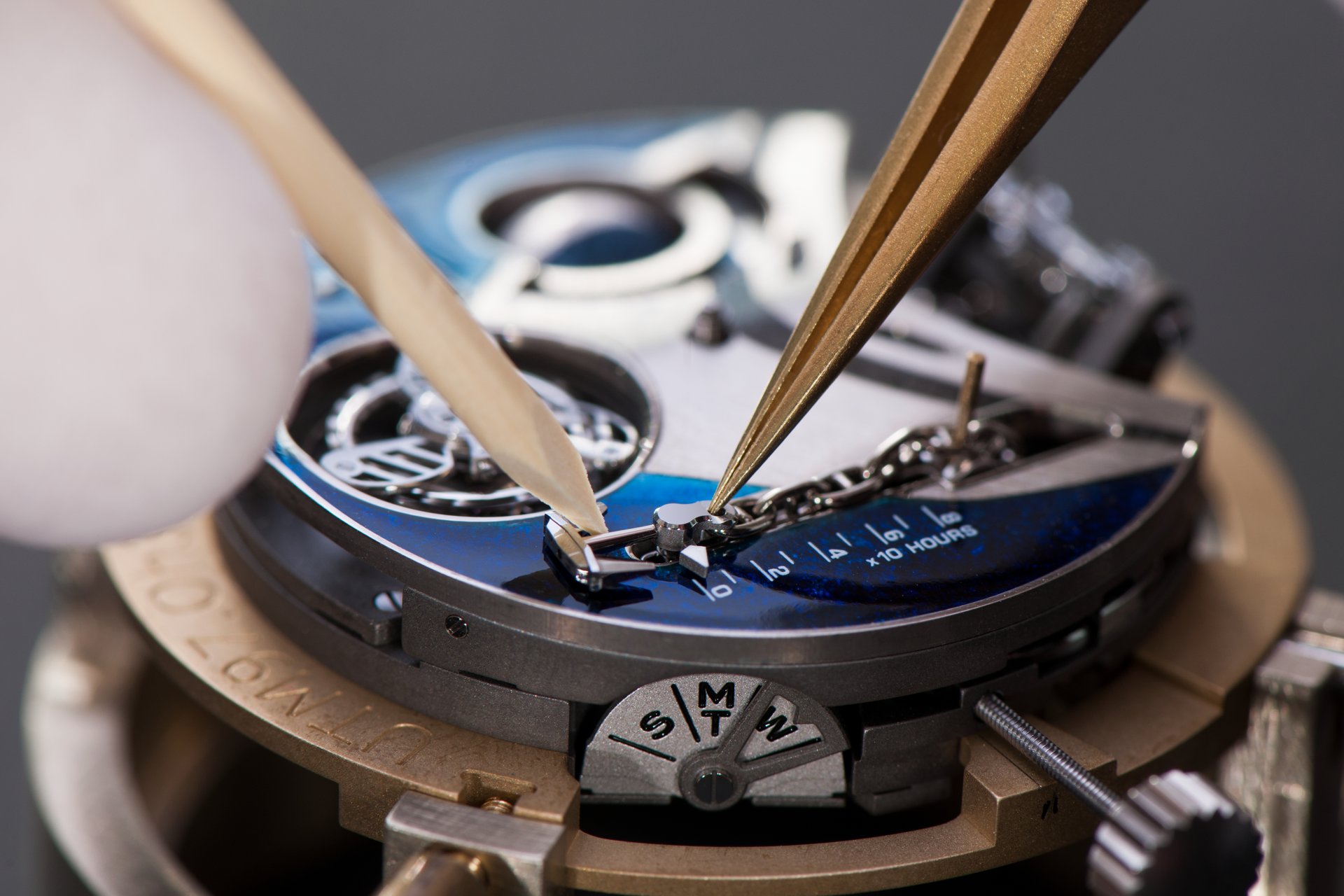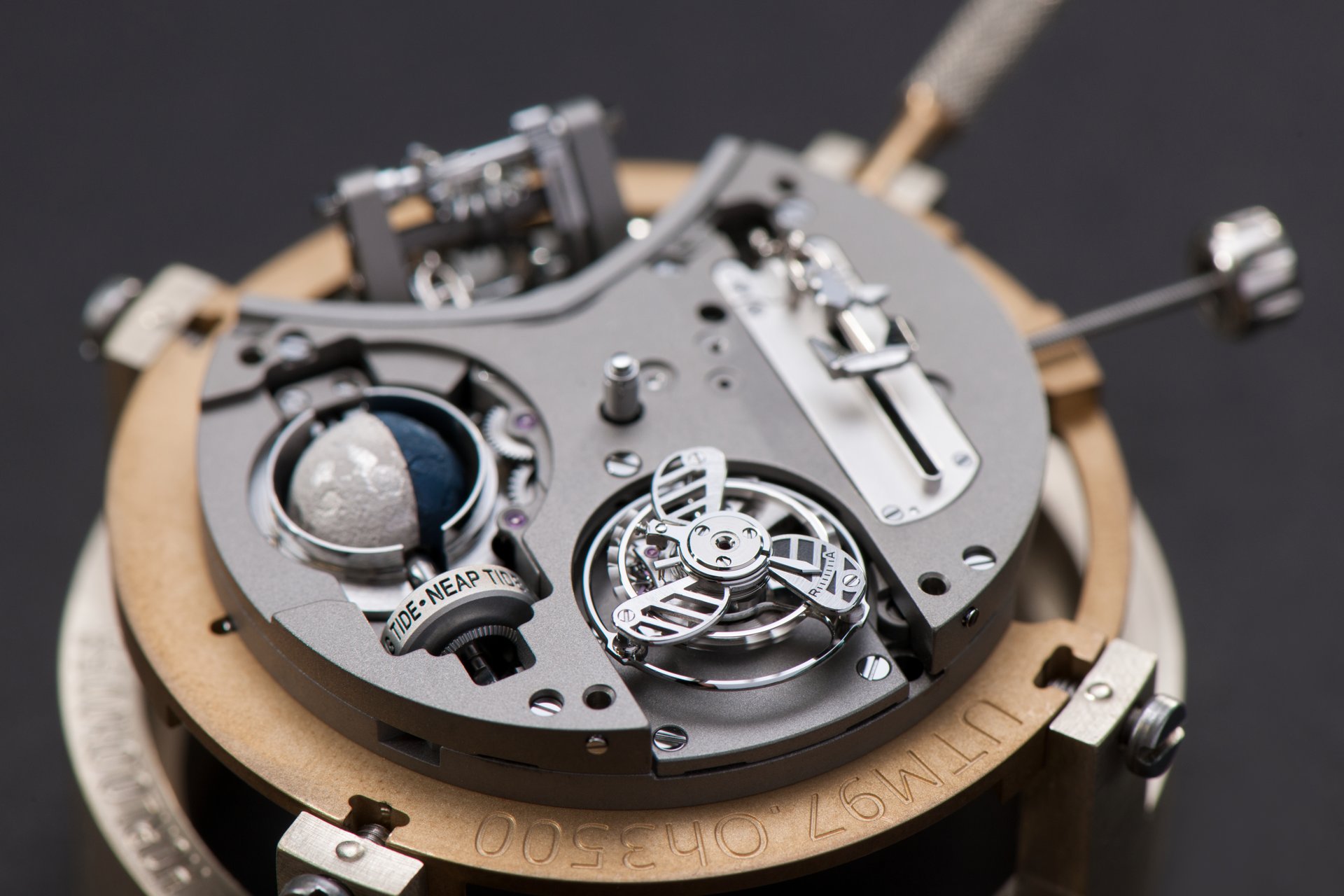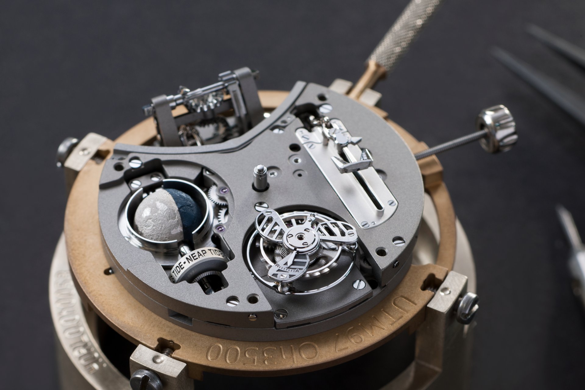 Its adjustment in relation to the annual calendar is undertaken through the winding-crown. A telegraph window opened in the side of the watch-band indicates its position (S: Set position for setting the hands/TM: Tide and Moon position/W: position for winding the movement). In the intermediate position, the Moon phase and tide volume indication is regulated by turning the crown counter-clockwise (one turn of the crown represents four days), while in the clockwise direction the operator regulates the level of the tide depending on his location (one turn of the crown represents a 0.25 turn of the disk, equivalent to 9.5 hours).