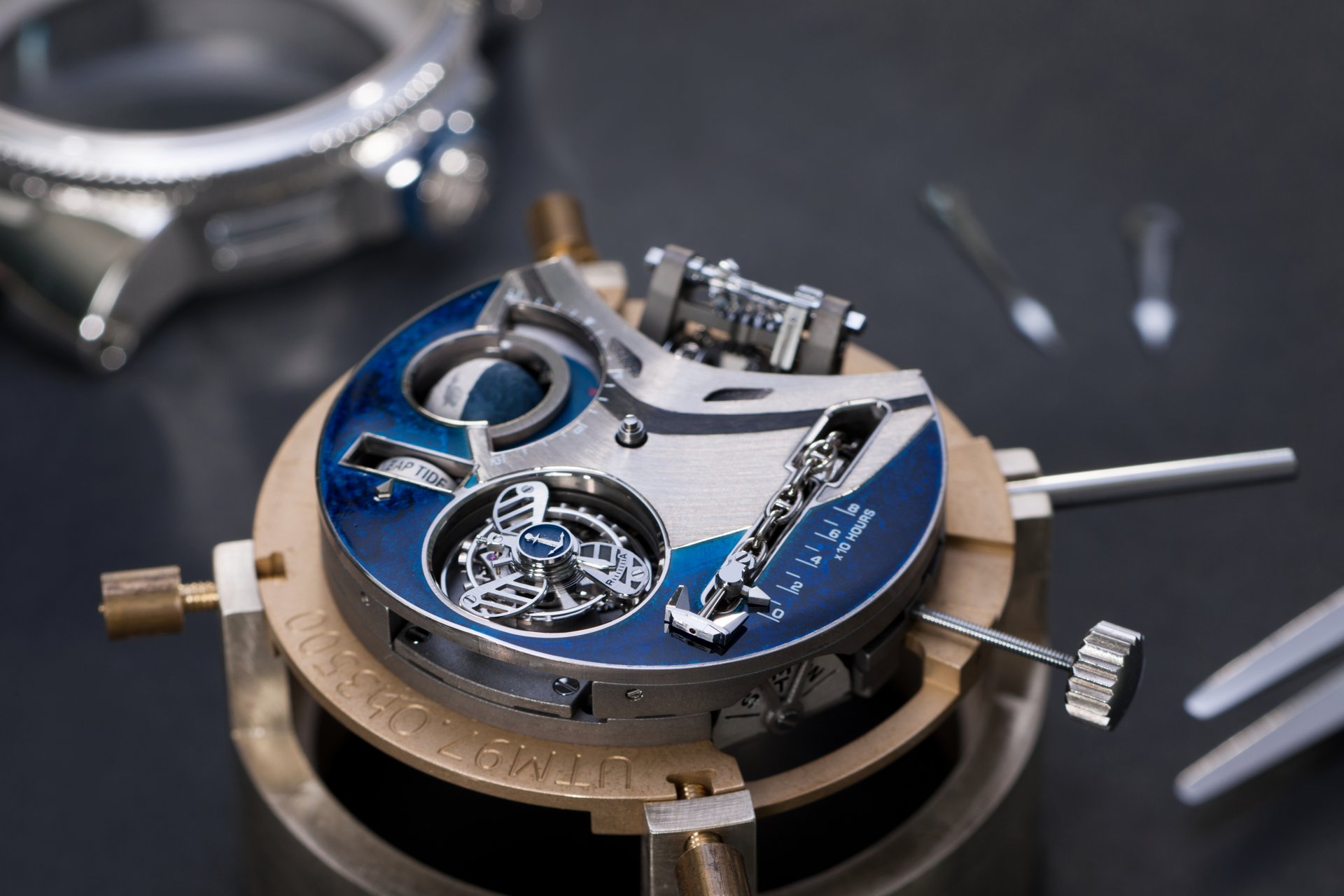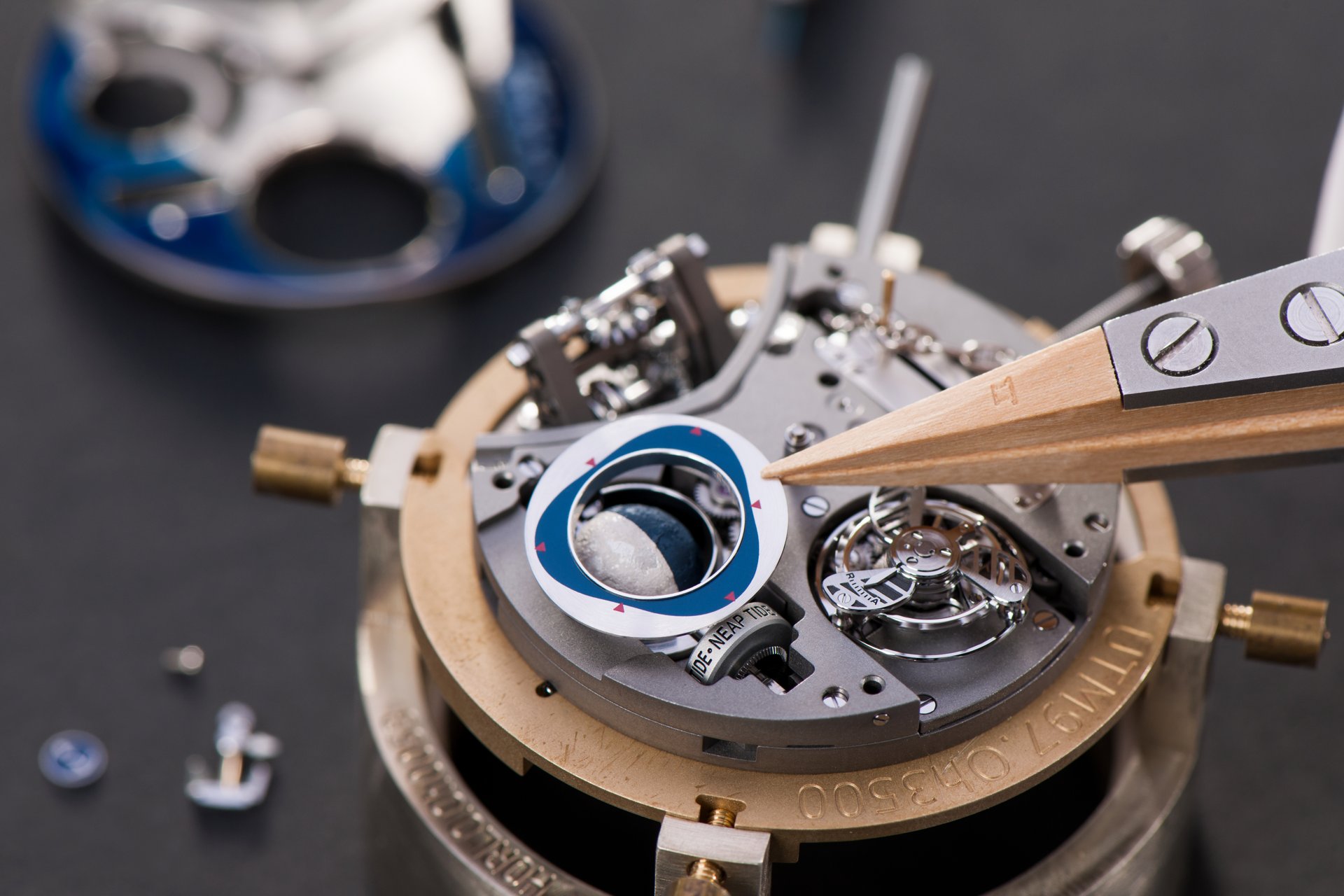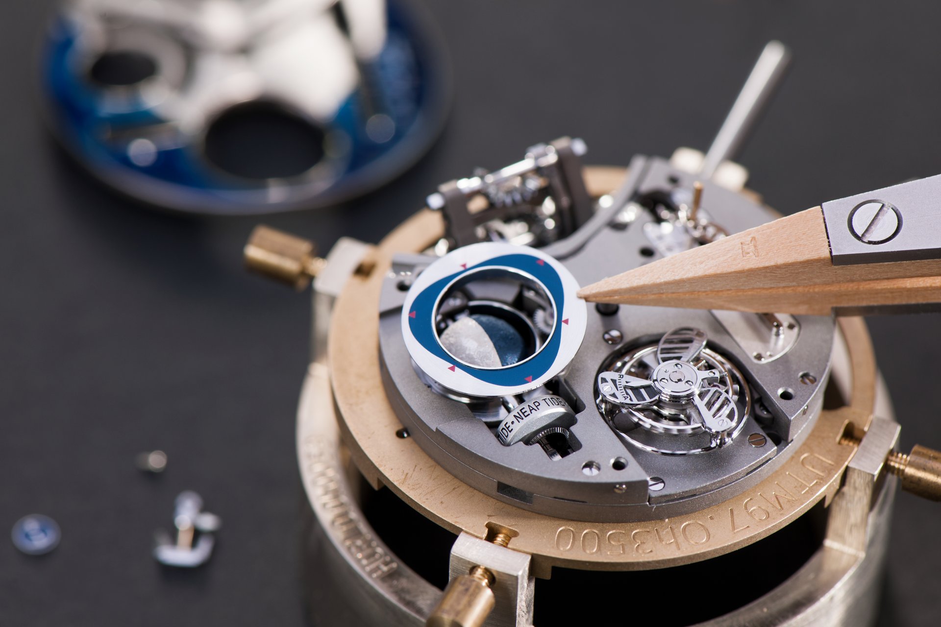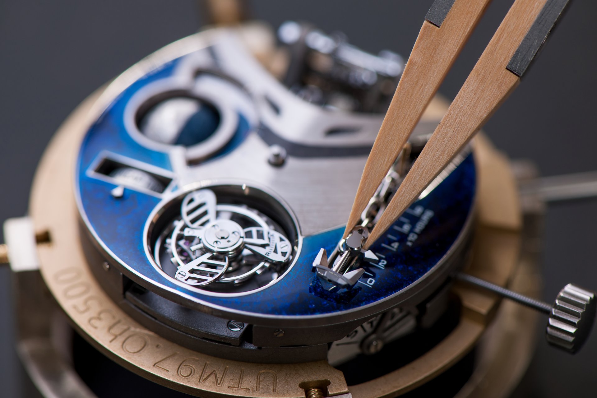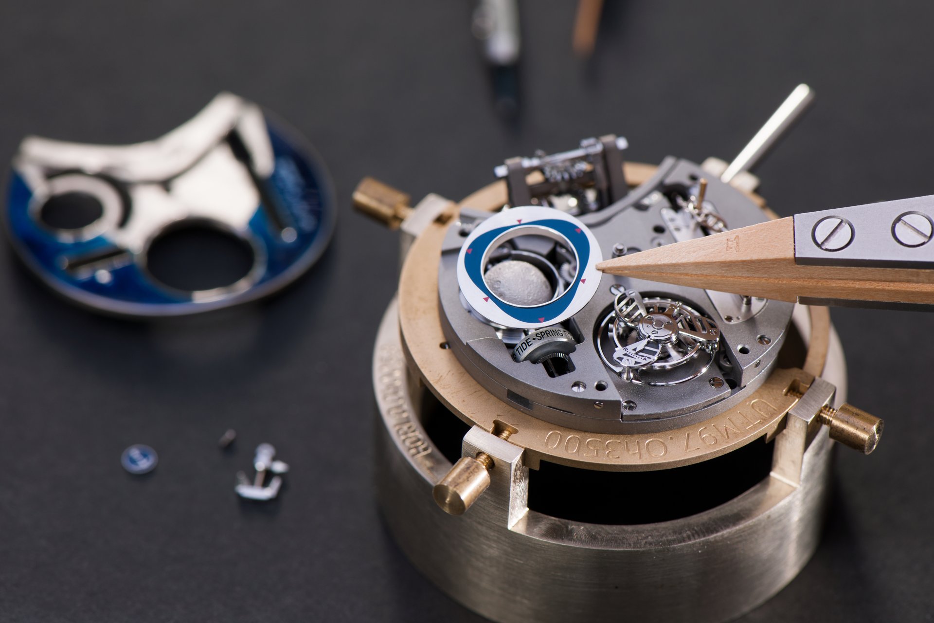Its adjustment in relation to the annual calendar is undertaken through the winding-crown. A telegraph window opened in the side of the watch-band indicates its position (S: Set position for setting the hands/TM: Tide and Moon position/W: position for winding the movement). In the intermediate position, the Moon phase and tide volume indication is regulated by turning the crown counter-clockwise (one turn of the crown represents four days), while in the clockwise direction the operator regulates the level of the tide depending on his location (one turn of the crown represents a 0.25 turn of the disk, equivalent to 9.5 hours).