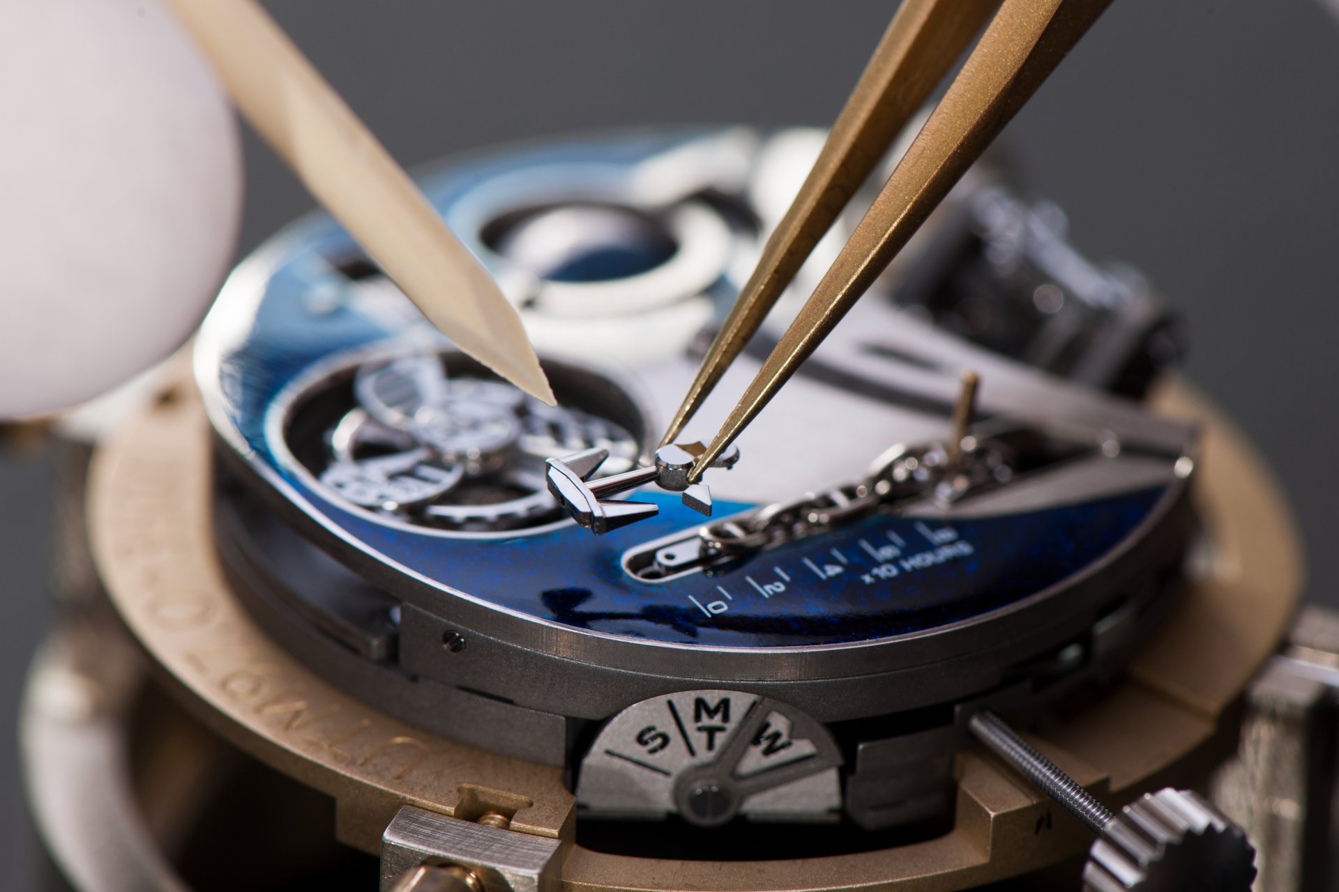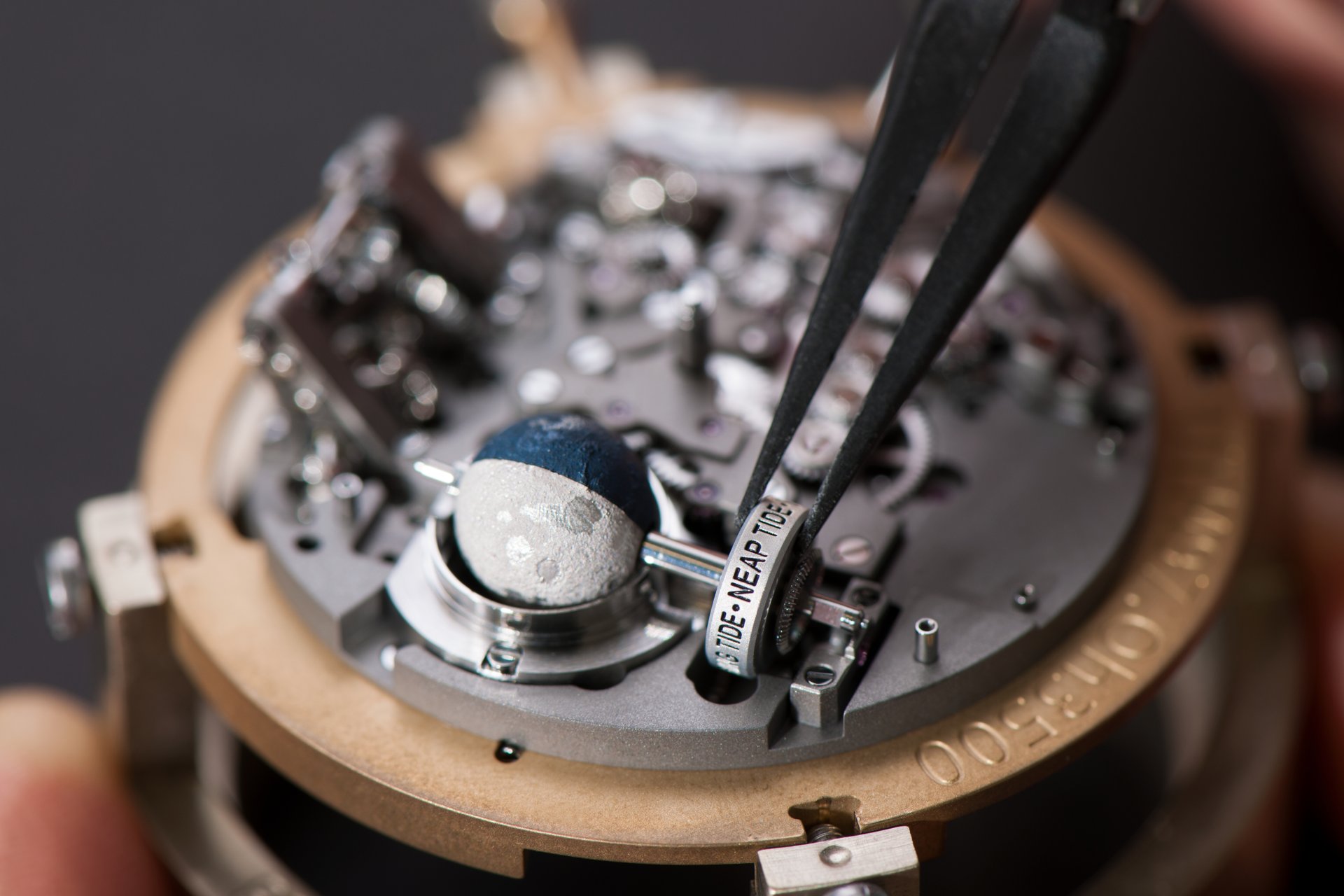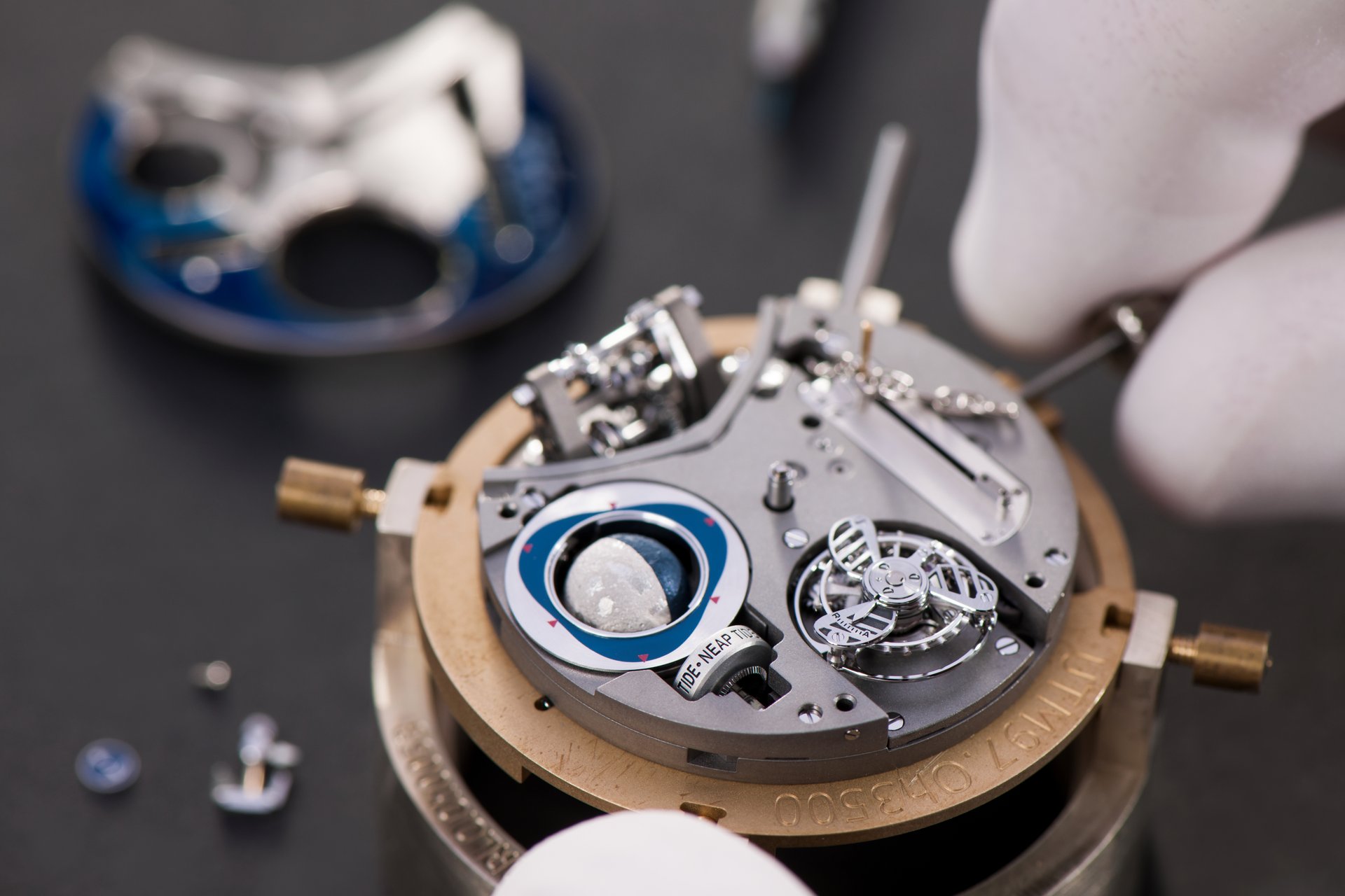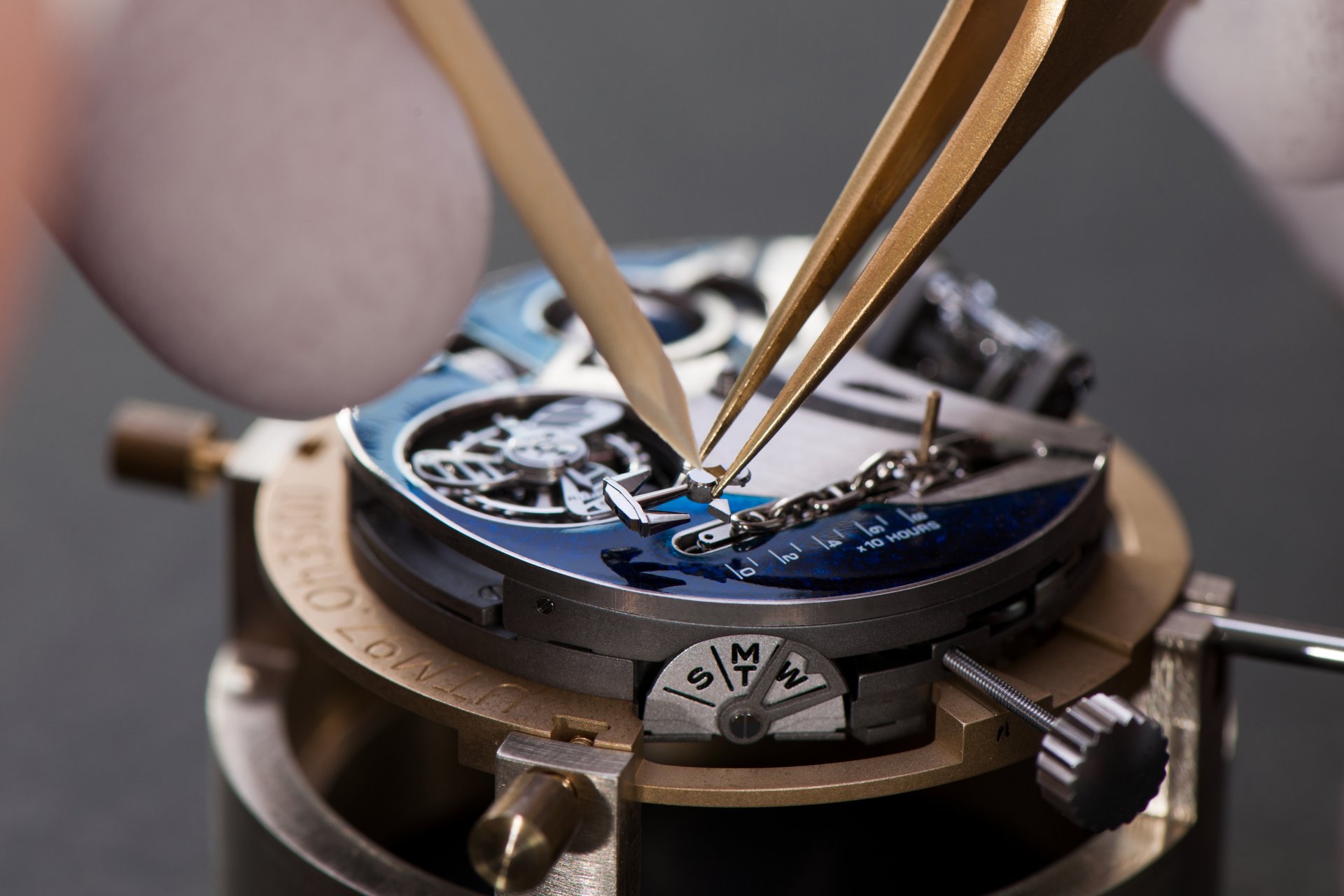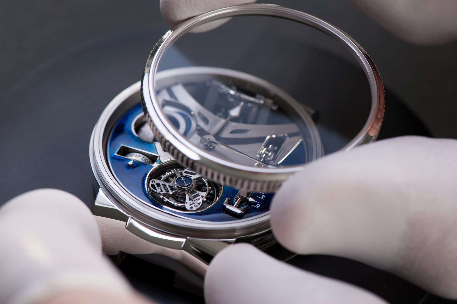 Its adjustment in relation to the annual calendar is undertaken through the winding-crown. A telegraph window opened in the side of the watch-band indicates its position (S: Set position for setting the hands/TM: Tide and Moon position/W: position for winding the movement). In the intermediate position, the Moon phase and tide volume indication is regulated by turning the crown counter-clockwise (one turn of the crown represents four days), while in the clockwise direction the operator regulates the level of the tide depending on his location (one turn of the crown represents a 0.25 turn of the disk, equivalent to 9.5 hours).