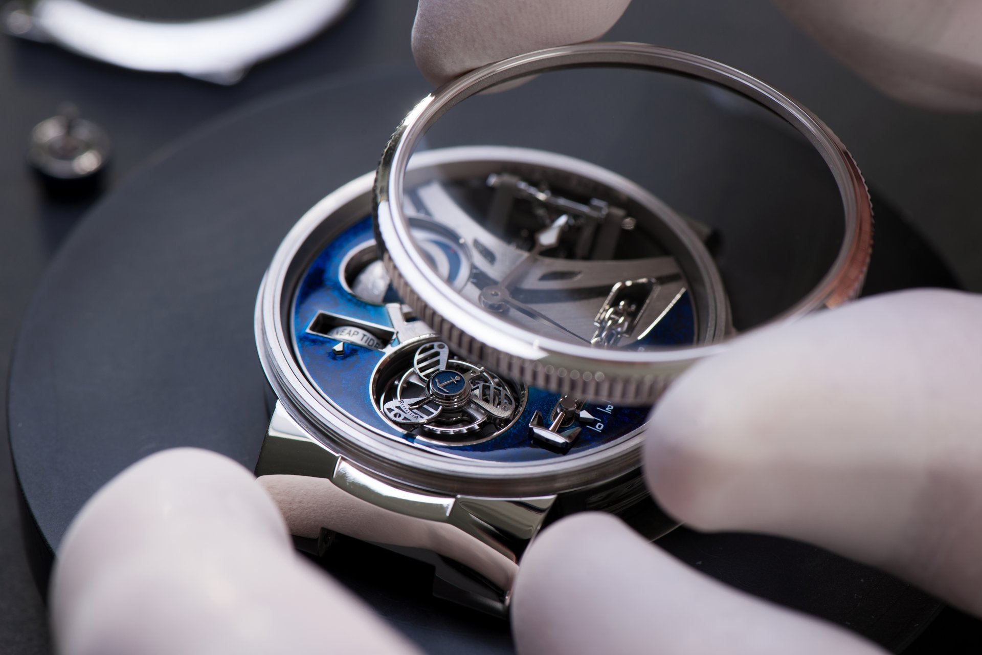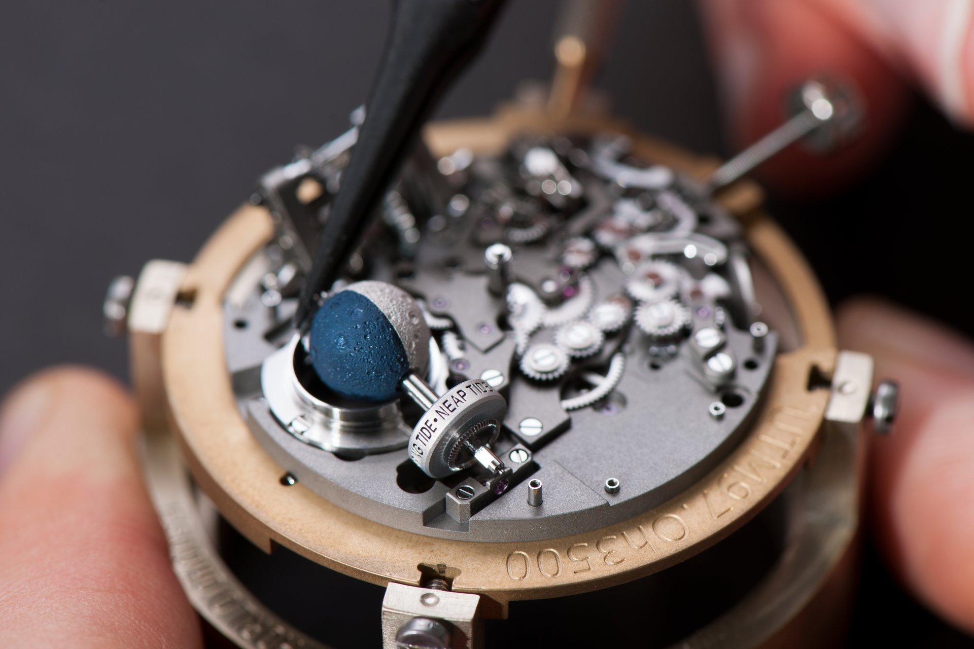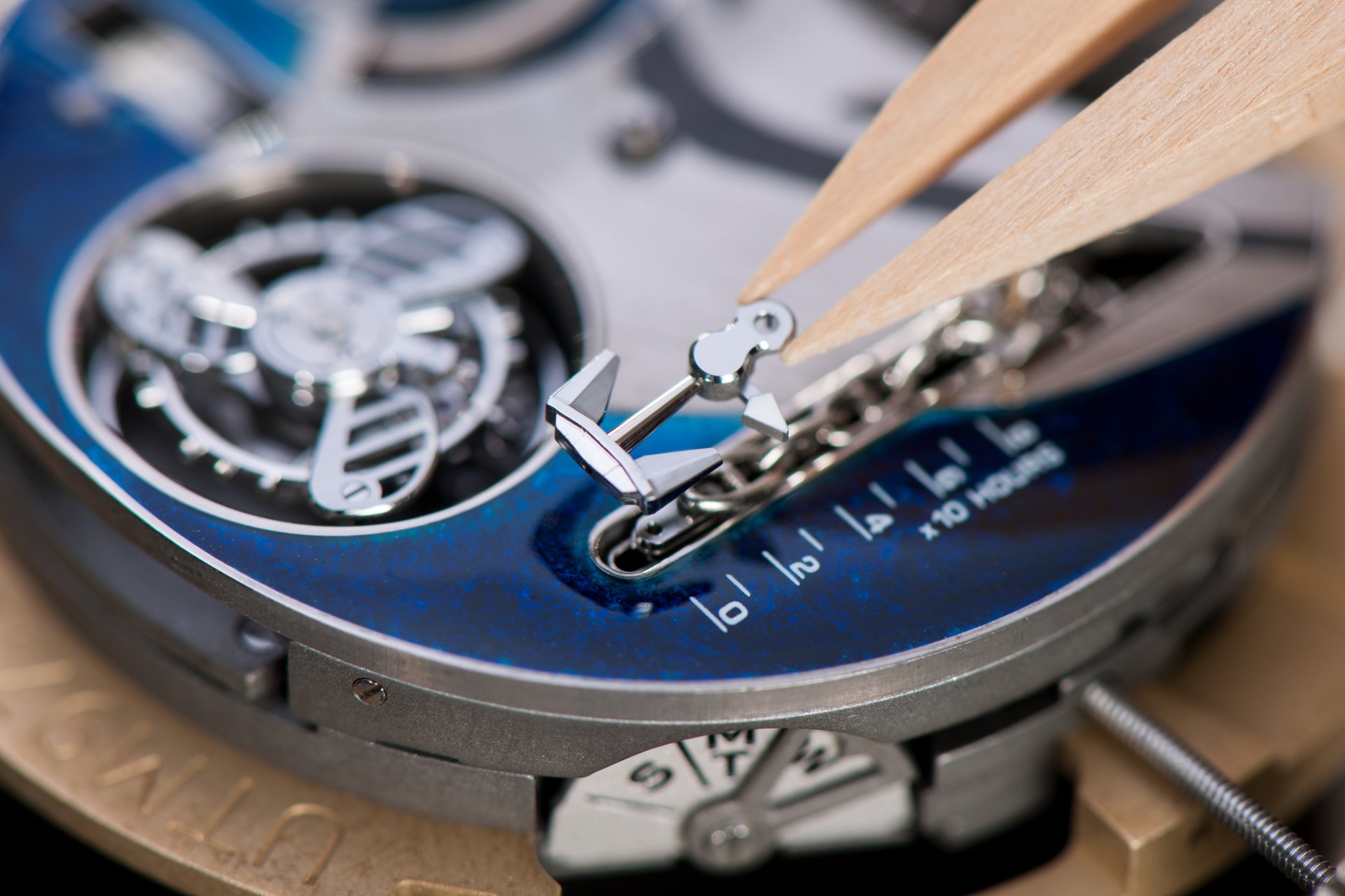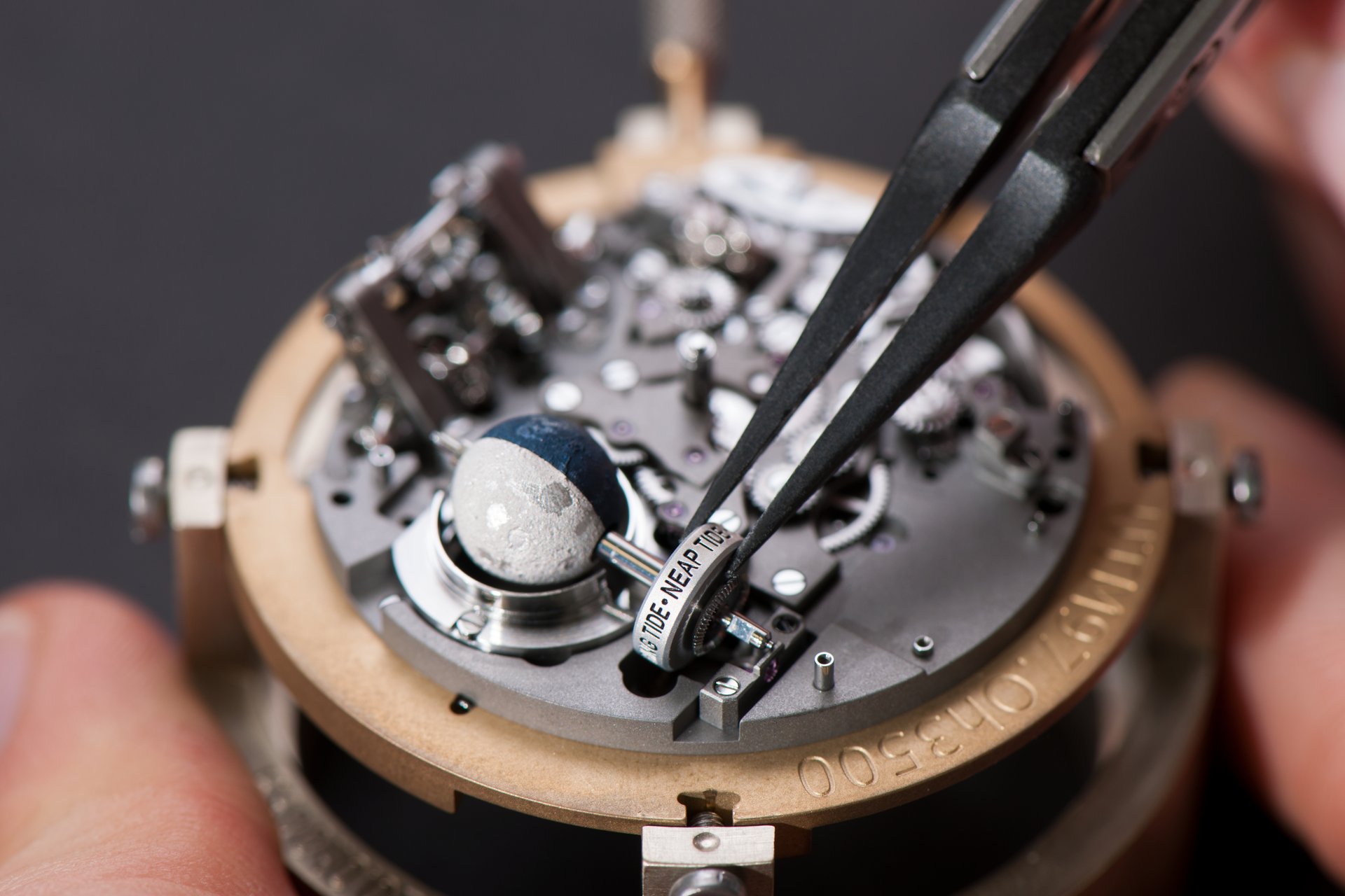 Its adjustment in relation to the annual calendar is undertaken through the winding-crown. A telegraph window opened in the side of the watch-band indicates its position (S: Set position for setting the hands/TM: Tide and Moon position/W: position for winding the movement). In the intermediate position, the Moon phase and tide volume indication is regulated by turning the crown counter-clockwise (one turn of the crown represents four days), while in the clockwise direction the operator regulates the level of the tide depending on his location (one turn of the crown represents a 0.25 turn of the disk, equivalent to 9.5 hours).