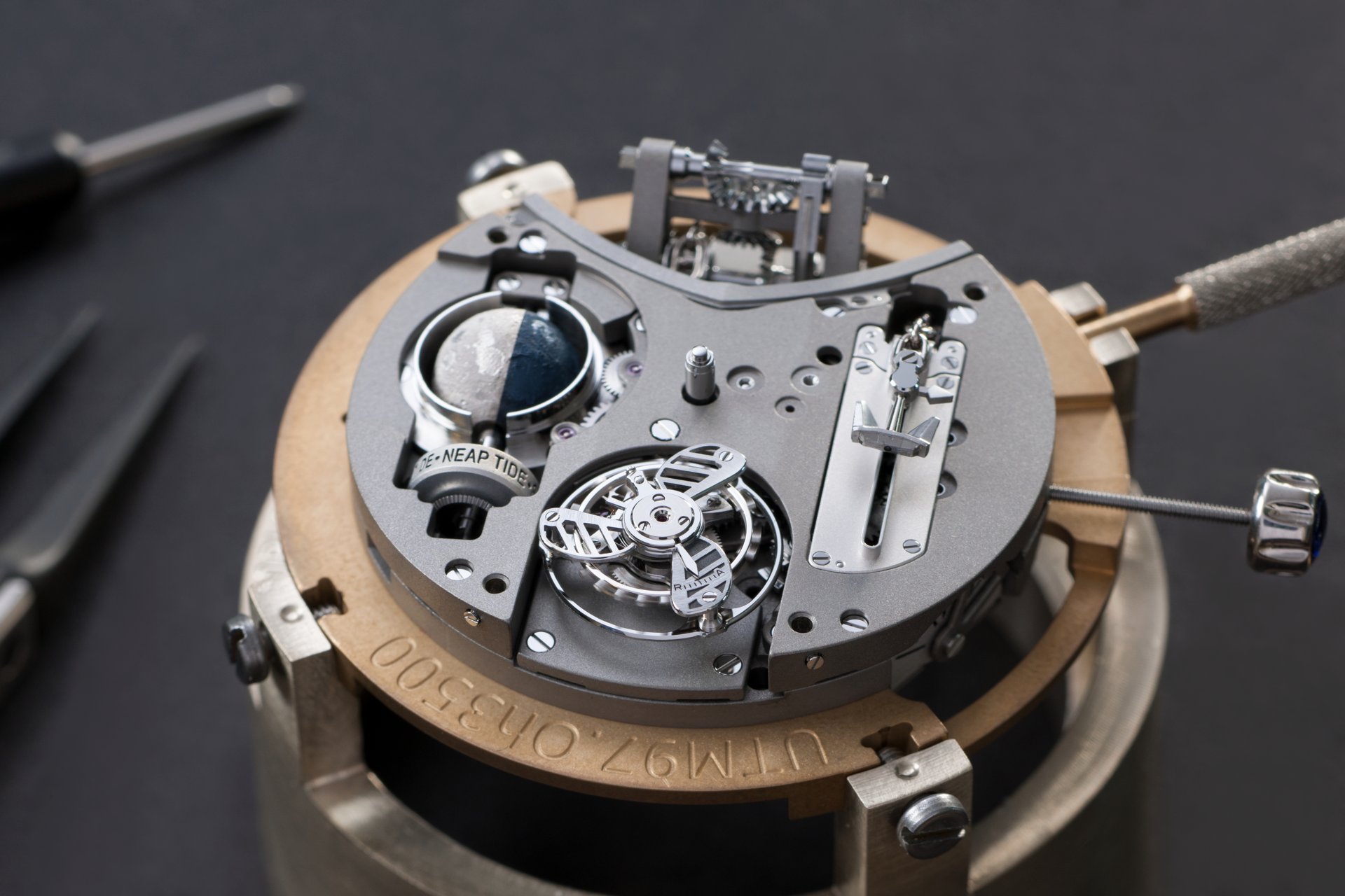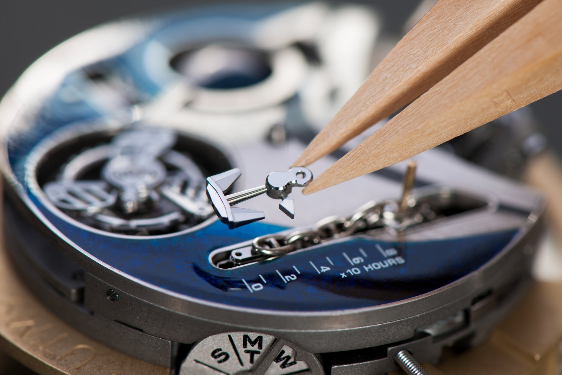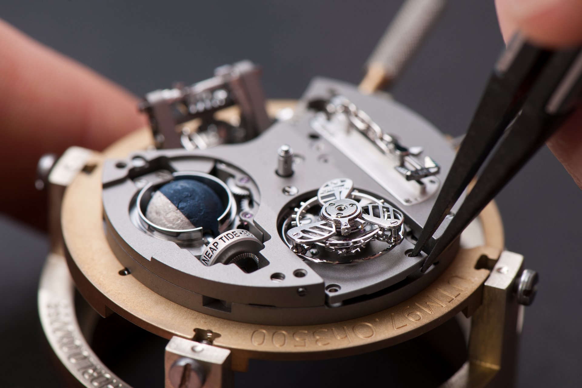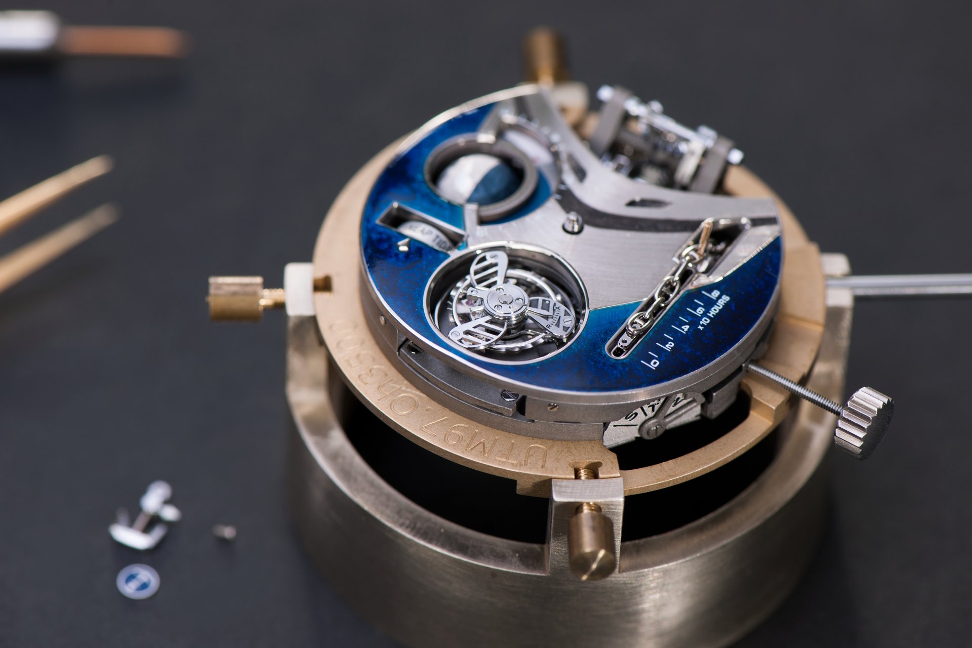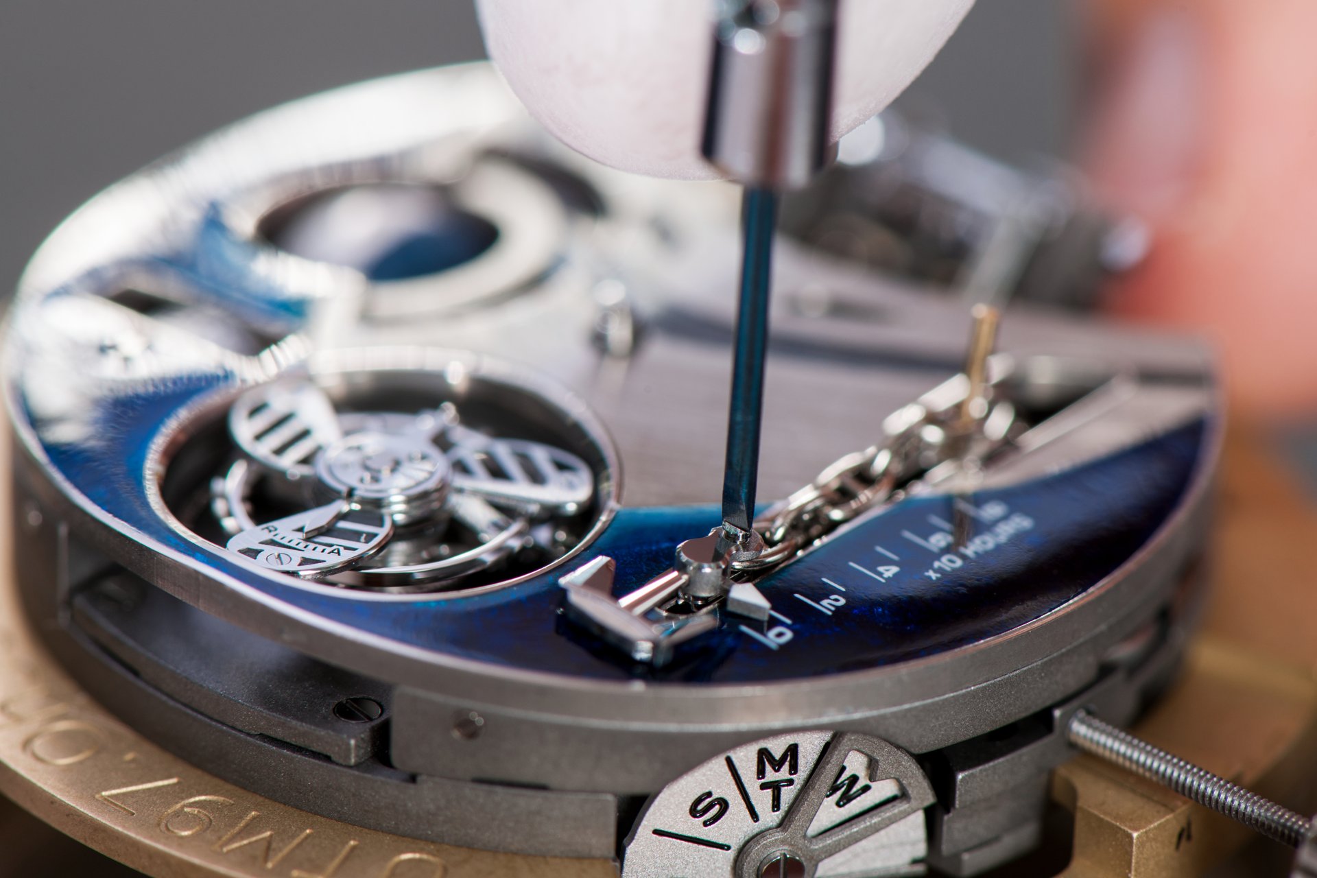 Its adjustment in relation to the annual calendar is undertaken through the winding-crown. A telegraph window opened in the side of the watch-band indicates its position (S: Set position for setting the hands/TM: Tide and Moon position/W: position for winding the movement). In the intermediate position, the Moon phase and tide volume indication is regulated by turning the crown counter-clockwise (one turn of the crown represents four days), while in the clockwise direction the operator regulates the level of the tide depending on his location (one turn of the crown represents a 0.25 turn of the disk, equivalent to 9.5 hours).
