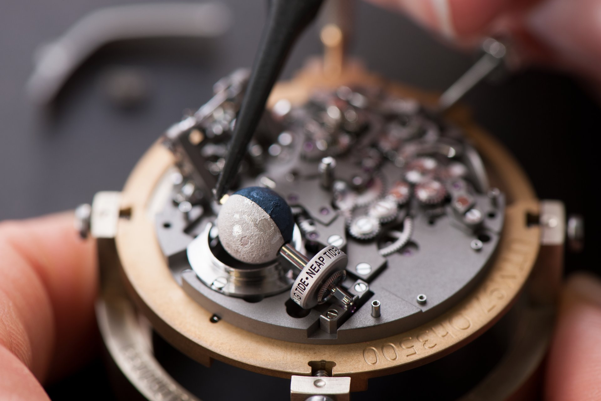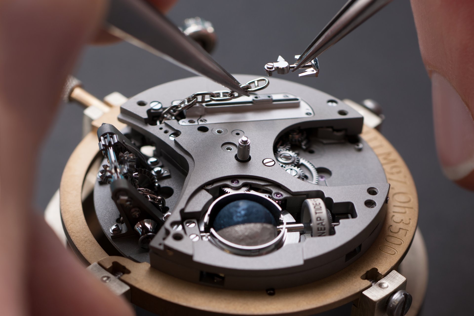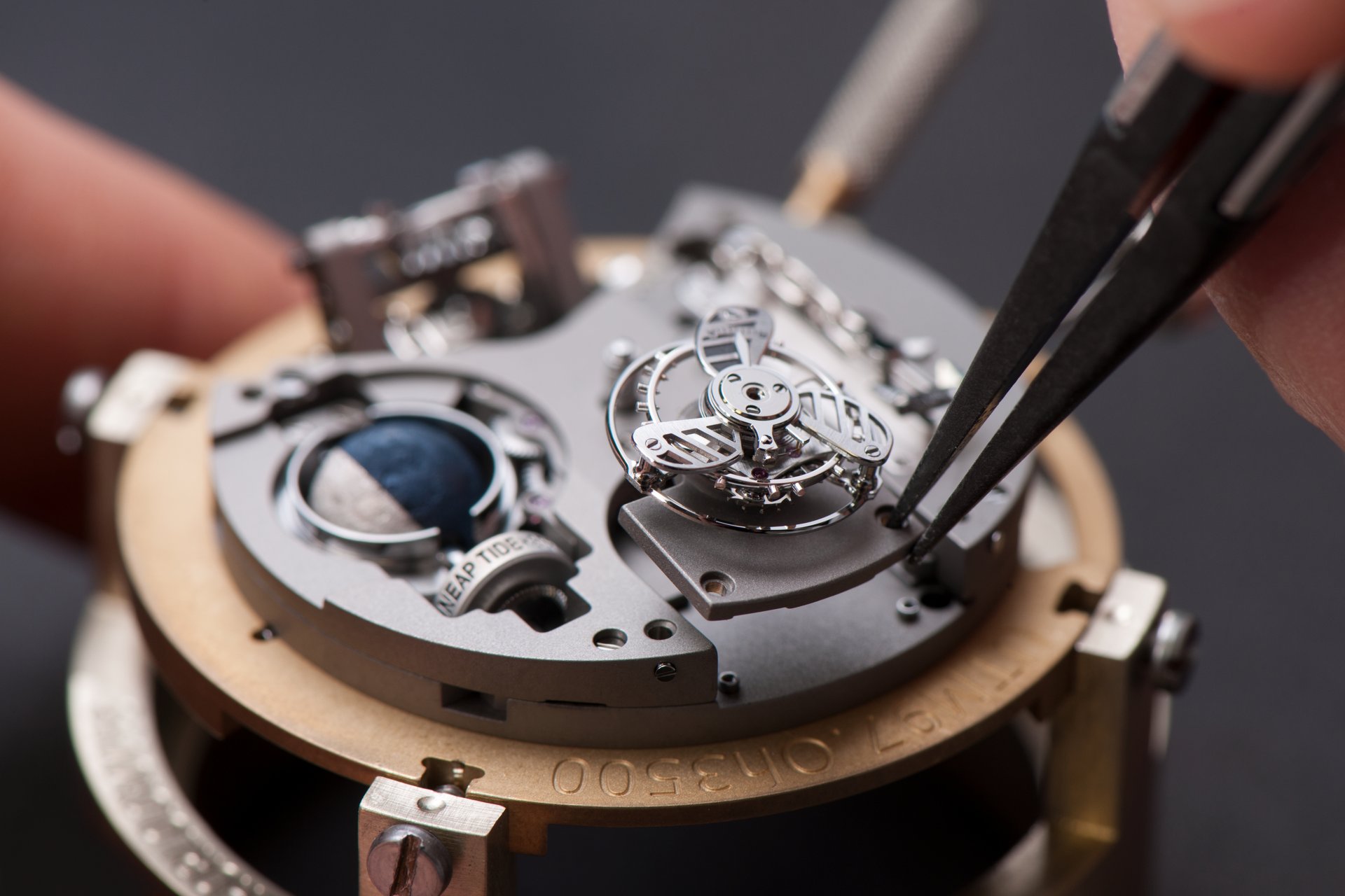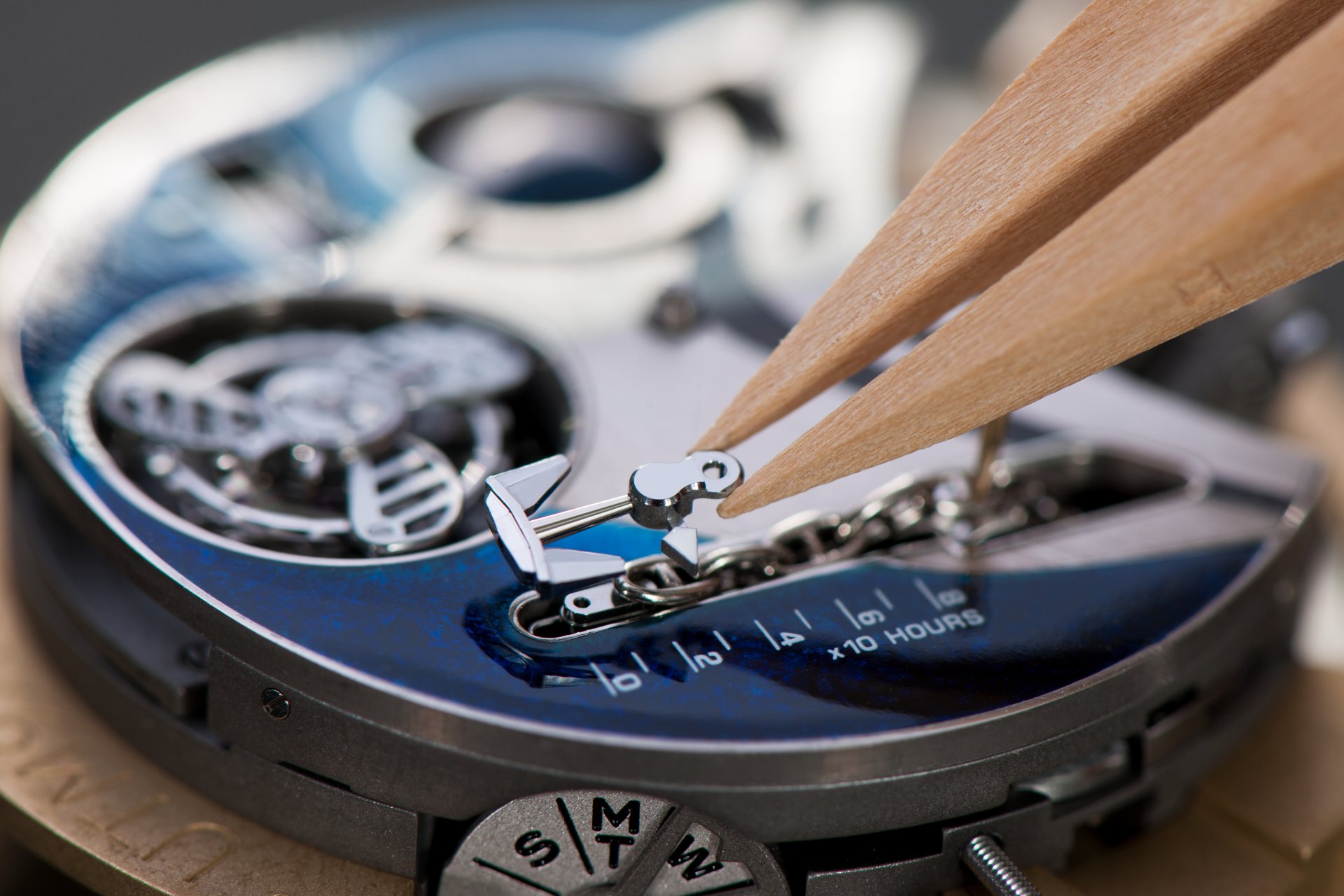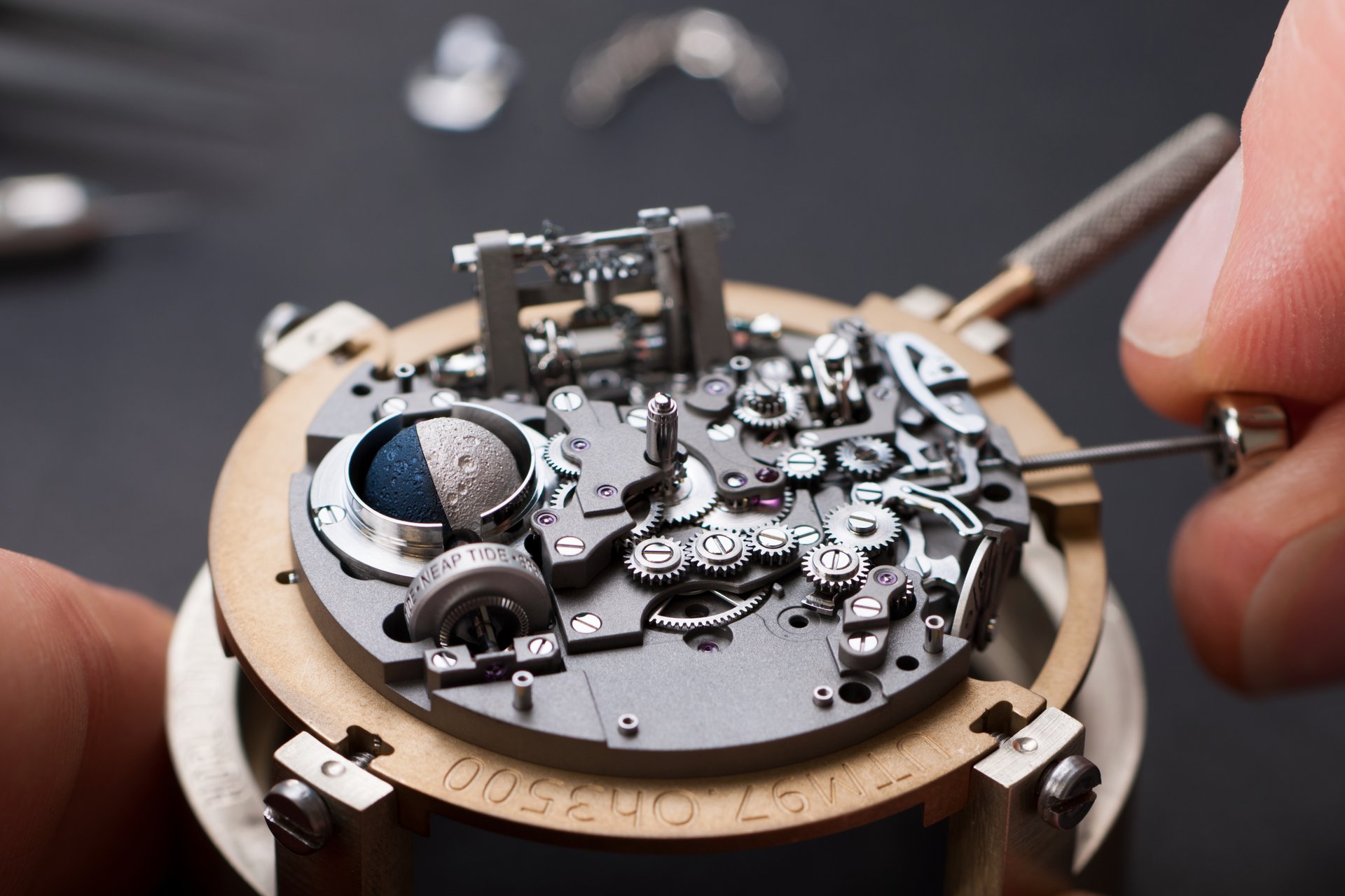 Its adjustment in relation to the annual calendar is undertaken through the winding-crown. A telegraph window opened in the side of the watch-band indicates its position (S: Set position for setting the hands/TM: Tide and Moon position/W: position for winding the movement). In the intermediate position, the Moon phase and tide volume indication is regulated by turning the crown counter-clockwise (one turn of the crown represents four days), while in the clockwise direction the operator regulates the level of the tide depending on his location (one turn of the crown represents a 0.25 turn of the disk, equivalent to 9.5 hours).
