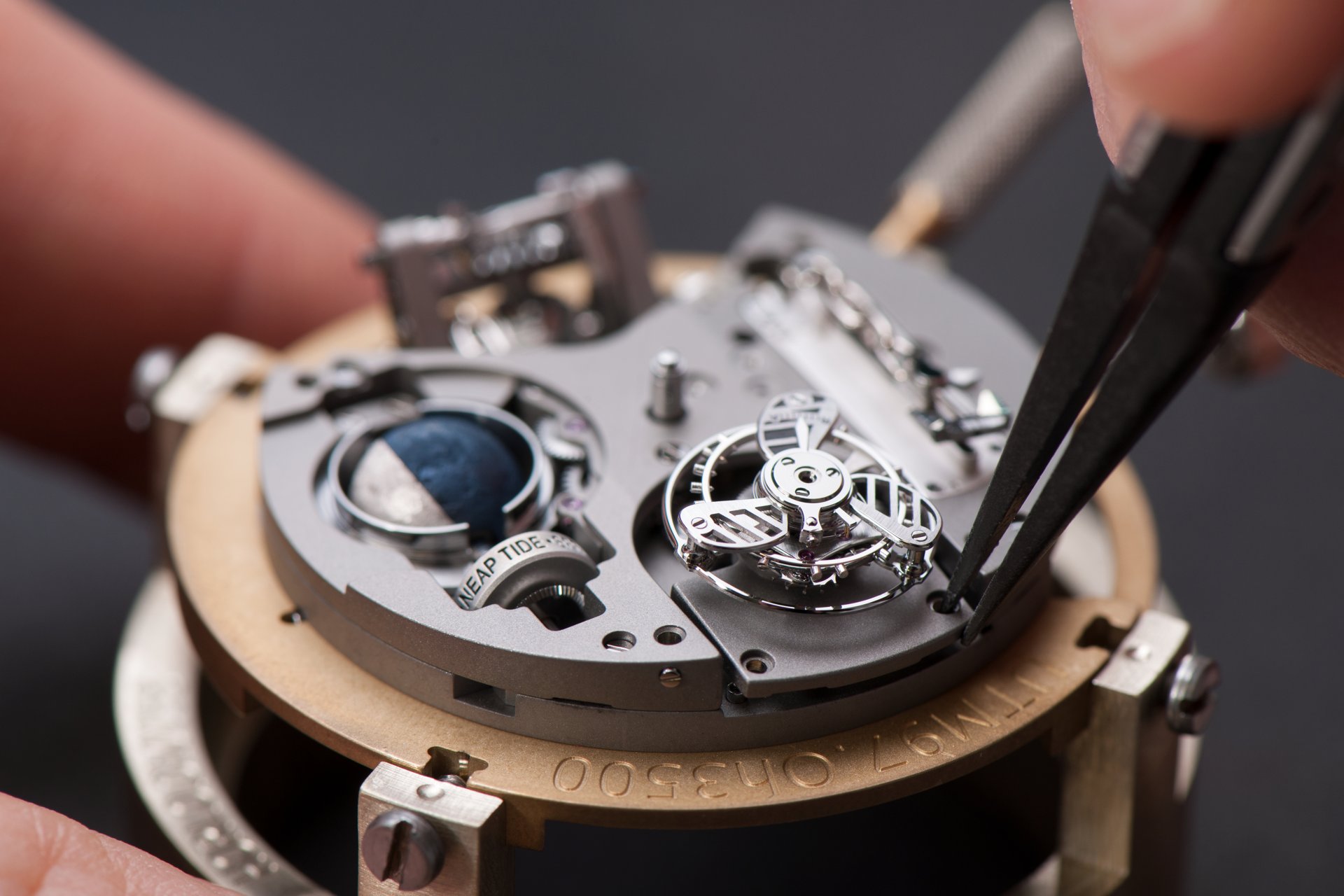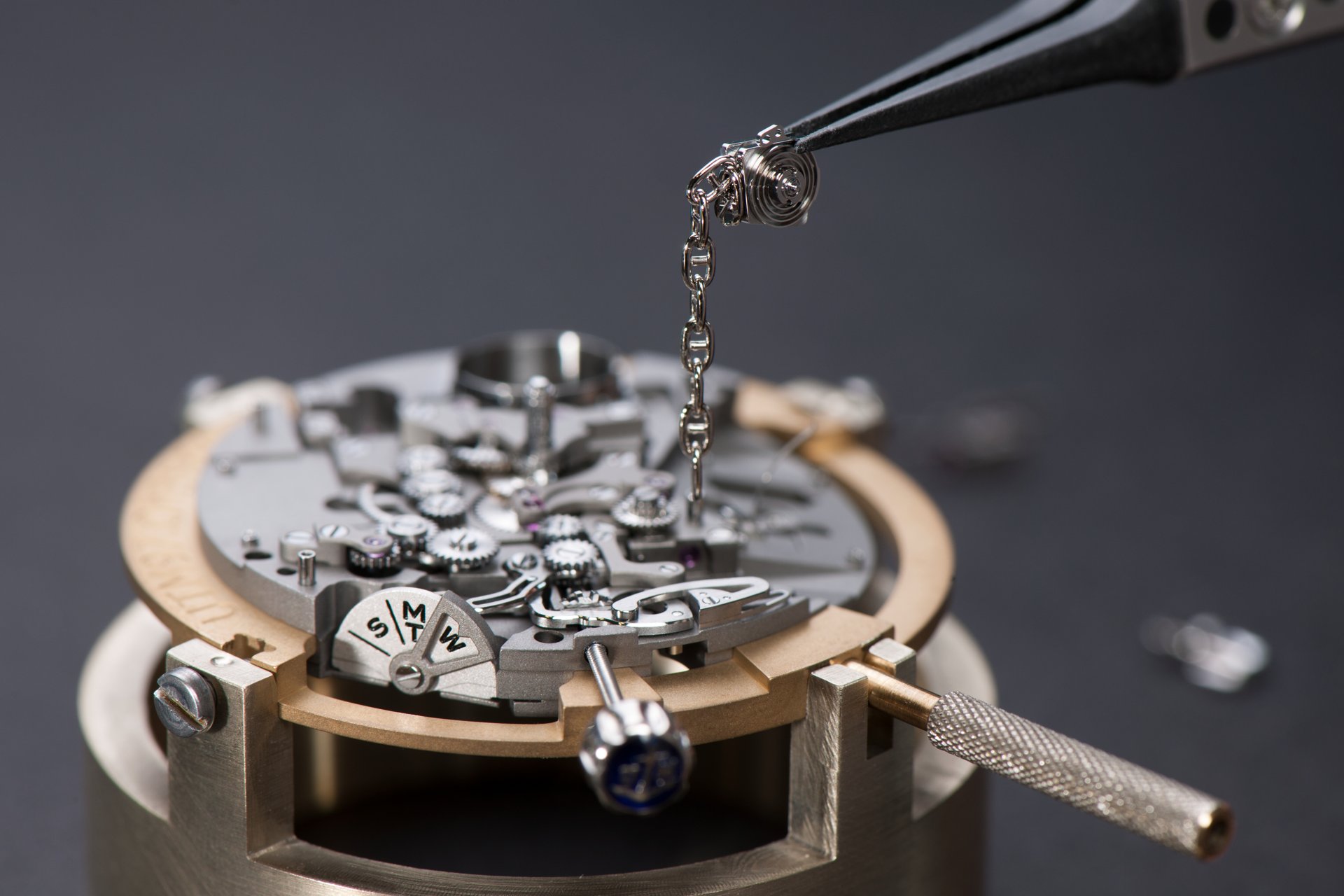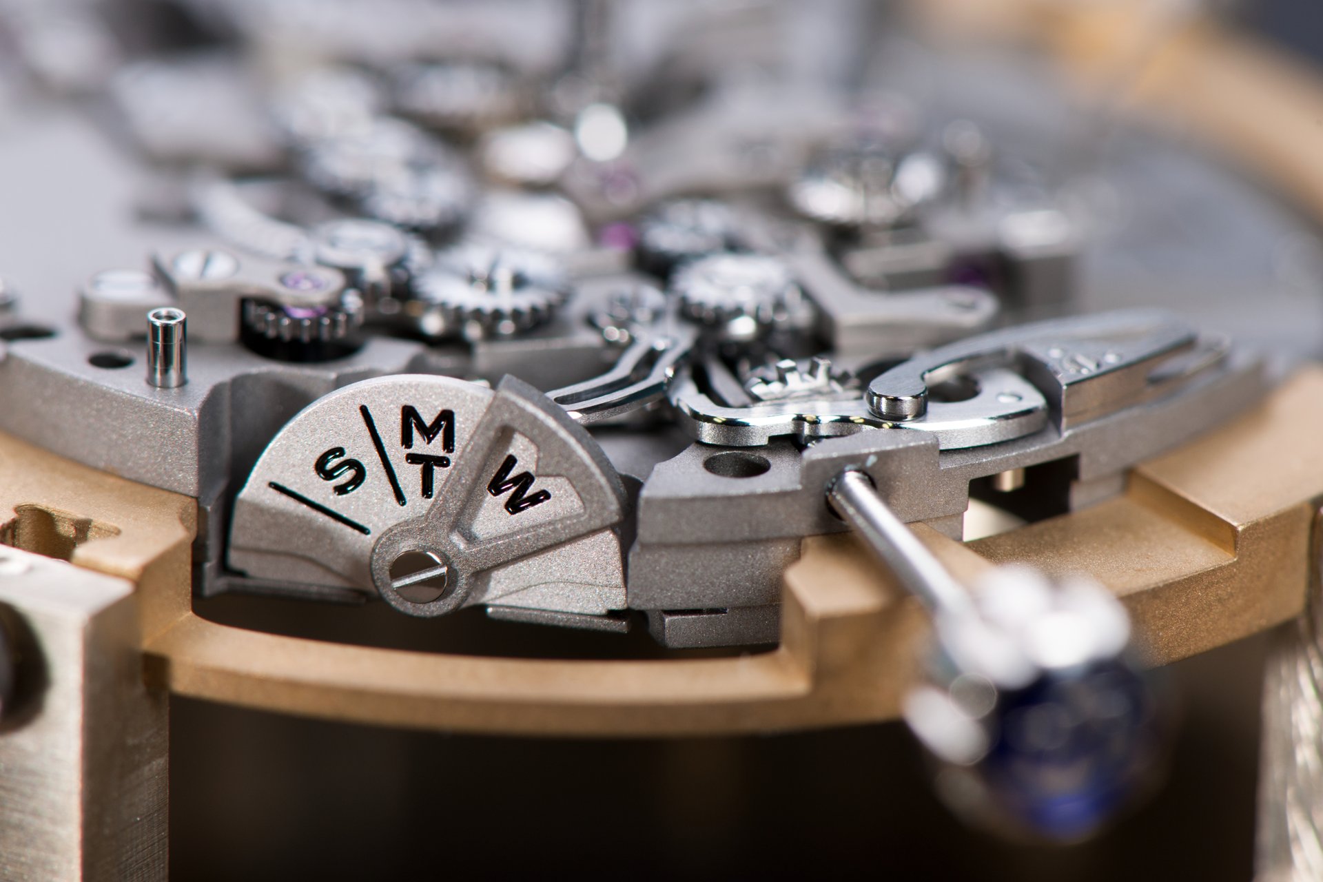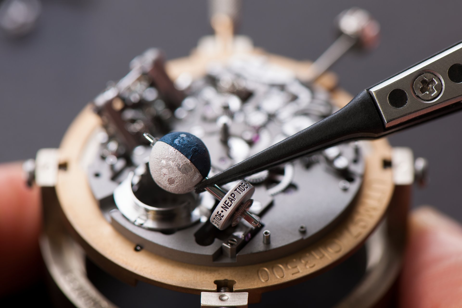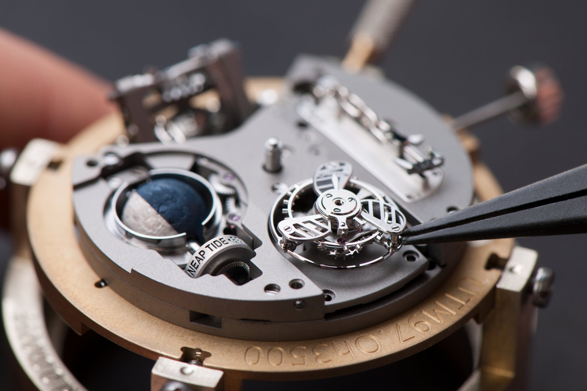 Its adjustment in relation to the annual calendar is undertaken through the winding-crown. A telegraph window opened in the side of the watch-band indicates its position (S: Set position for setting the hands/TM: Tide and Moon position/W: position for winding the movement). In the intermediate position, the Moon phase and tide volume indication is regulated by turning the crown counter-clockwise (one turn of the crown represents four days), while in the clockwise direction the operator regulates the level of the tide depending on his location (one turn of the crown represents a 0.25 turn of the disk, equivalent to 9.5 hours).