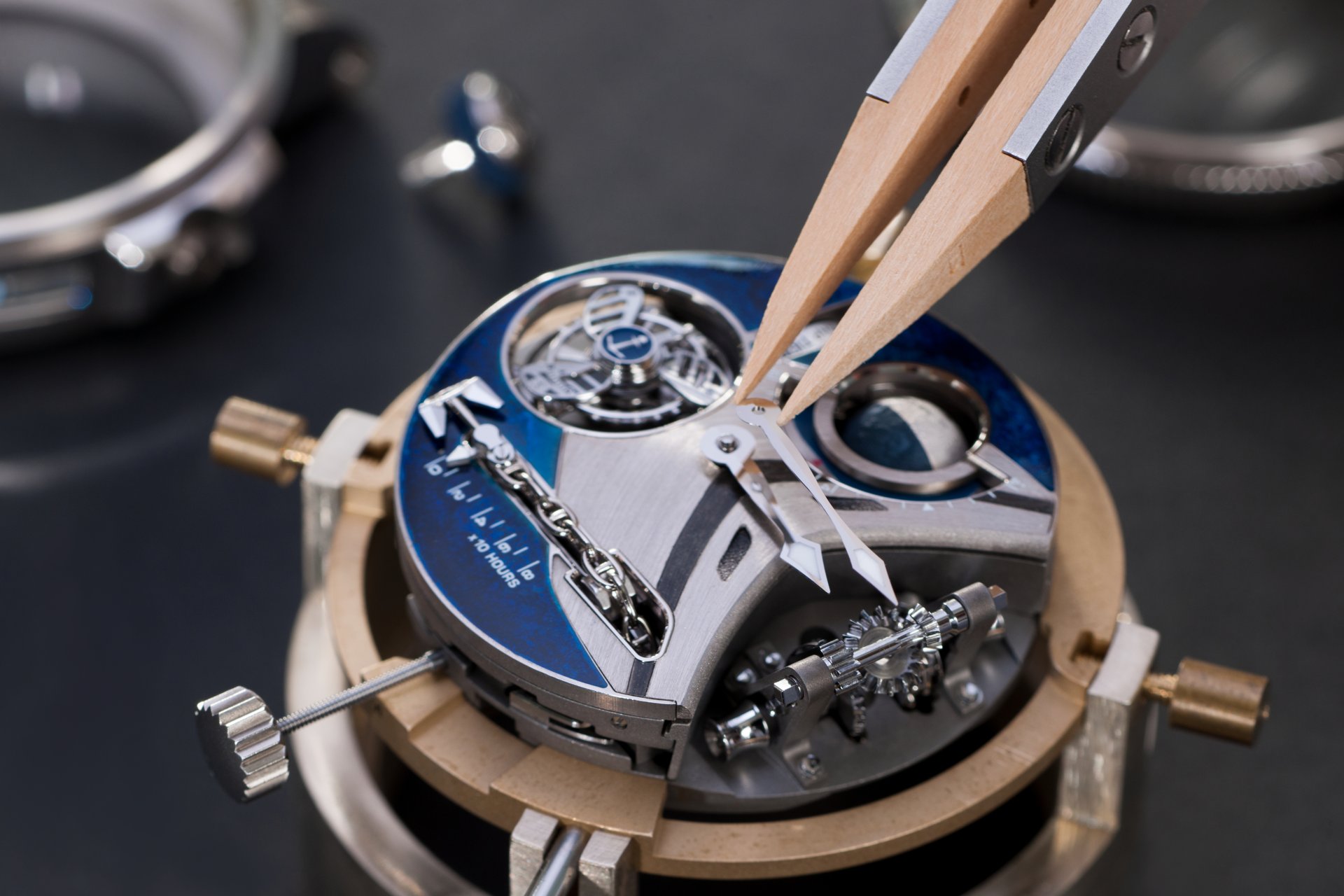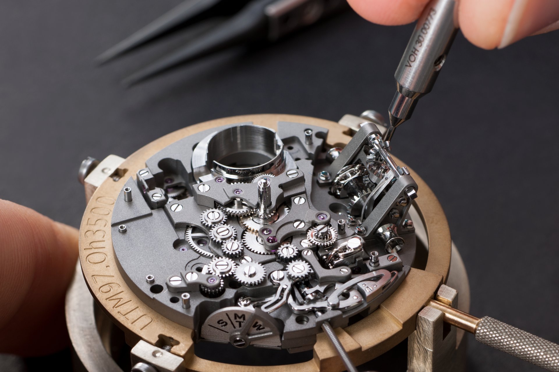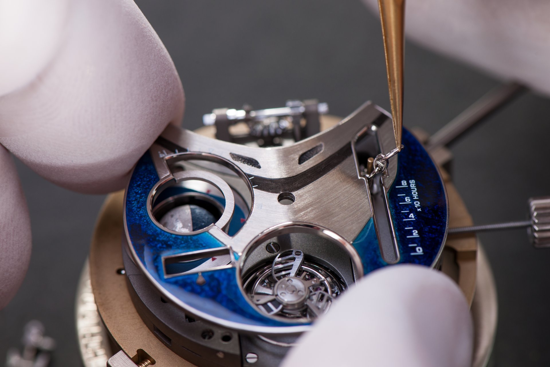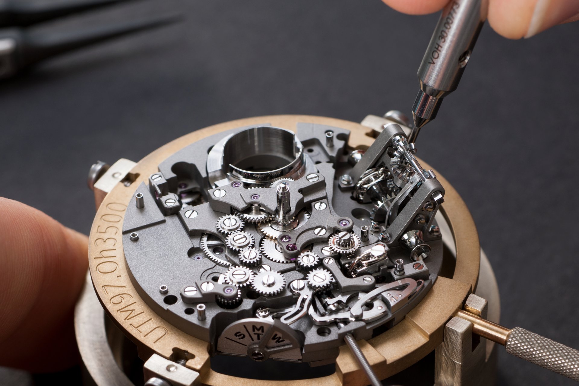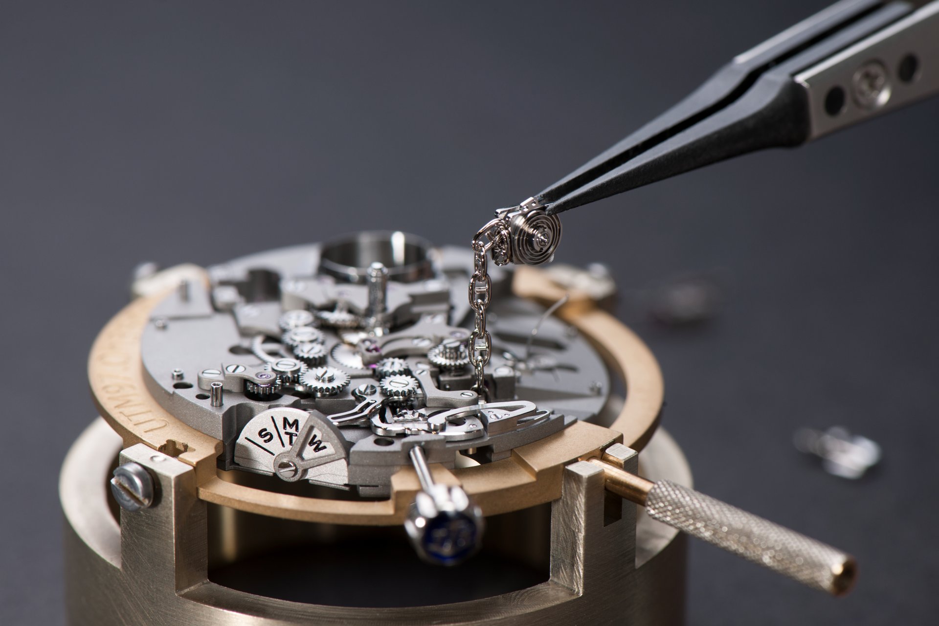 Its adjustment in relation to the annual calendar is undertaken through the winding-crown. A telegraph window opened in the side of the watch-band indicates its position (S: Set position for setting the hands/TM: Tide and Moon position/W: position for winding the movement). In the intermediate position, the Moon phase and tide volume indication is regulated by turning the crown counter-clockwise (one turn of the crown represents four days), while in the clockwise direction the operator regulates the level of the tide depending on his location (one turn of the crown represents a 0.25 turn of the disk, equivalent to 9.5 hours).