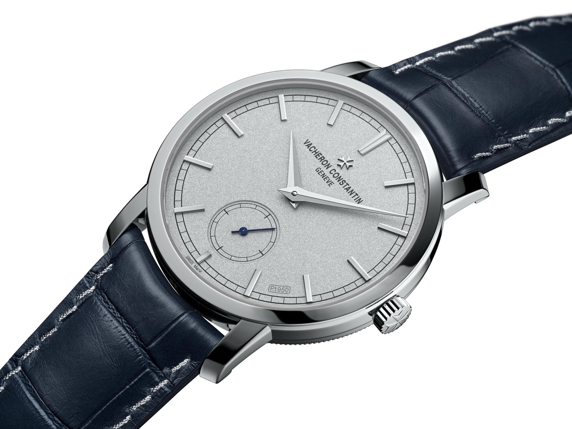 With the exception of the hour-markers and hands crafted from white gold, the entire watch – case, dial, crown and strap buckle – is made of 950 platinum. Adding an ultimate touch of refinement, the stitching of the dark blue alligator leather strap is created from interwoven platinum and silk thread.