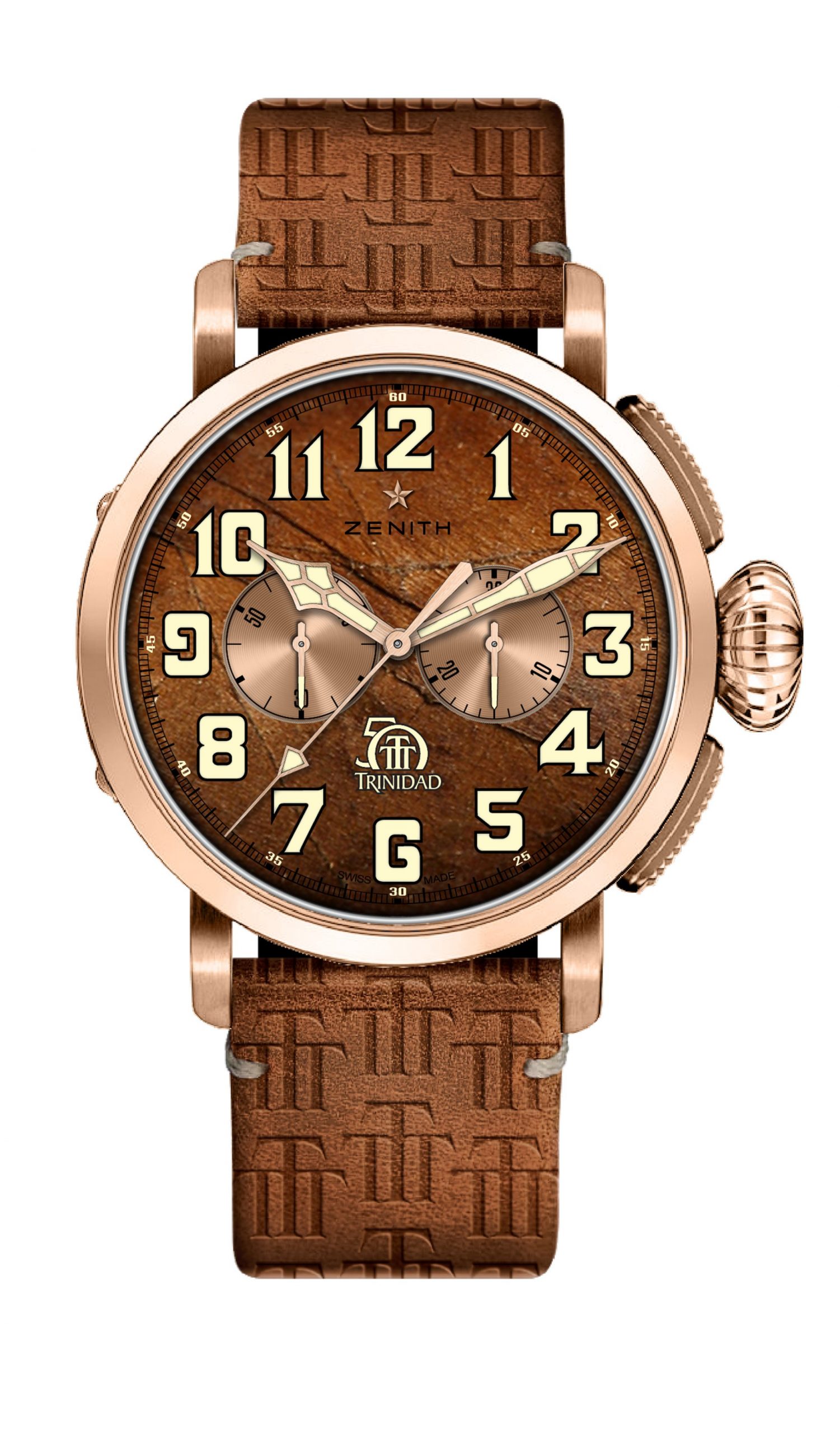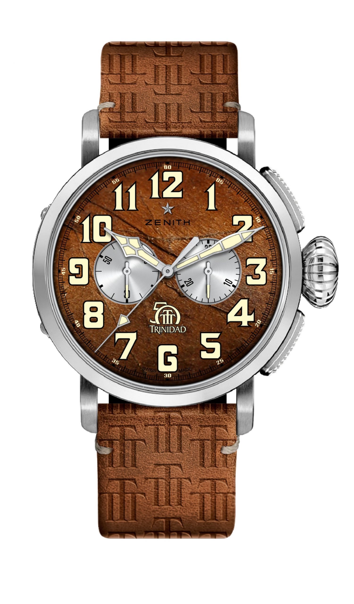 Beating inside is the automatic El Primero column-wheel chronograph movement, a descendant of the world’s most accurate series-made chronograph calibre that also turns 50 in 2019. It drives the central hours and minutes, small seconds and chronograph functions, displayed on a clearly legible dial bearing oversized beige luminescent numerals, a distinctive tobacco leaf pattern as well as Zenith and Trinidad logos.