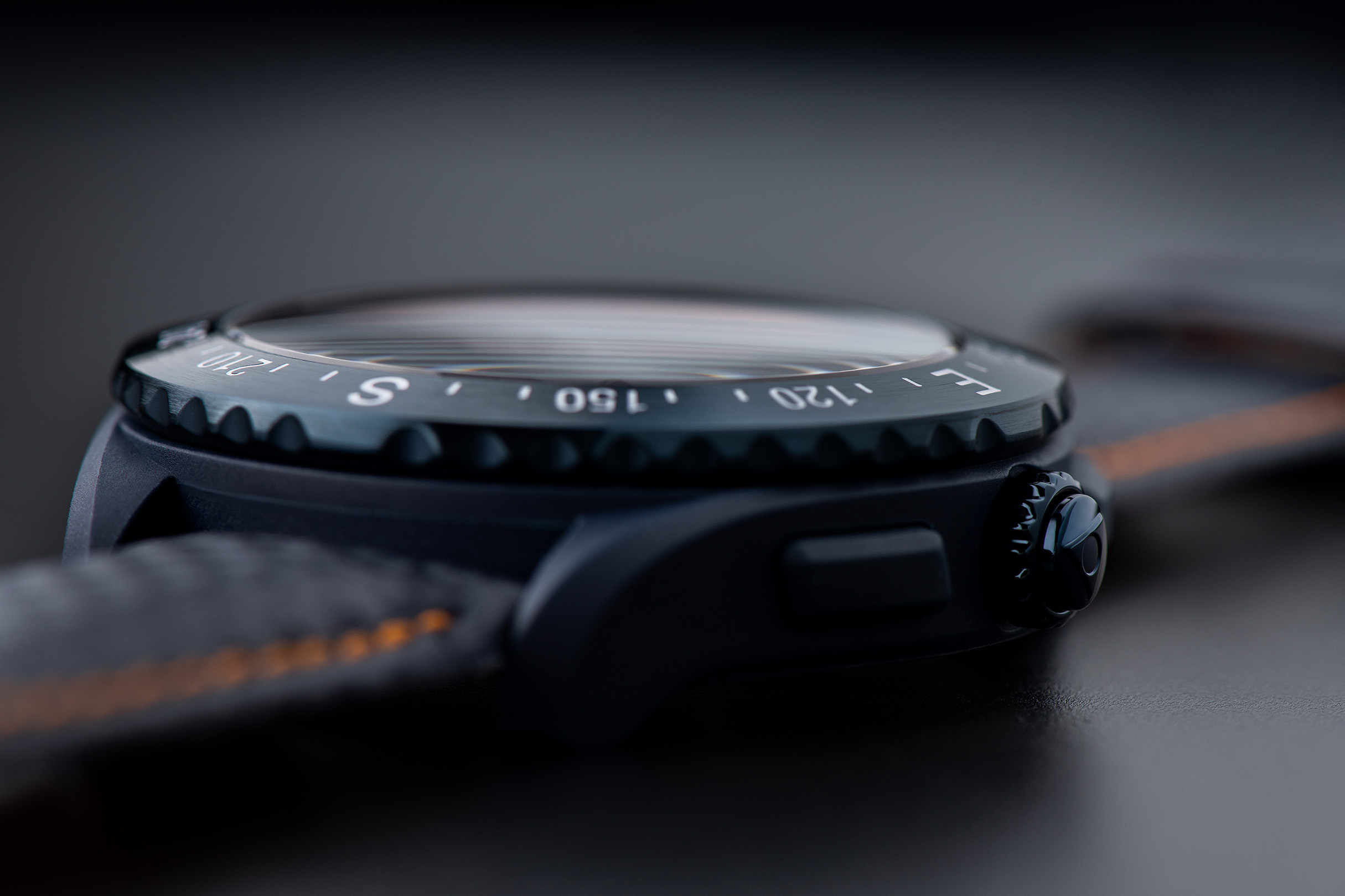 Navy blue leather strap with orange stitching and lining