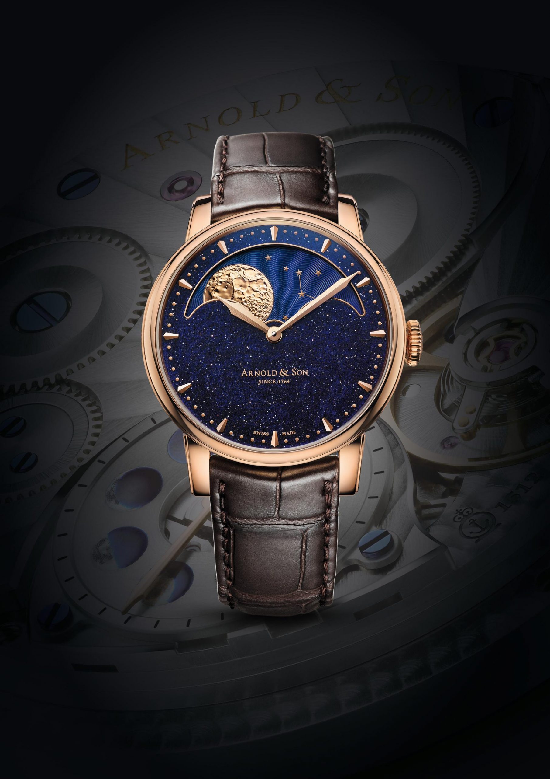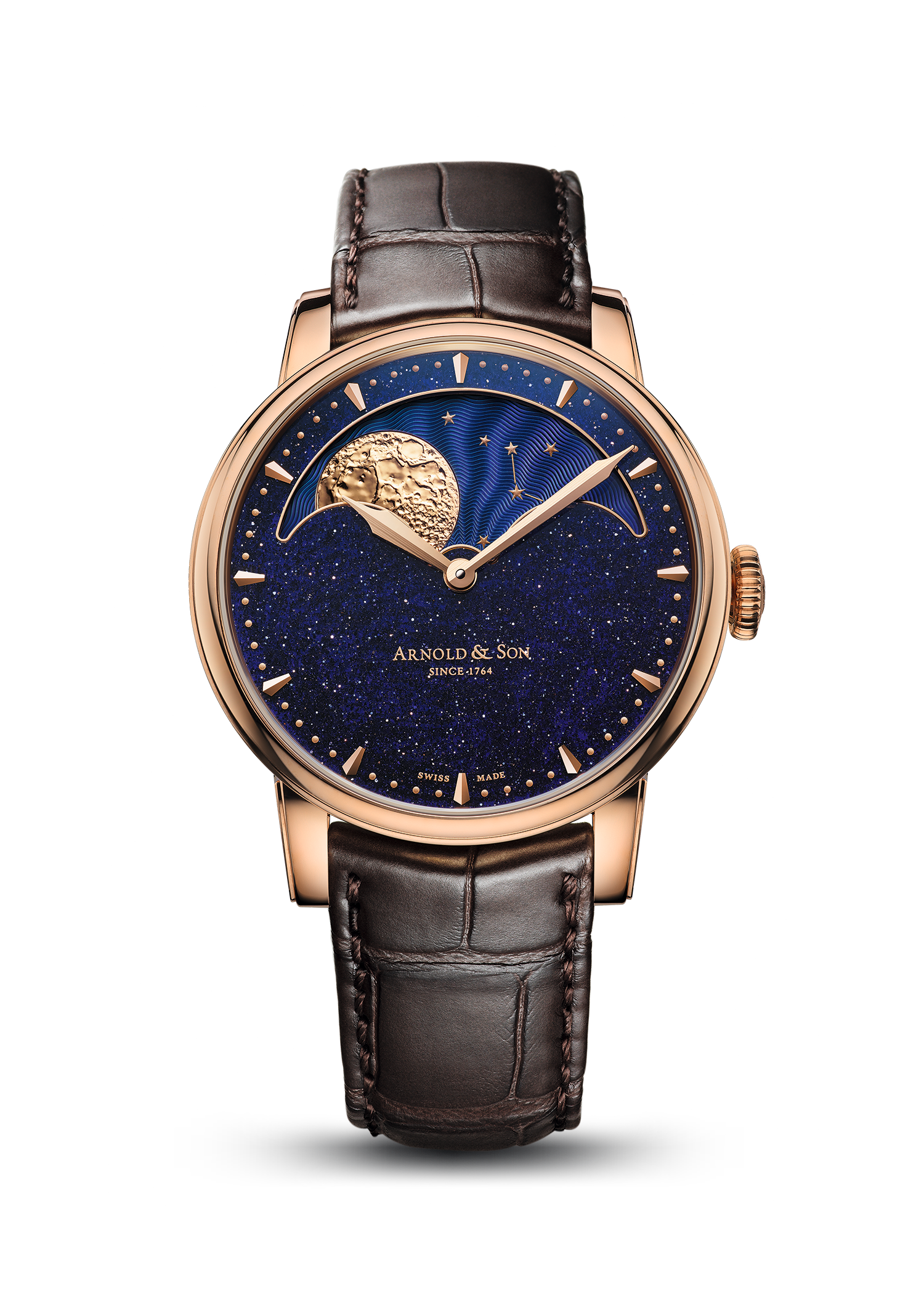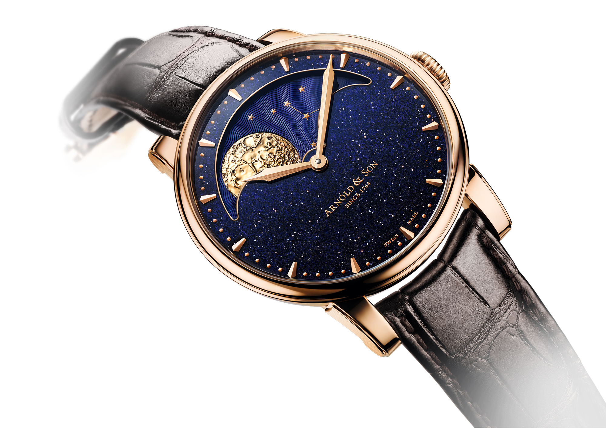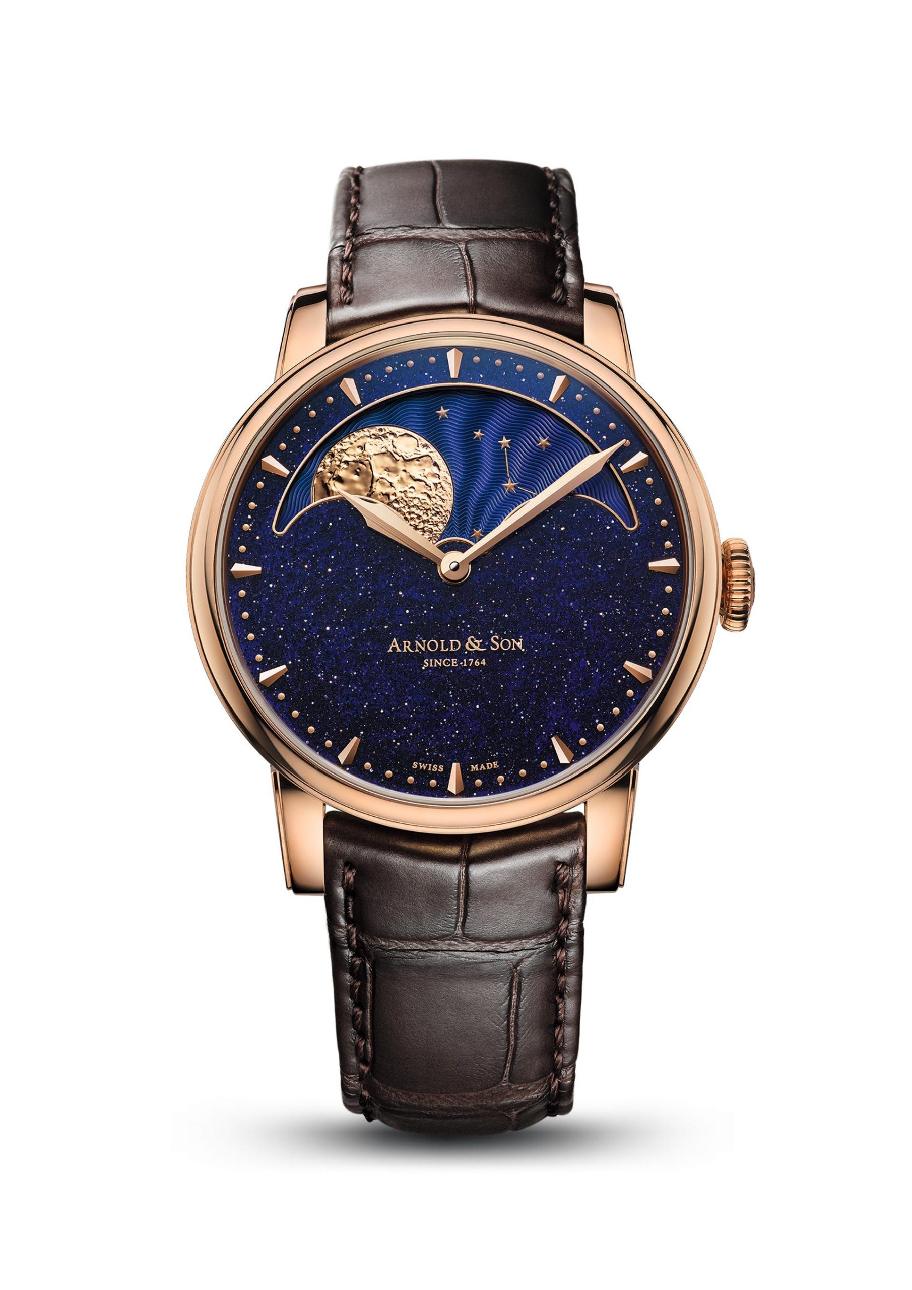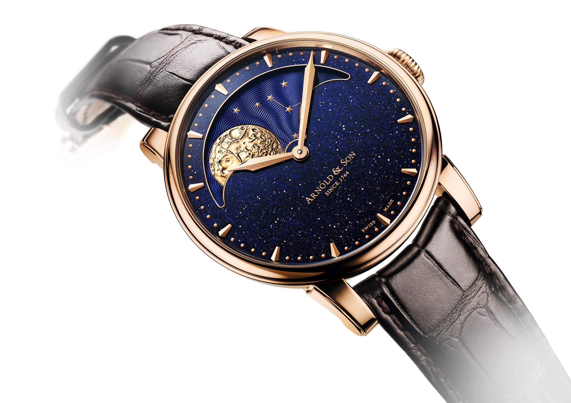 The HM Perpetual Moon Aventurine offers a spectacular solid gold moon phase beautifully harmonising with a sparkling blue aventurine quartz dial and paired with an in-house Arnold & Son mechanical calibre.
