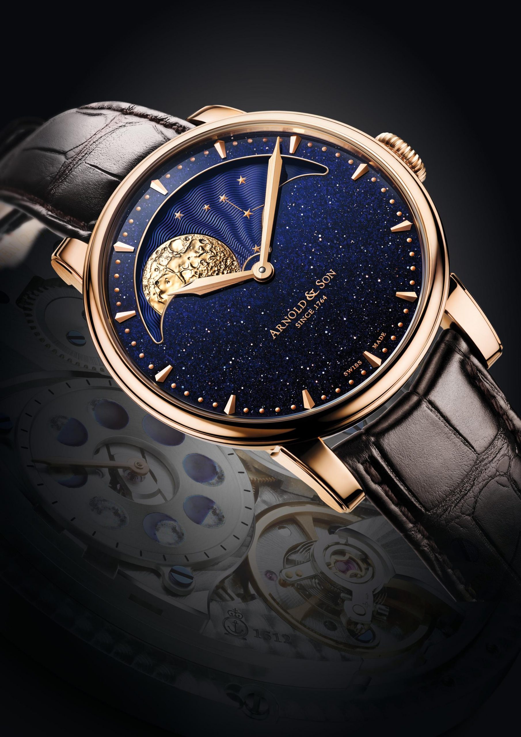 The timepiece houses the exclusive Arnold & Son mechanical hand-wound calibre A&S1512 exclusively developed for the moon phases complication and equipped with a double barrel to yield a 90-hour power reserve. This movement supply a precision moon phase with one day deviation every 122 years and offers a unique easy-to-set feature thanks to the addition of a second moon pahses indicator visible through the transparent case back.