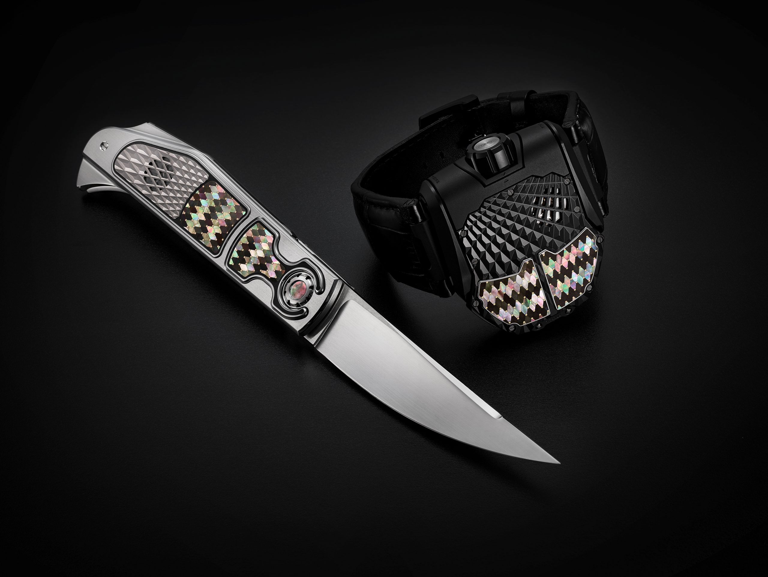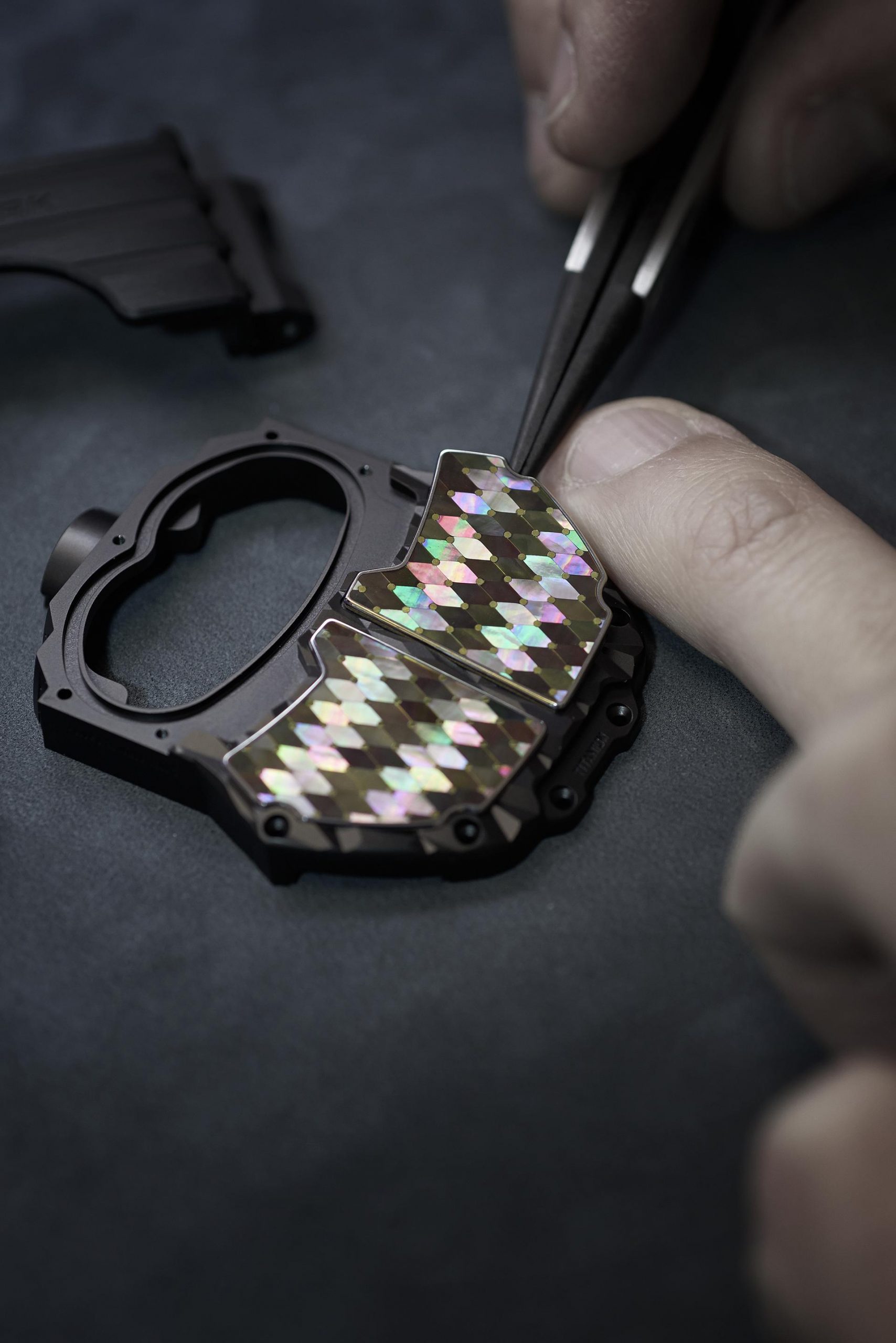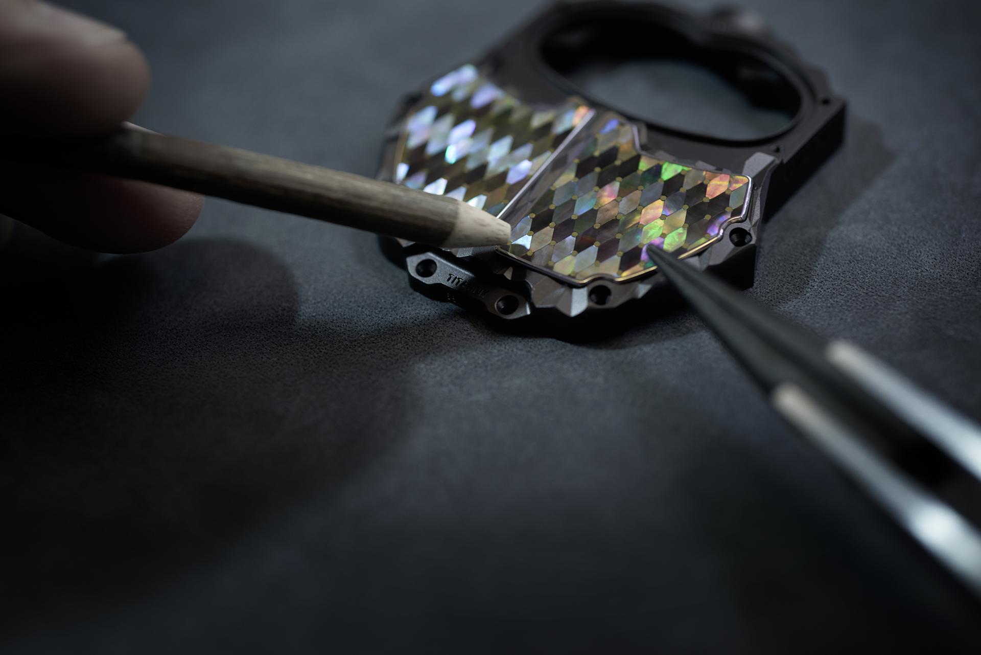 “The UR-T8 watch Colibri case features the same mosaic inlay technique used in the folding knife’s inlays. Hundreds of individual pieces of black-lip mother of pearl were cut into diamond shapes then hand-sorted and arranged according to how each reflects the light. The resulting mosaic inlay oscillates between light and dark with movement. Pins in 18k gold accentuate each pearl intersection, and the two mosaic inlays are set into stainless steel frames and housed in the 3-Dsculpted titanium watchcase.
