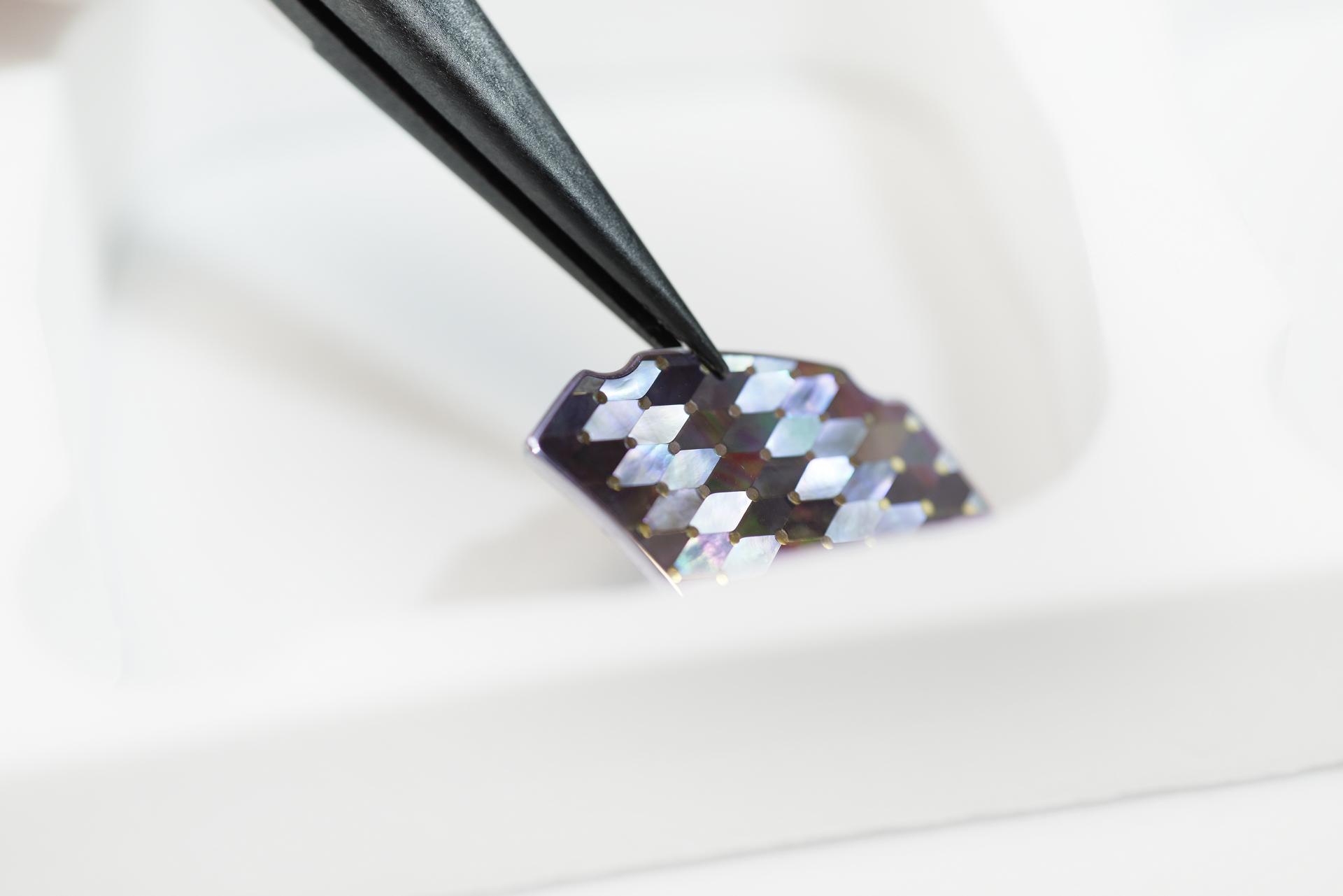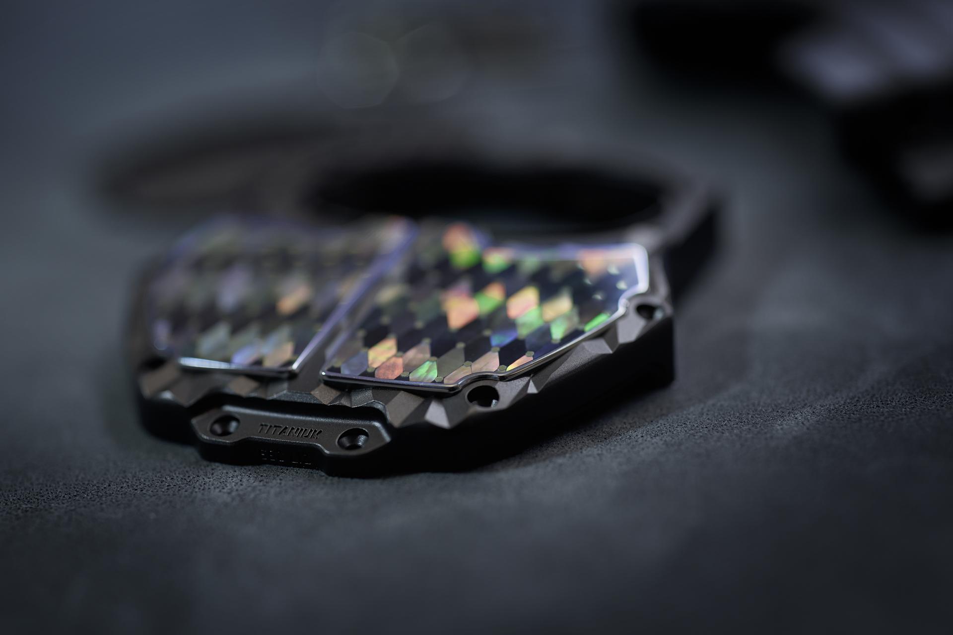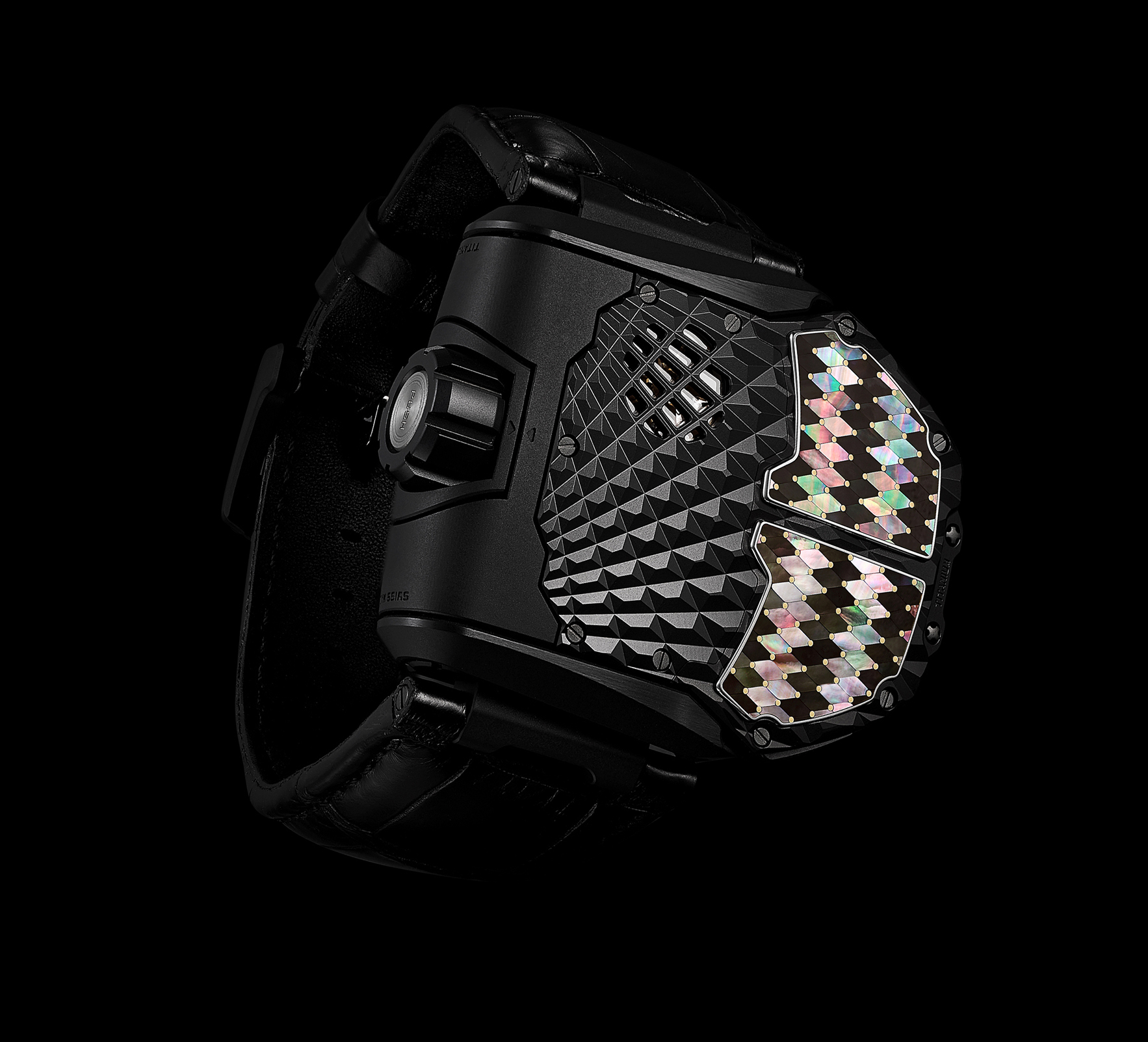 “The UR-T8 watch Colibri case features the same mosaic inlay technique used in the folding knife’s inlays. Hundreds of individual pieces of black-lip mother of pearl were cut into diamond shapes then hand-sorted and arranged according to how each reflects the light. The resulting mosaic inlay oscillates between light and dark with movement. Pins in 18k gold accentuate each pearl intersection, and the two mosaic inlays are set into stainless steel frames and housed in the 3-Dsculpted titanium watchcase.