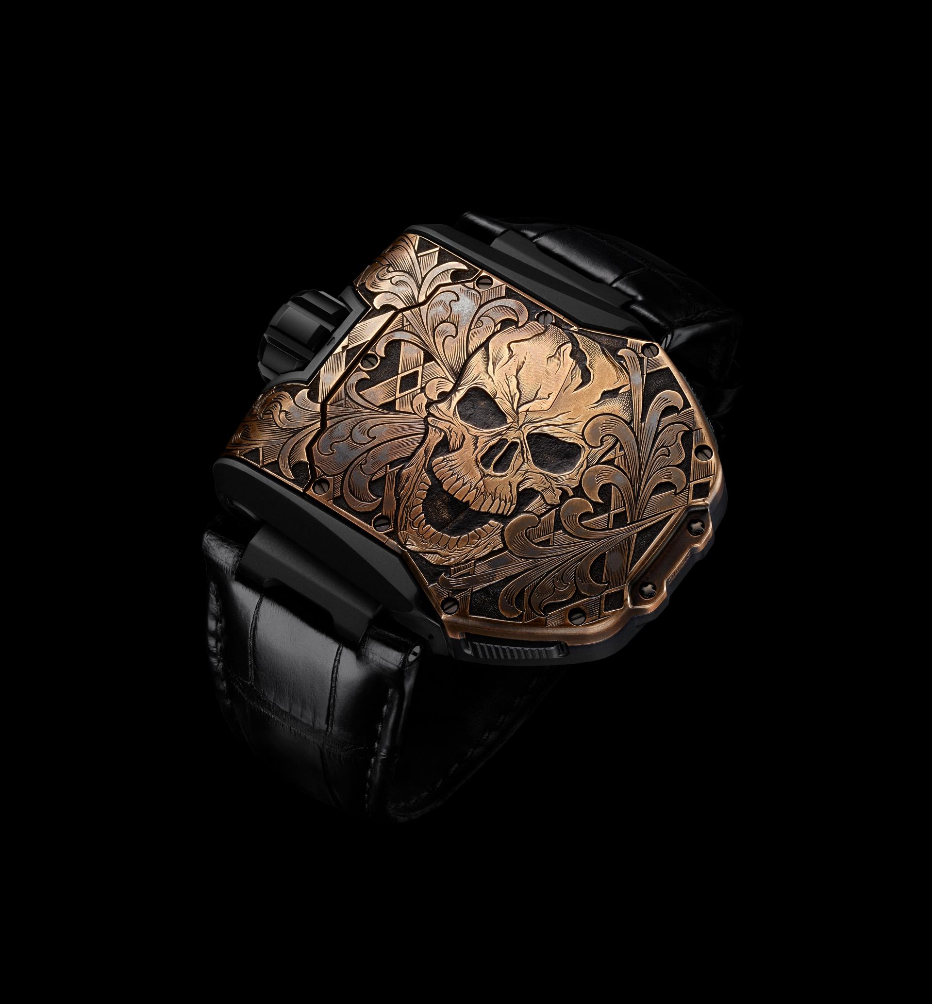 When he learned that he was to work on the UR-T8, he did notthink twice. “I love the UR-T8. It’s one of my favourite URWERKs — what a canvas! I drew my design and chopped and changed scrolls until I loved it; I wanted to be able to say I would love to wear that myself.” The creative process was to take months. “After the design was ready I scaled everything down to the exact size of the UR-T8. The first thing I always do is cut every outline that includes the scrolls and skull. The next stage for me is the background. I carve everything away to the depth I feel works best. This the most time consuming part of the whole project for me, removing the background carefully under the microscope to make sure I don’t over run into the important parts such as the scroll areas or the skull. There is no going back if you make a mistake. Once this process is done, I get to do my favourite part, the shading.