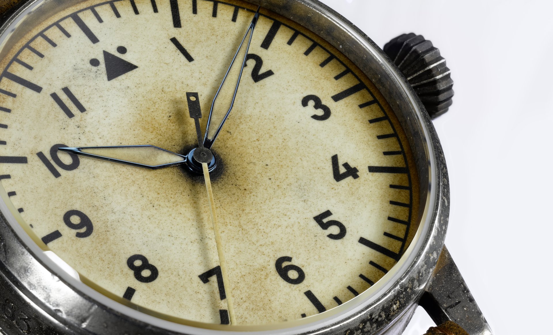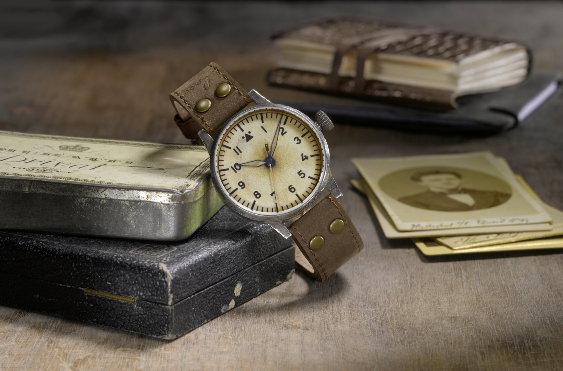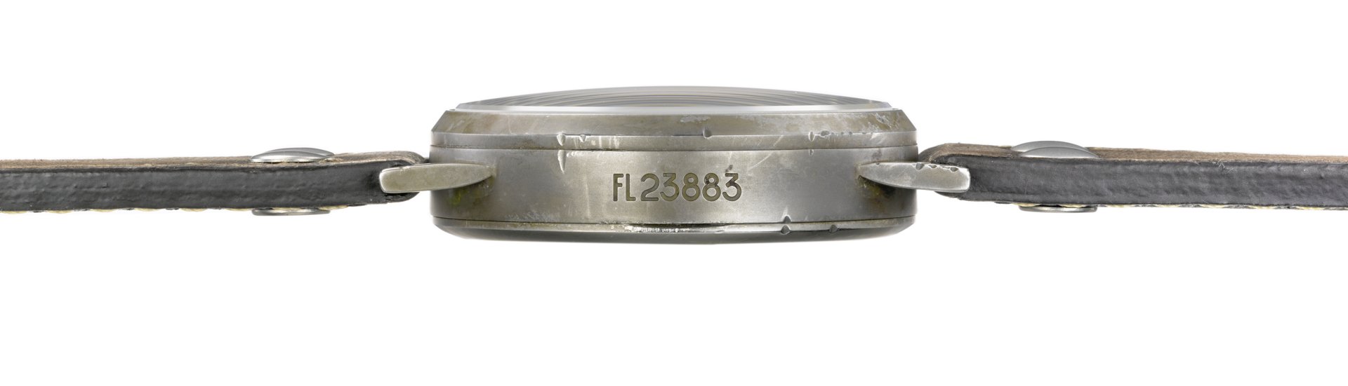 Case: Stainless steel, elaborately hand-finished in an antique look, ø 39 mm, height 12 mm, lug width 20 mm, water resistant up to 5 ATM, double curved sapphire crystal, antireflecting coat, sidewise marking FL 23883, case-back with B-Uhr marking, crown execution according original B-Uhr, every watch case is absolutely unique