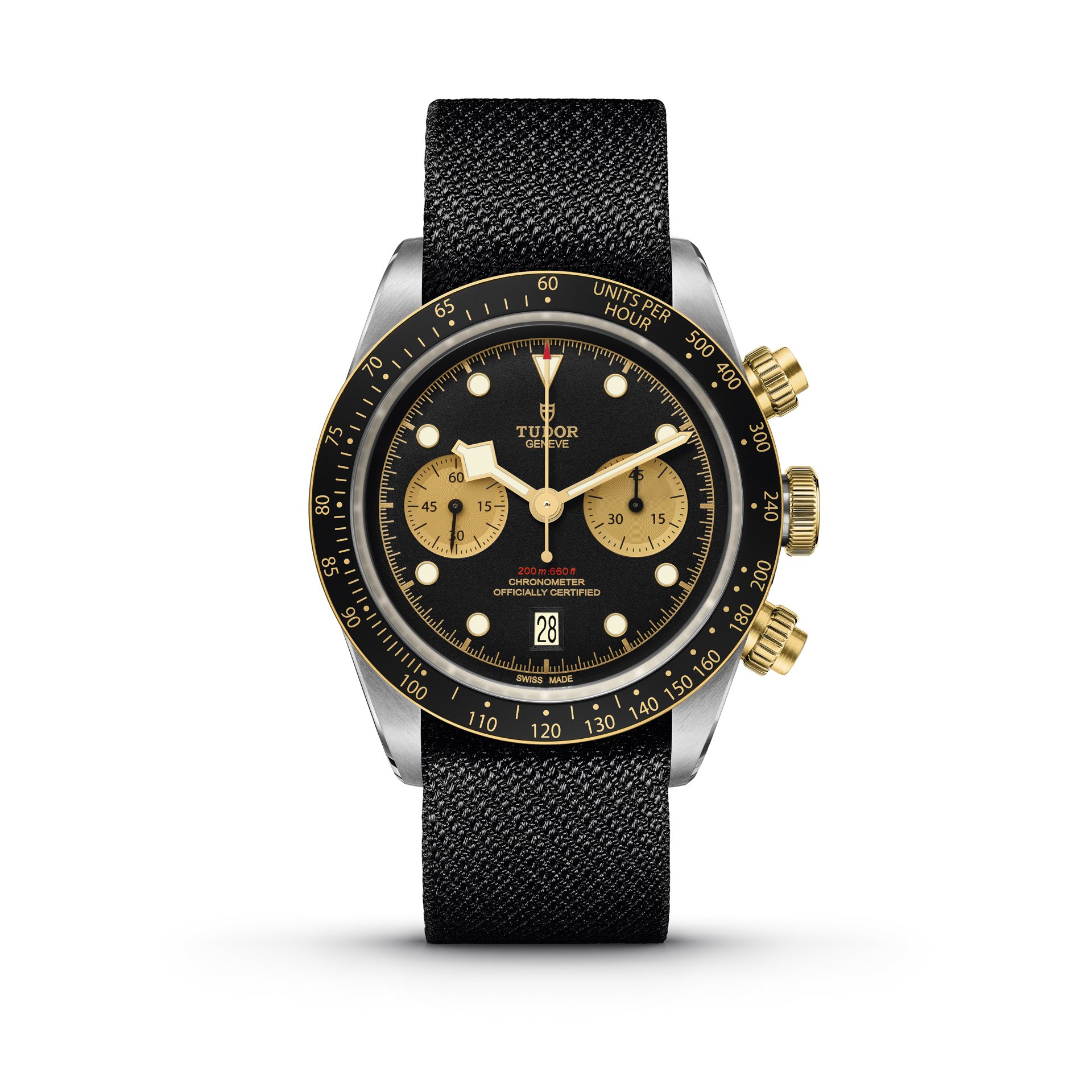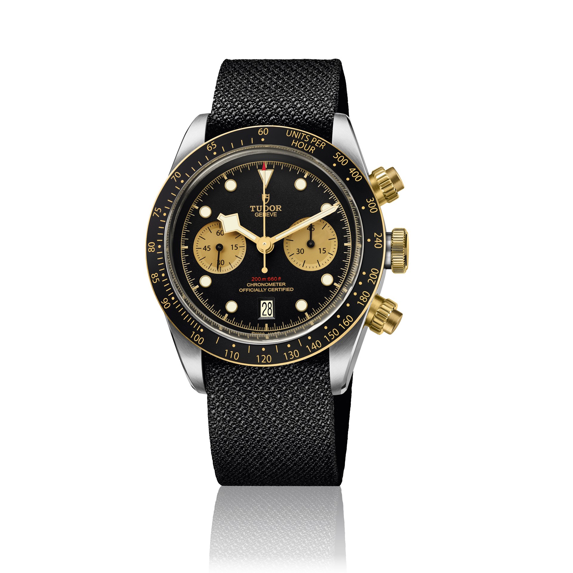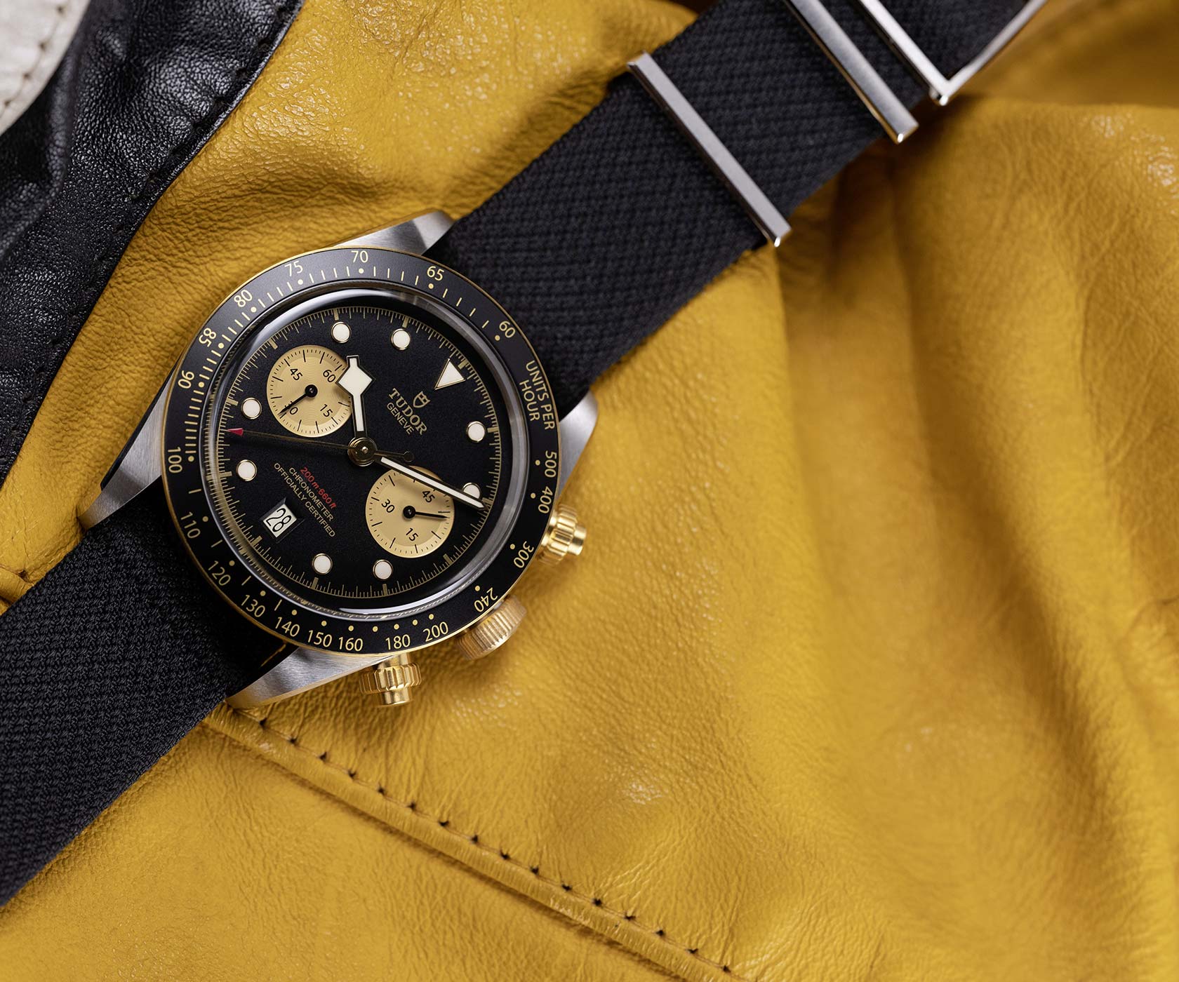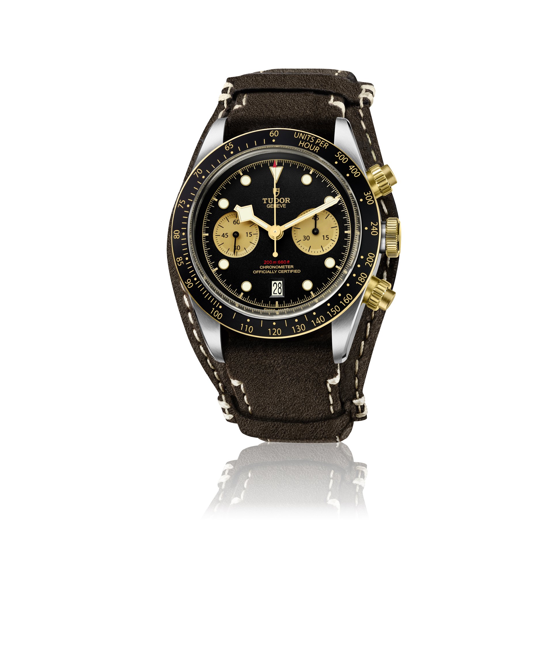 The fabric strap is one of the signatures of TUDOR, which remains one of the first watch brands to offer it. Woven on 19th-century Jacquard looms by a 150-year-old family firm from the region of St-Etienne, its manufacturing quality and comfort on the wrist are unique. The Black Bay Chrono model presents a black strap, chosen by TUDOR and woven by the firm. The model is also available with a steel and yellow gold bracelet inspired by the folding riveted bracelets of TUDOR watches produced in the 1950’s and 60’s. These were famous for having rivet heads for attaching the links, shown on the side of the bracelet as well as a stepped construction. These two aesthetic details are incorporated into the new model, integrating modern manufacturing methods using solid links. Finally, in a spirit of 1970’s racing, the Black Bay Chrono offers a bund type option in brown aged leather with ecru stitching and a folding clasp.