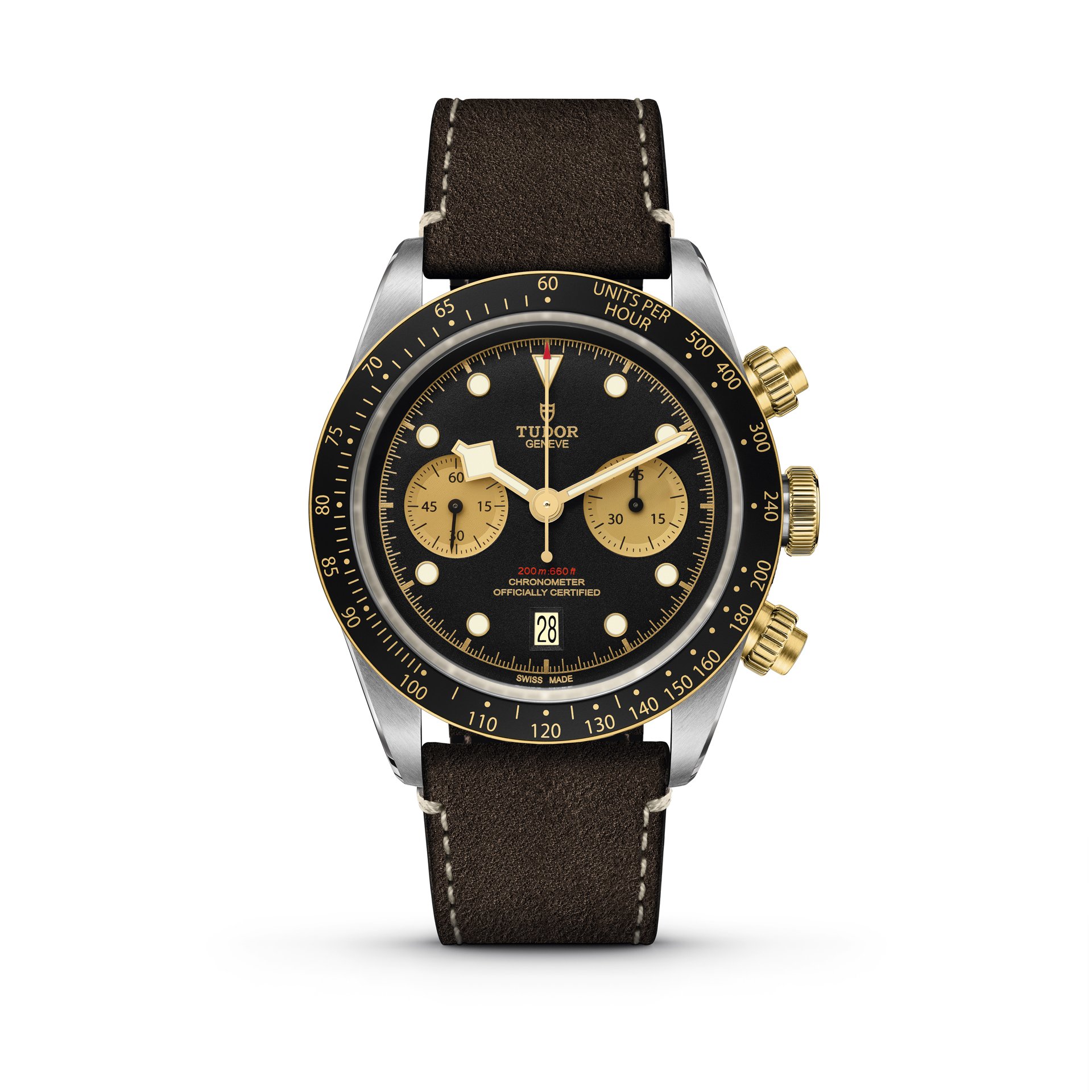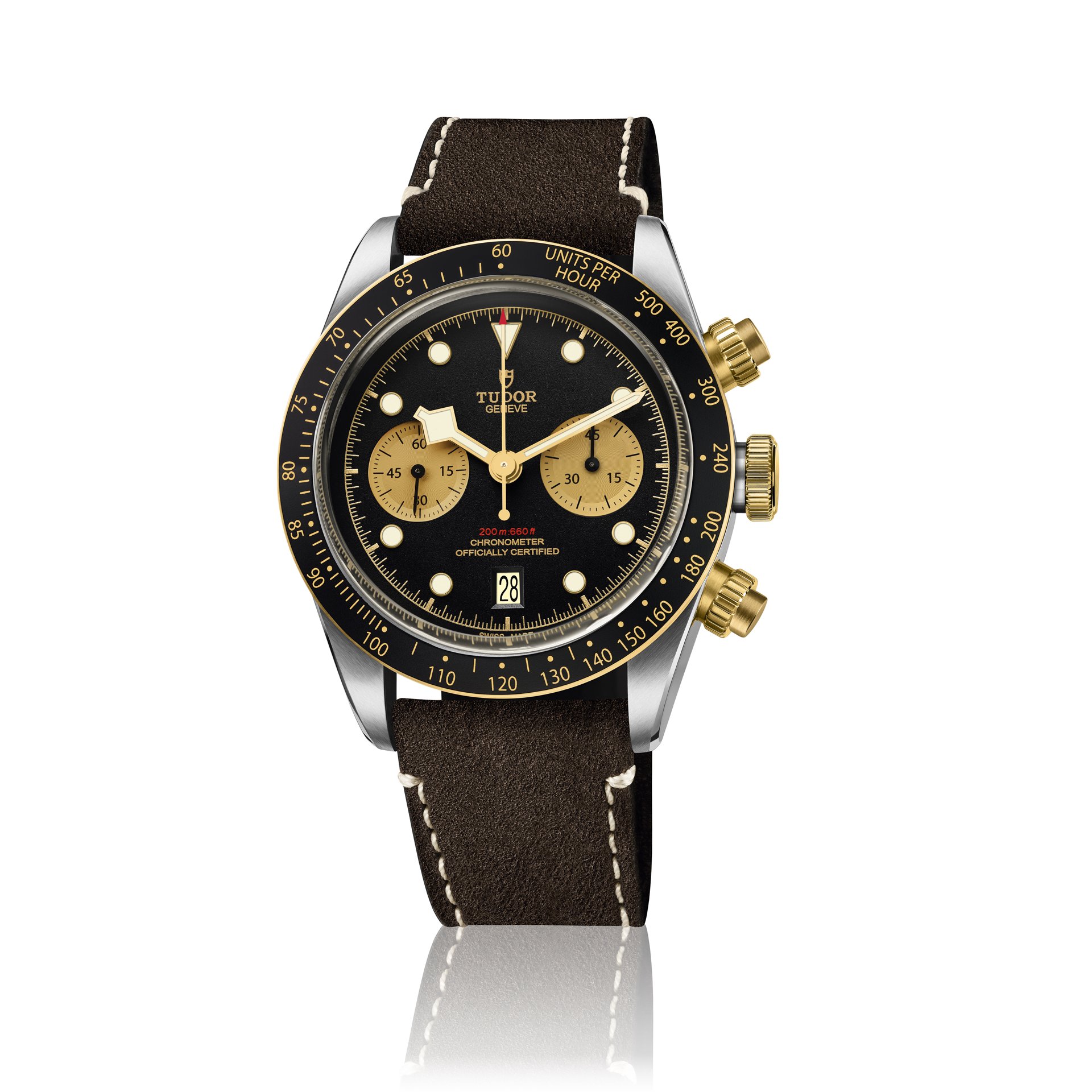 Remaining faithful to the Black Bay aesthetic, the Black Bay Chrono S&G model makes the famous “snowflake” hands – the signature of TUDOR divers’ watches since 1969 – its own in a gold version refined for optimum readability against the domed matt-black dial. Its counters are hollowed and their champagne colour creates optimum contrast. Following the TUDOR chronograph tradition, a date aperture is positioned at 6 o’clock. The main Black Bay characteristics are retained, in a slim 41-millimetre steel case and equipped with yellow-gold pushers inspired by the very first generation of TUDOR chronographs. A fixed bezel in yellow gold with a black anodised aluminium insert and tachymetric scale completes the face of this elegant, sporty chronograph.
