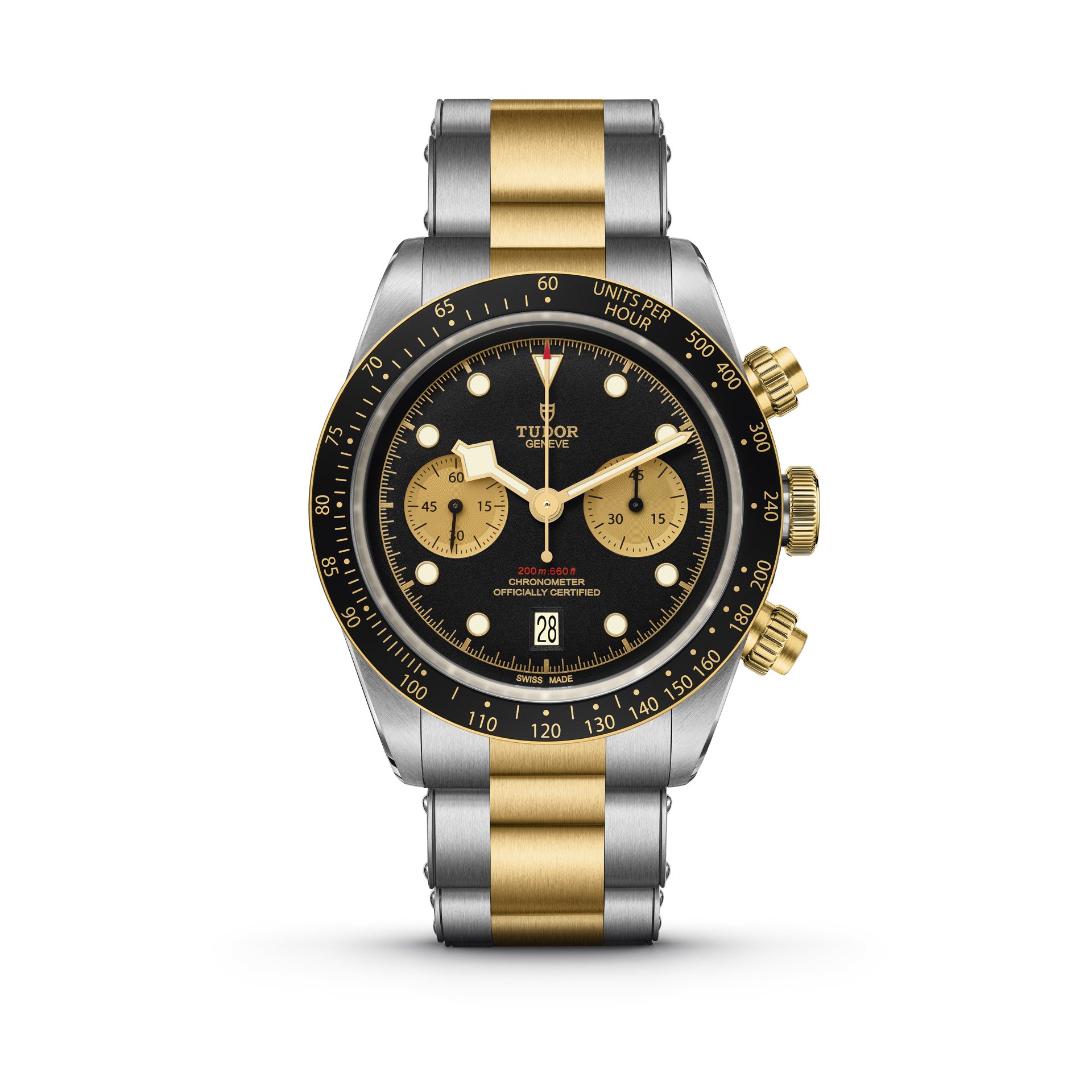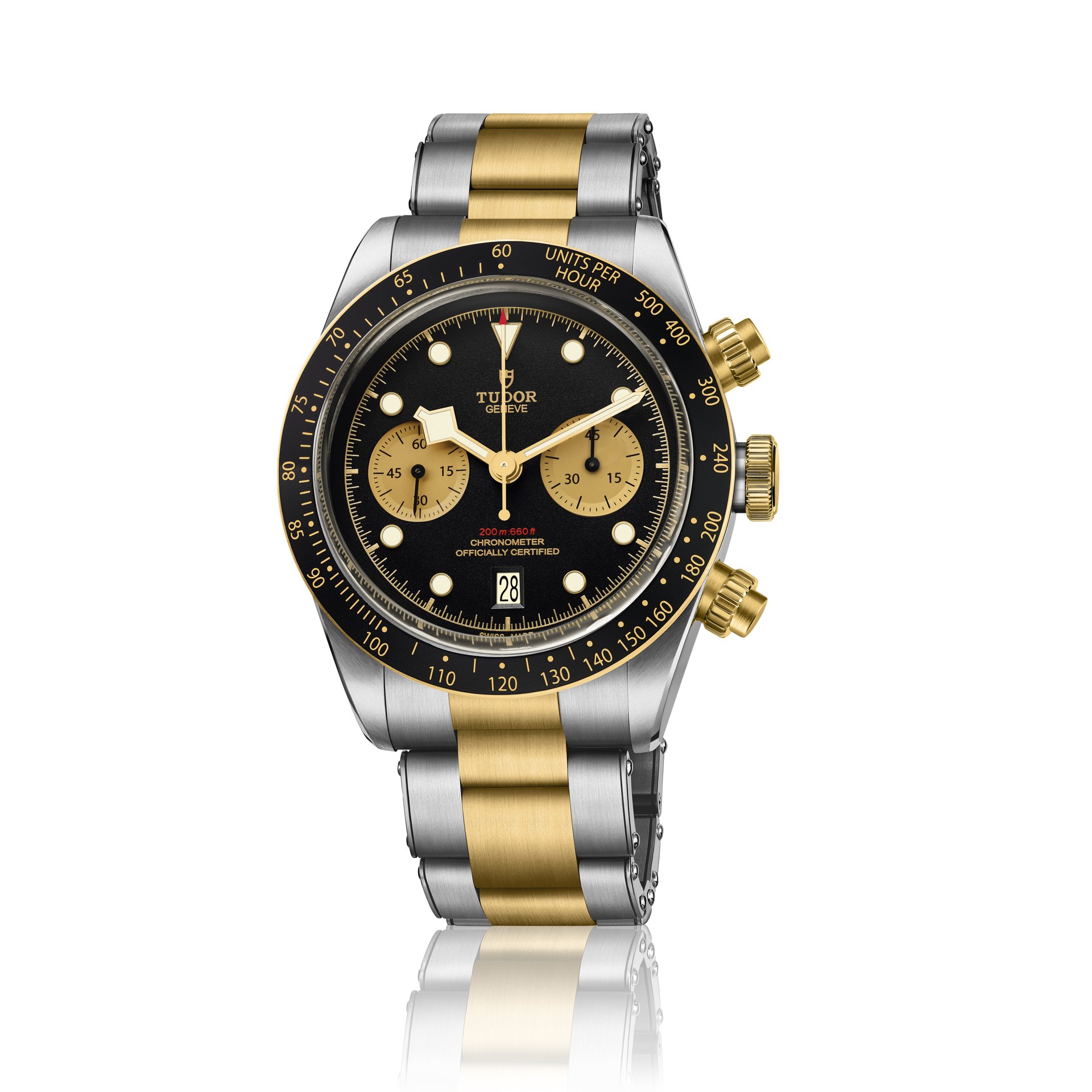 Since the presentation of TUDOR’s first chronograph in 1970, of the Prince Oysterdate, the brand has always produced watches that are closely tied to the world of motorsports. In the same way, since 1954 TUDOR has been constantly improving its professional divers’ watches. The daringly hybrid Black Bay Chrono S&G chronograph (S&G stands for Steel & Gold) combines this aquatic heritage, represented by the Black Bay family, with the queen of the racetrack, the chronograph, for a precious sporty-chic result with an undeniable touch of nostalgia.