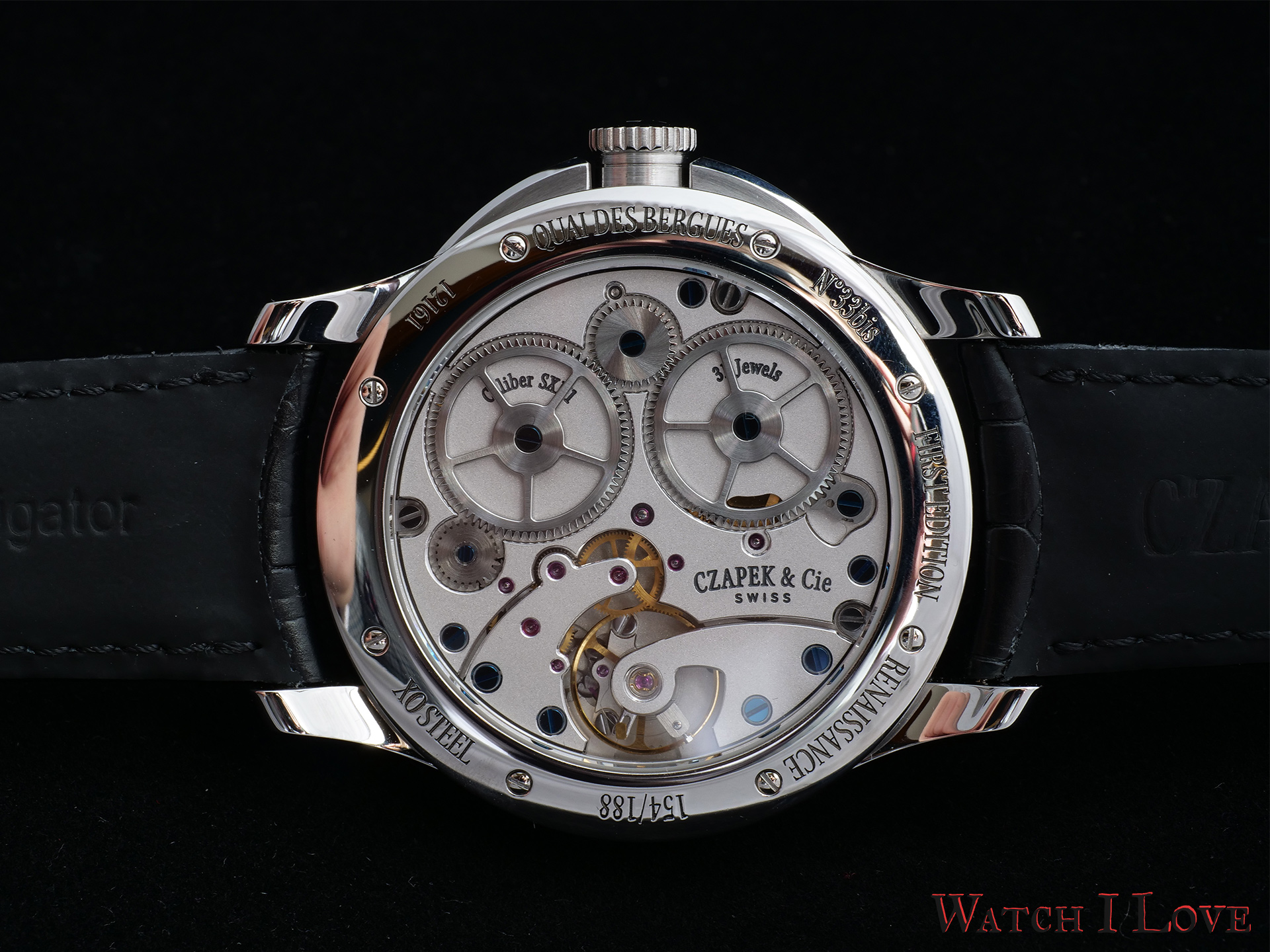 The “Midnight in Geneva” is powered by the in-house movement SXH1. The movement was realised in cooperation with Jean-François Mojon. A great name that is related to Chronode SA (its own company), Cyrus watches, MB&F, HYT, Harry Winston and others.