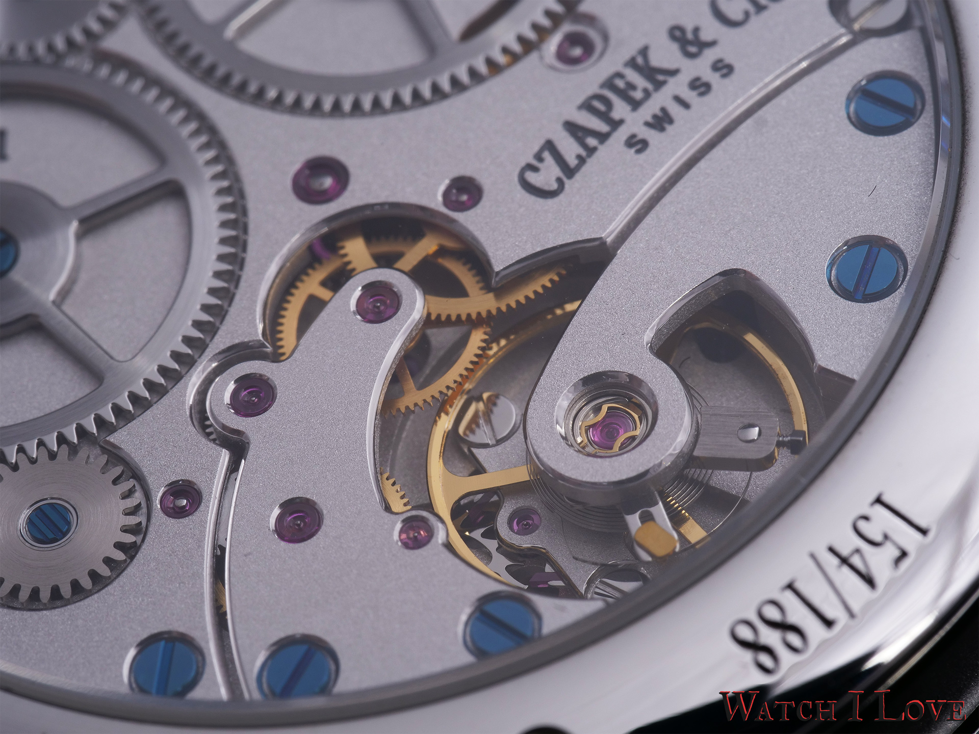 The movement is simple and delicately decorated. While the theme is mainly frosted, the SXH1 is covered in multiple finishes. The symmetrical architecture with open ratchets is a key feature of Czapek’s movement. These two wheels are polished, circular-grained and finely chamfered. The fixation is realised with thermally blued screws.