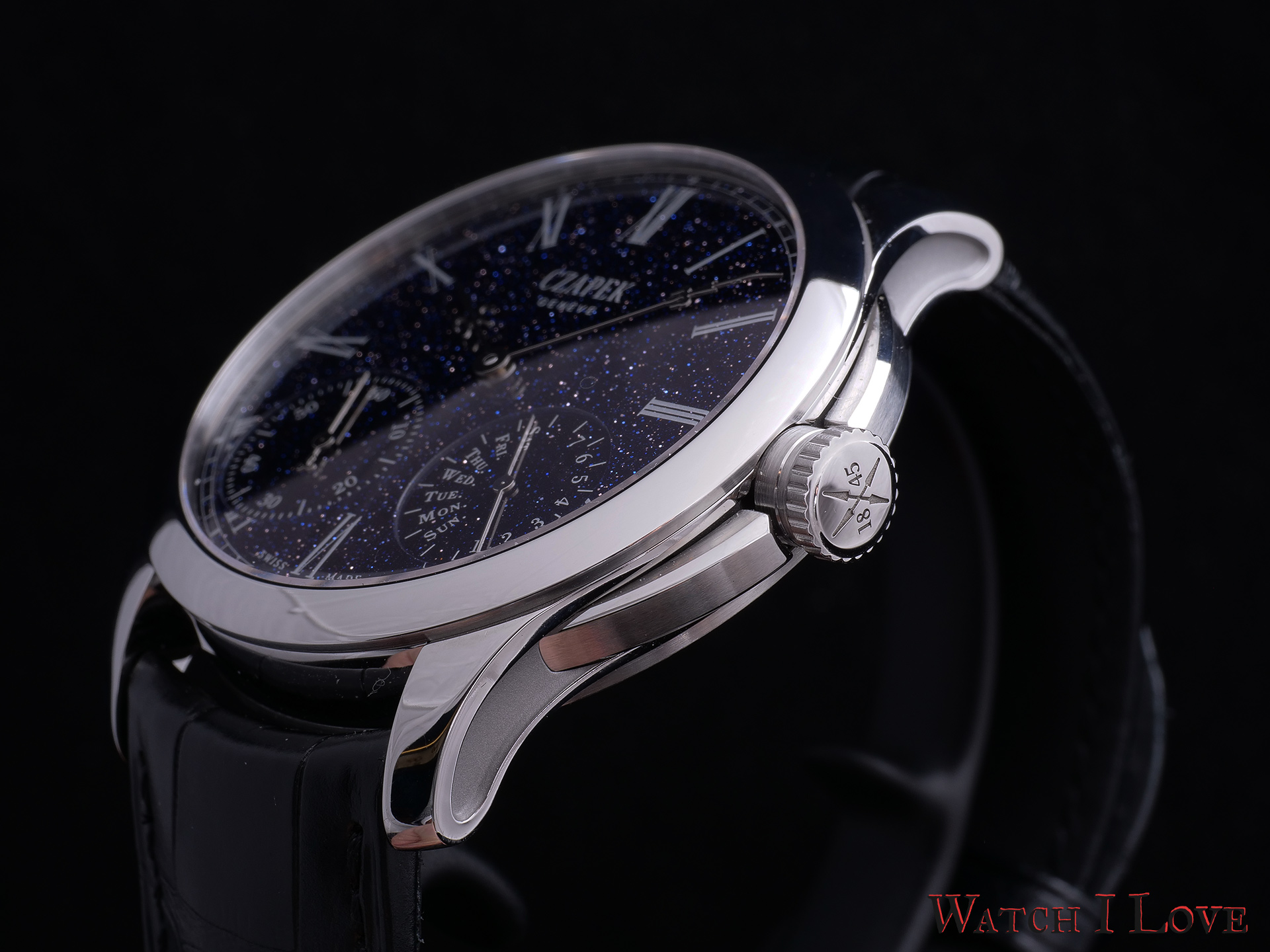 Coming back to the “Midnight in Geneva”, the watch wears its name with grace. That aventurine dial reminds me about the cold Geneva nights. Yet charming.