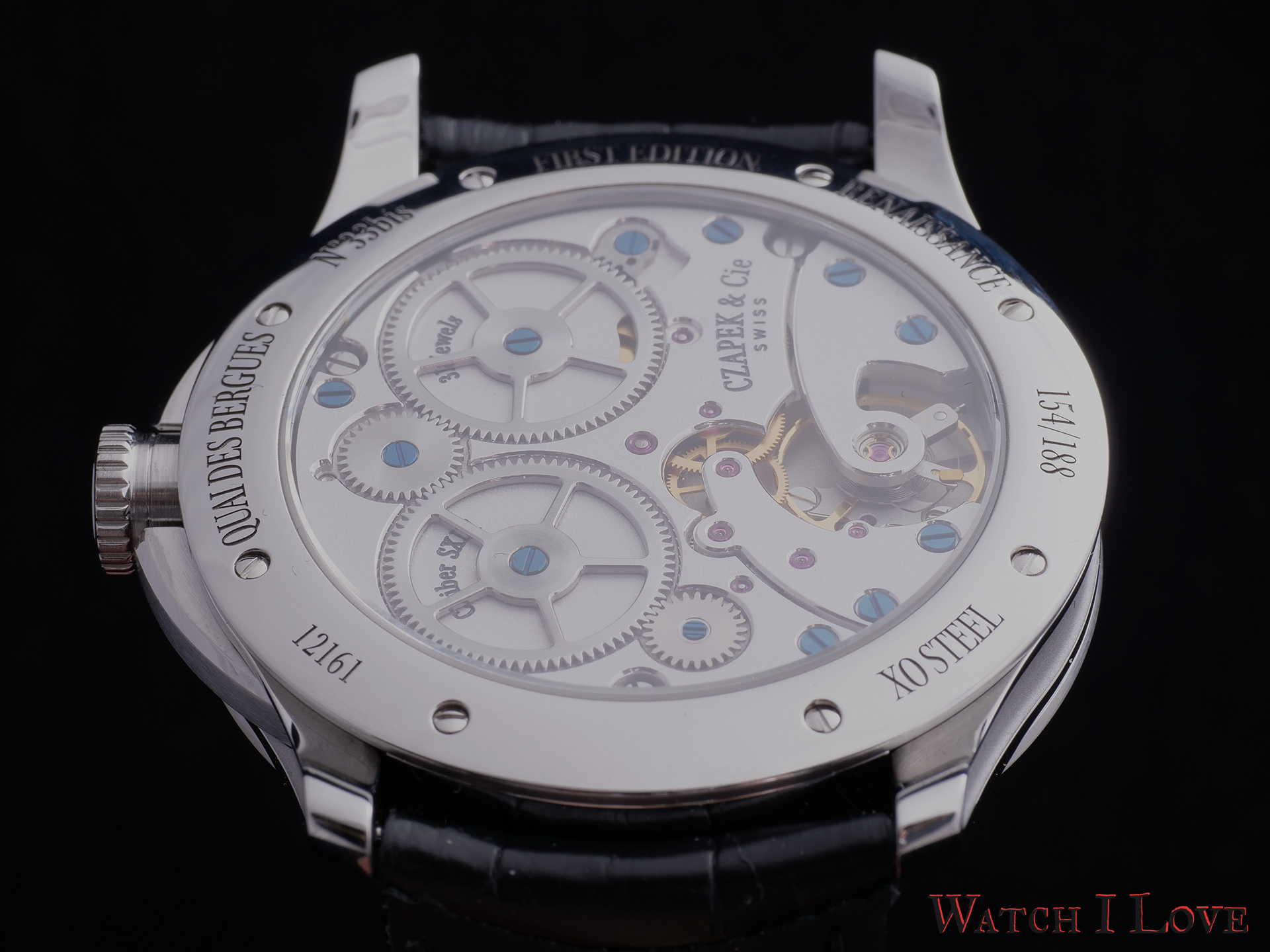 The interesting design of Quai de Bergues with two subdials, symmetrically placed on the lower side of the dial, was always a key signature. The innovative day/power reserve indication was for the first time present in the Czapek model No.3430.