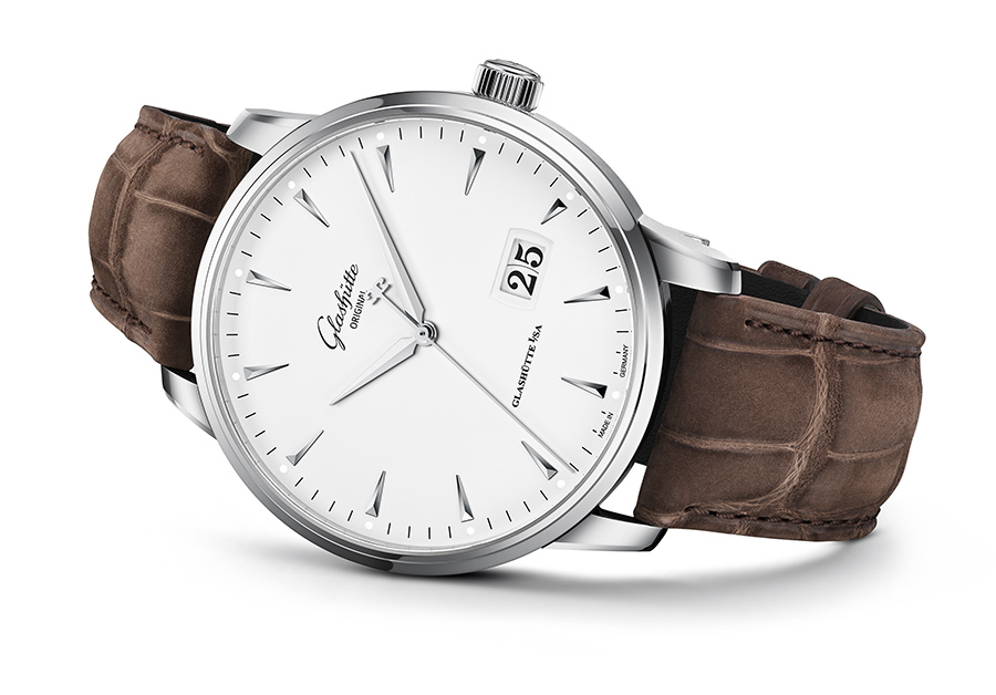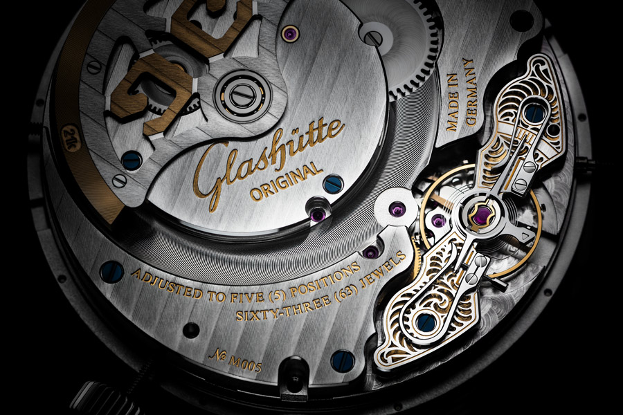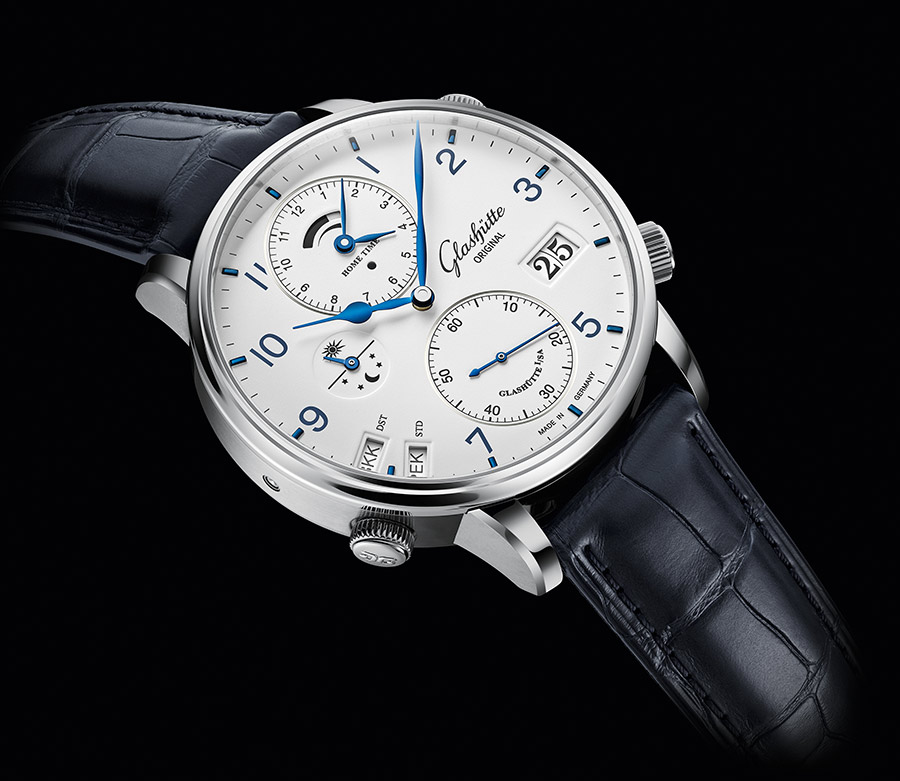Visually, this complex timepiece is also available, since 2018, in stainless steel and a reduced design. Dark blue and white form the predominant impression, with black details offering visual accents. The refined finishing of the sophisticated manufactory movement, including the elegant Glashütte stripe finish, hand-engraved balance bridge and blued screws, can be admired through a sapphire crystal case back.