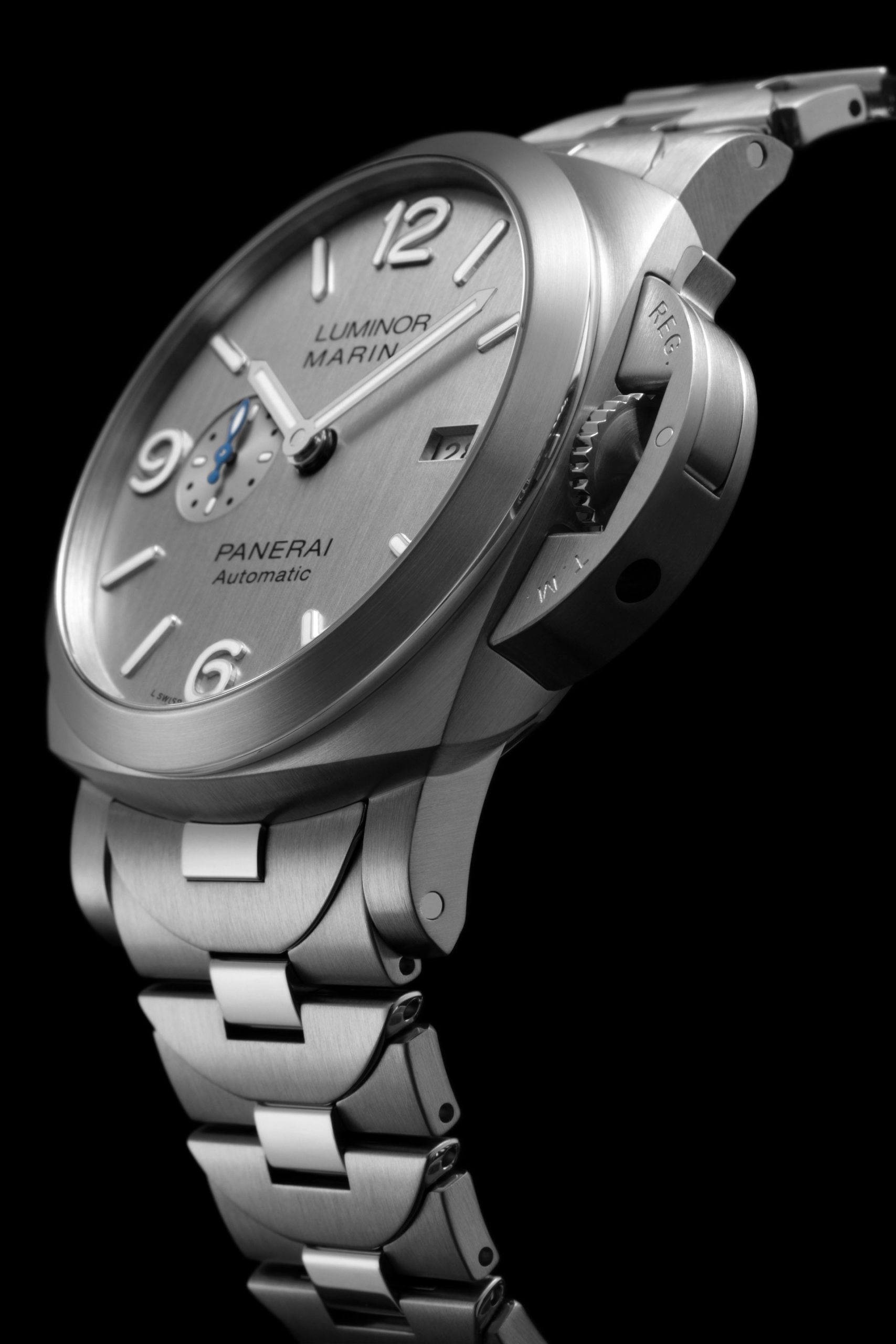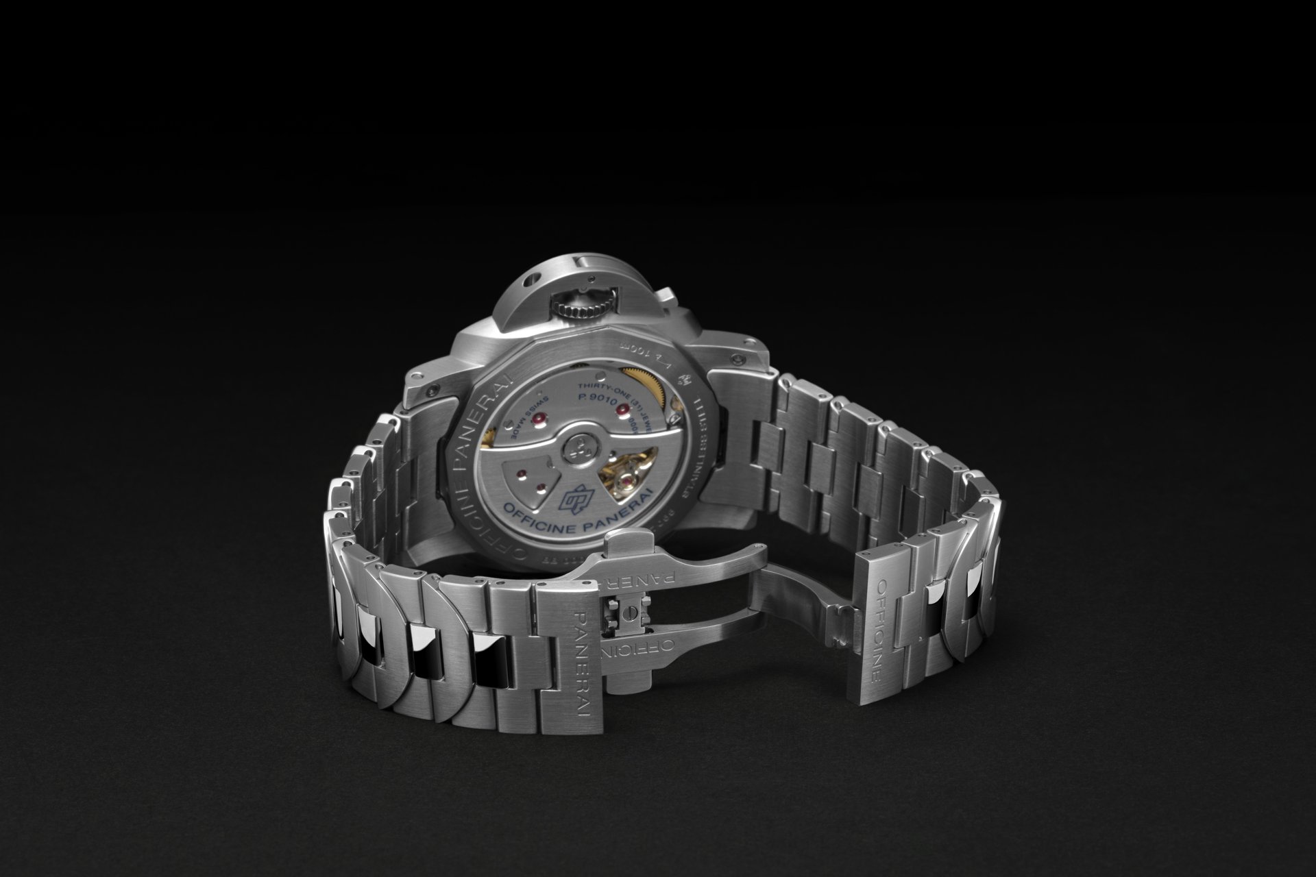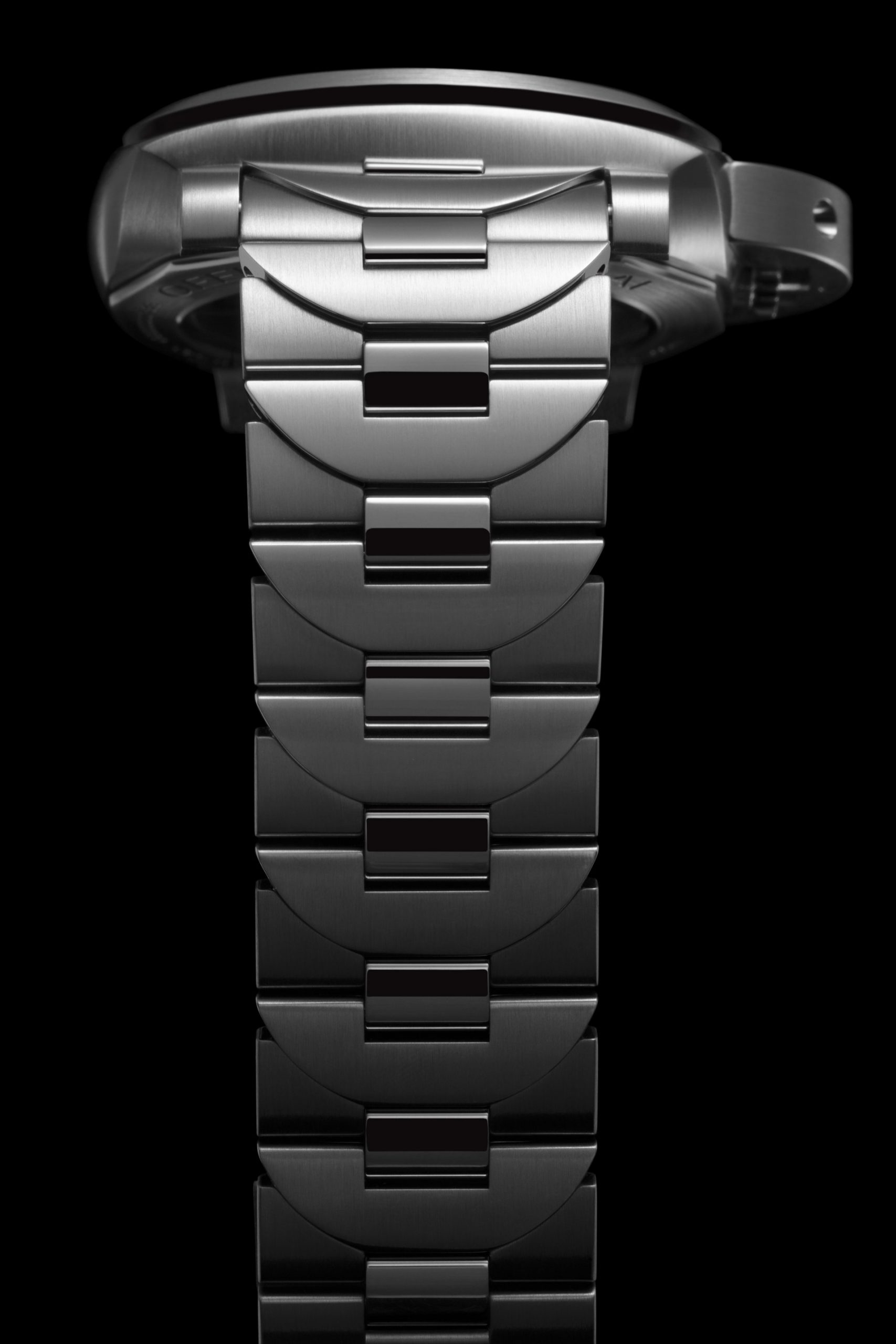 Panerai presents a new Luminor Marina fitted with a steel bracelet perfectly integrated with the case, the individual links being inspired by the iconic device for protecting the winding crown. The shape of each individual link recalls the iconic “bridge” device, and each one integrates perfectly with the rest – without any screws – forming a perfectly ergonomic bracelet which is flexible and pleasant on the wrist, being sporty but sophisticated in the design of its details and in the alternation of polished finish with brushed.