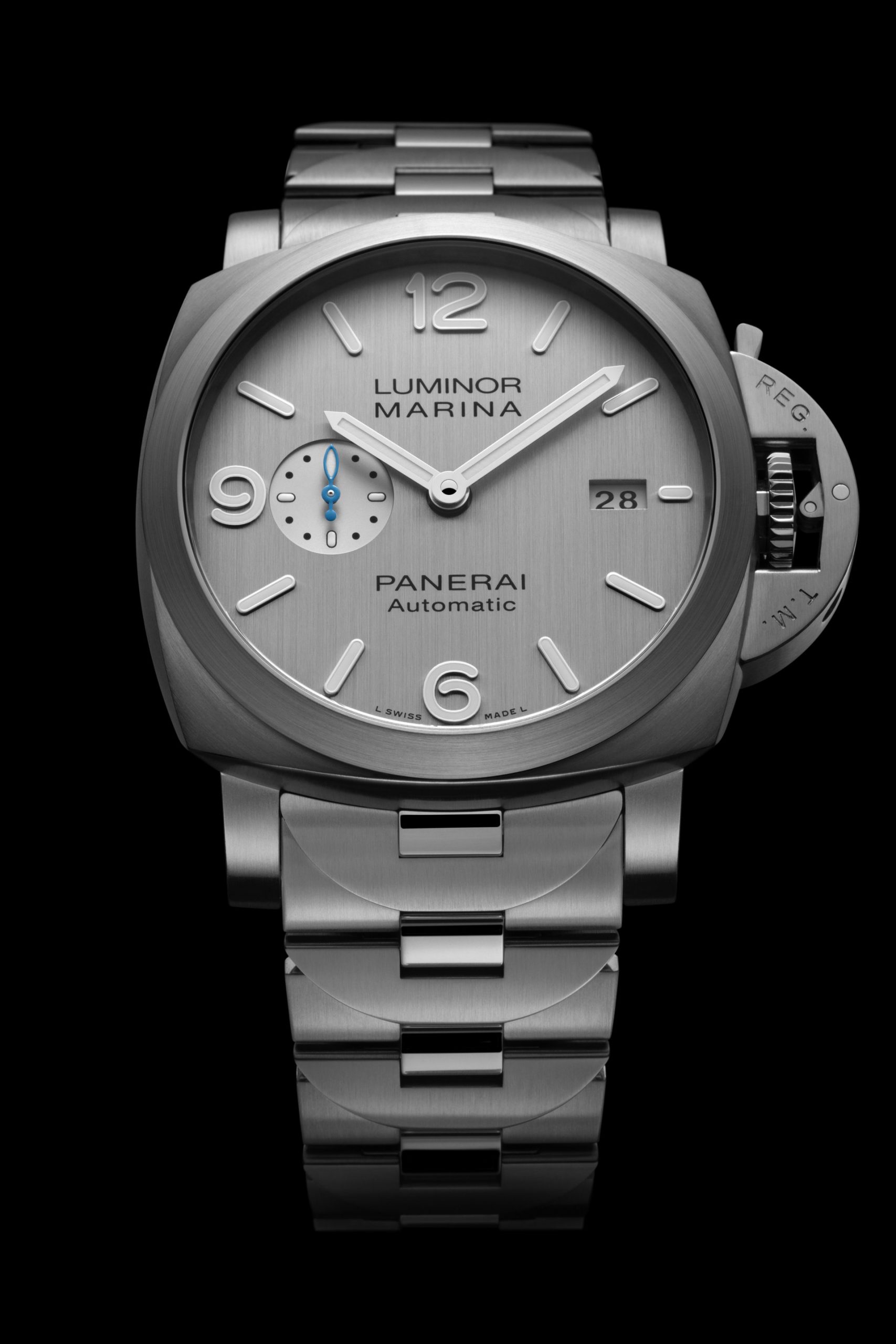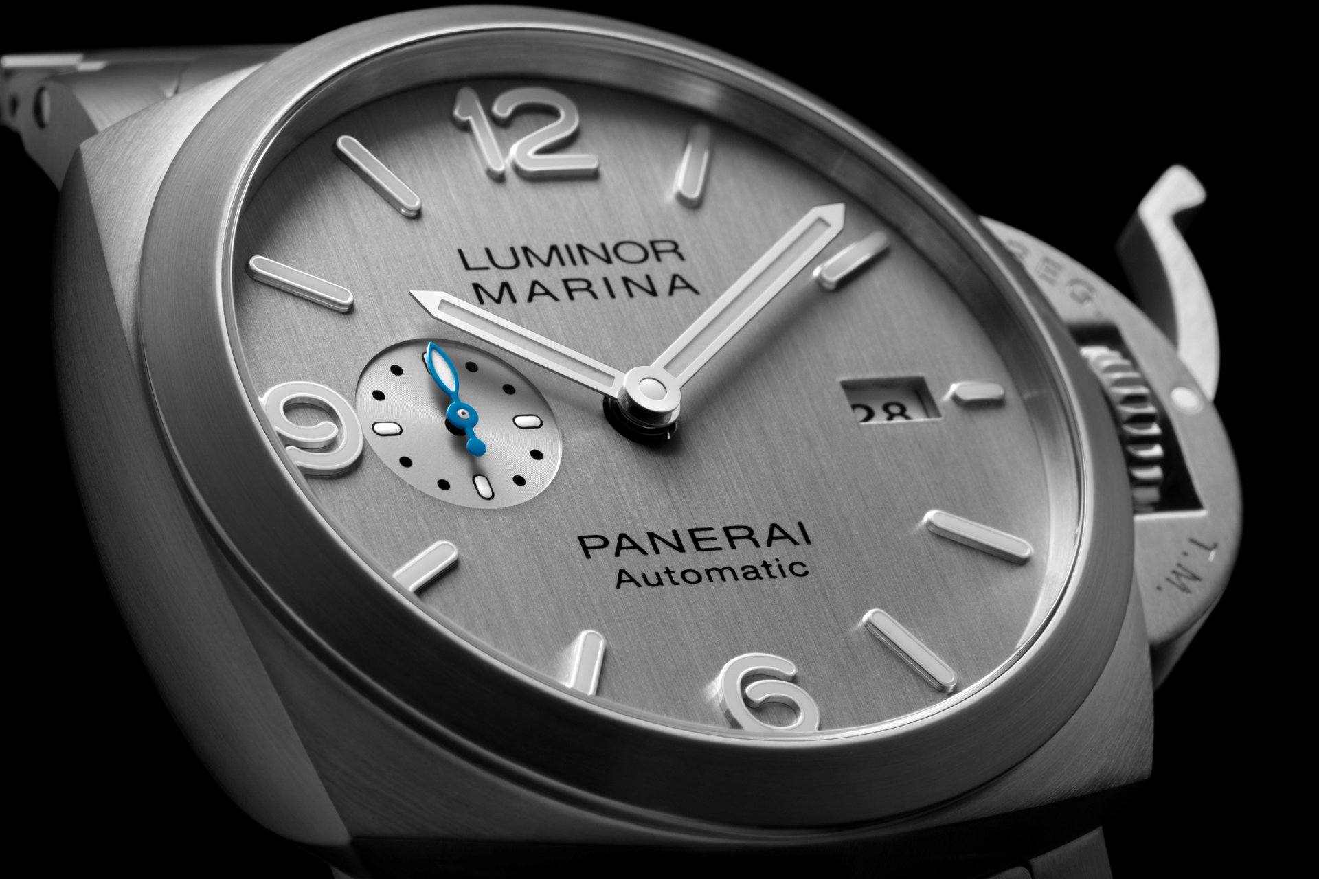 Available in sizes of 42 or 44 millimetres, the new Luminor Marina has a brand new silver-coloured dial, with a special brushed finish formed of vertical stripes, and large figures covered with white luminous material ensuring excellent visibility at night and underwater. Symmetrical with the date at 3 o’clock is the counter at 9 o’clock in which the blue small seconds hand rotates, blue being the colour of Panerai and the sea, the element with which the brand has always been historically linked.