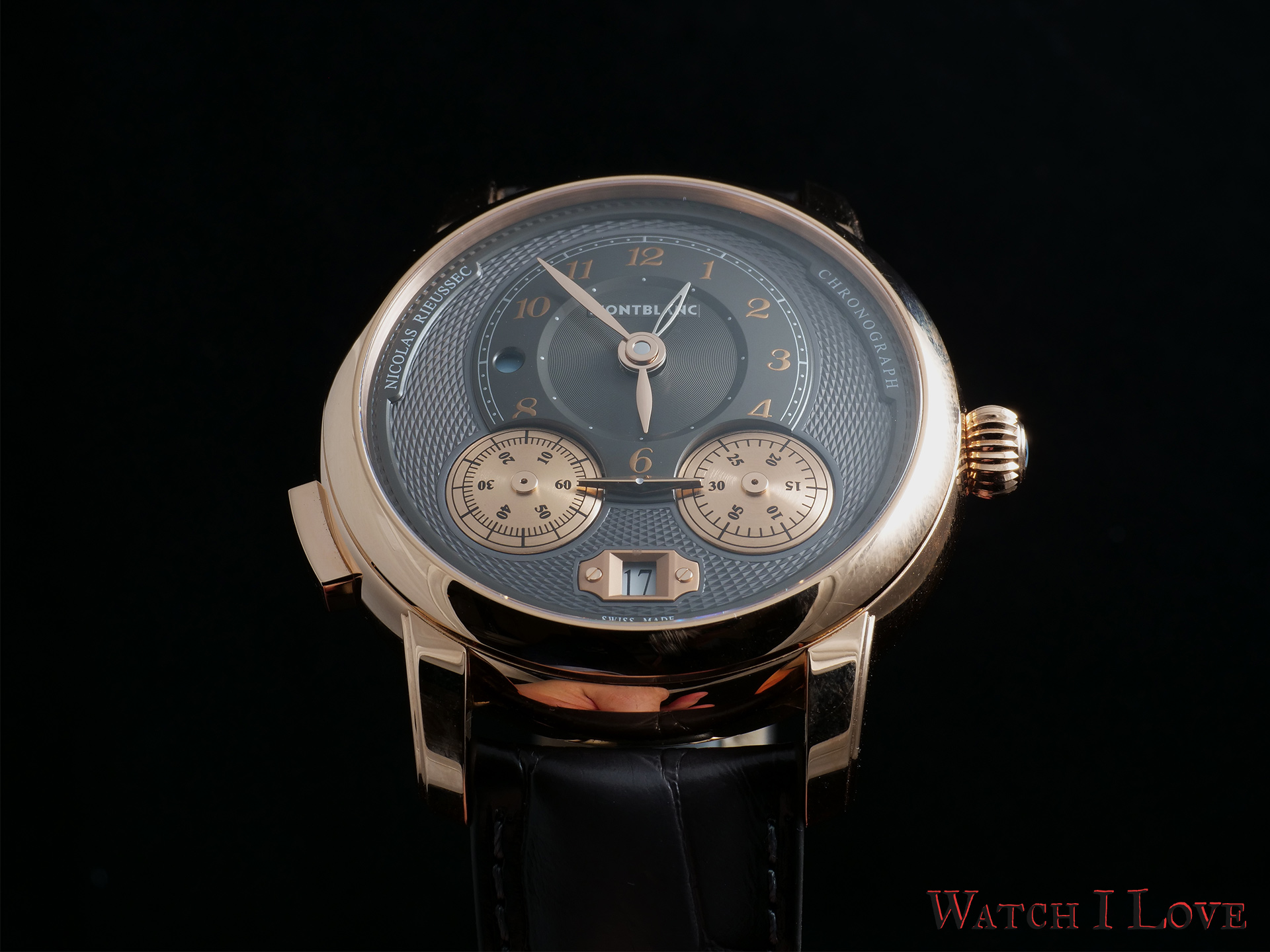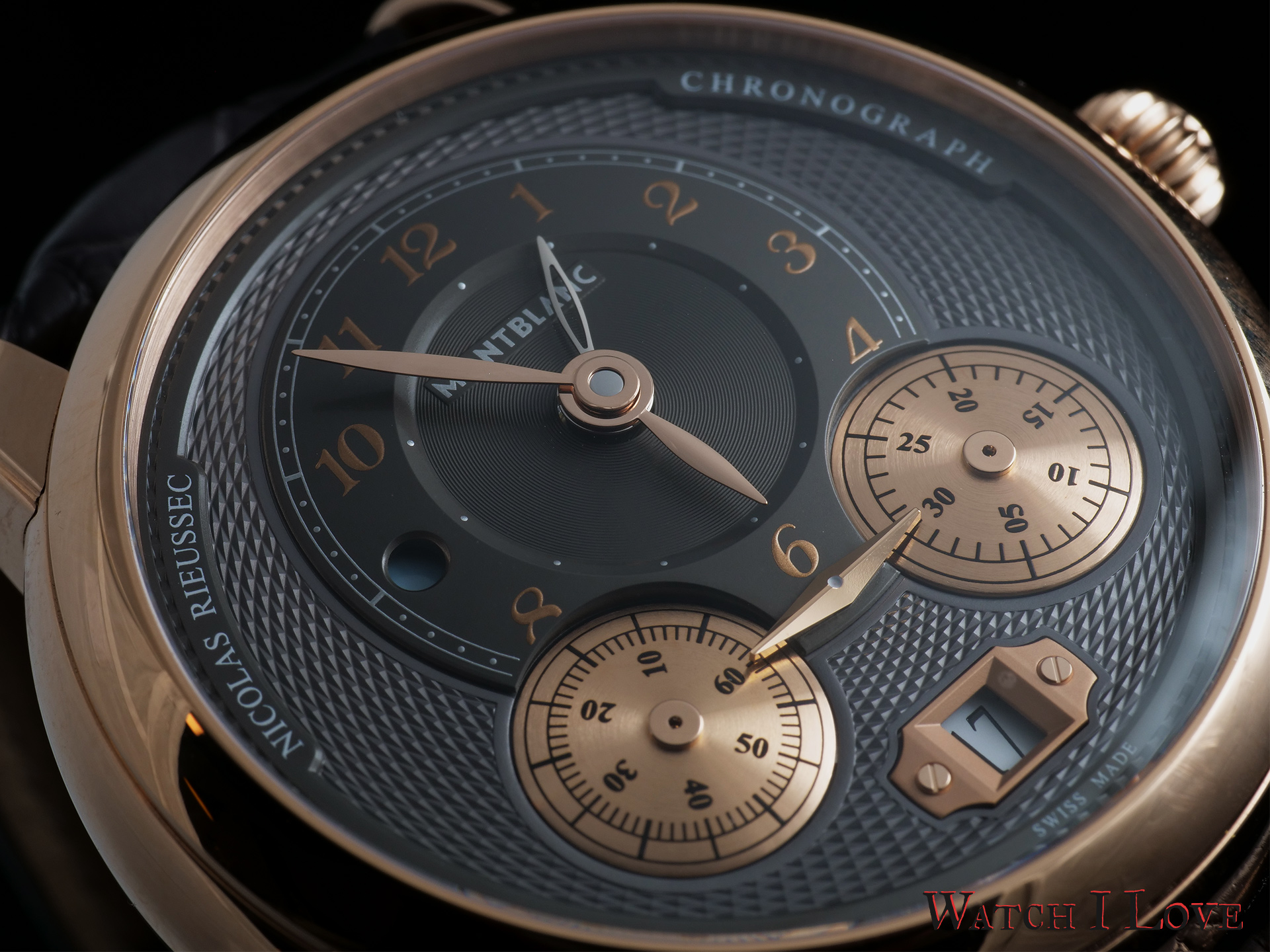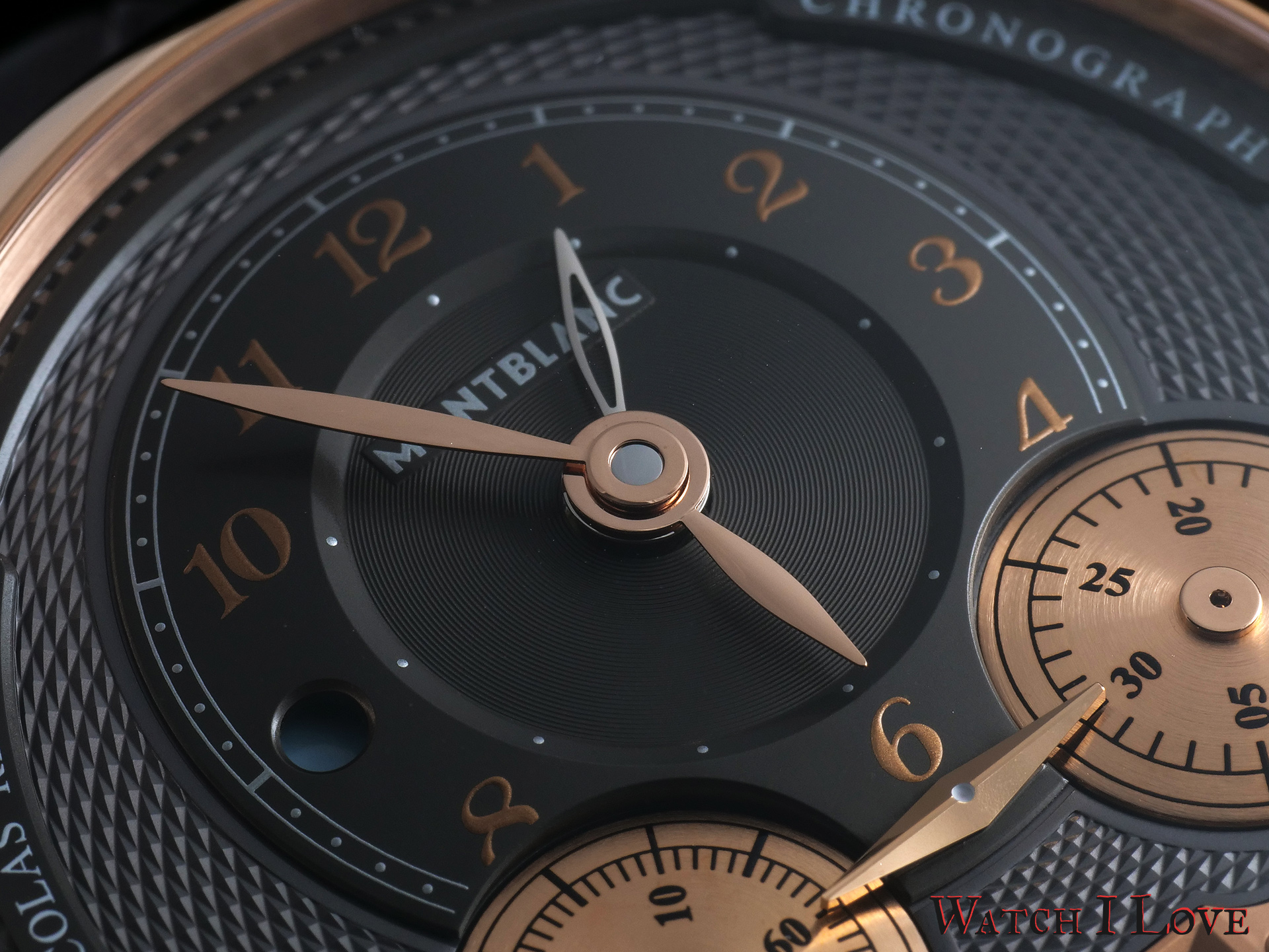 The chronometric function of the Montblanc Star Legacy Nicolas Rieussec Chronograph is ingeniously implemented. Instead of using hands on a fixed dial, the chrono uses two rotating discs. The indication is realised by a single raised rhombus shape placed between the two discs. The right disk is responsible for the 30 minutes counter. Note the cool mirror finish on the surfaces of the chrono’s three-dimensional rhombus.